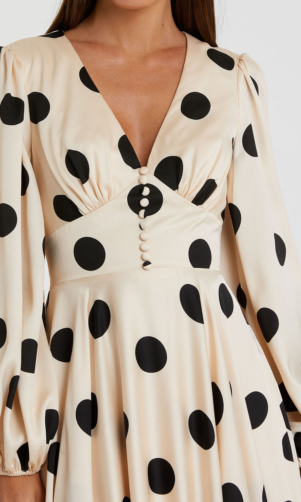 With a nostalgic nod to vintage aesthetics, Mac Duggal 27542 dress blends retro glamour with a refined, modern sensibility. Crafted in fluid charmeuse, this dress showcases bold oversized polka dots across a softly draped A-line silhouette. The deep V-neckline is complemented by a row of covered buttons and delicate ruching at the natural waist, creating a flattering and elongated shape. Full-length bishop sleeves add a touch of romance, balanced by the movement of the tea-length skirt. Mac Duggal 27542 creation reimagines timeless design with thoughtful, playful sophistication for events where personality matters. Model is wearing Cream Black color.