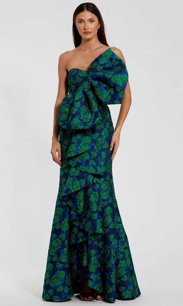 Transform your ideal day into a splendid promise of an ever lasting love with this Mac Duggal 27593, featuring a sleek bodice and a strapless neckline for a refined look. The back zipper ensures a secure fit, while the floor-length overskirt showcases a dramatic mermaid silhouette. Ruffle detailing and an oversized bow add a touch of elegance and flair to the design. Perfect for formal occasions, this Mac Duggal 27593 combines timeless sophistication with bold, standout elements for a truly unforgettable ensemble. Model is wearing Emerald Multi color.
