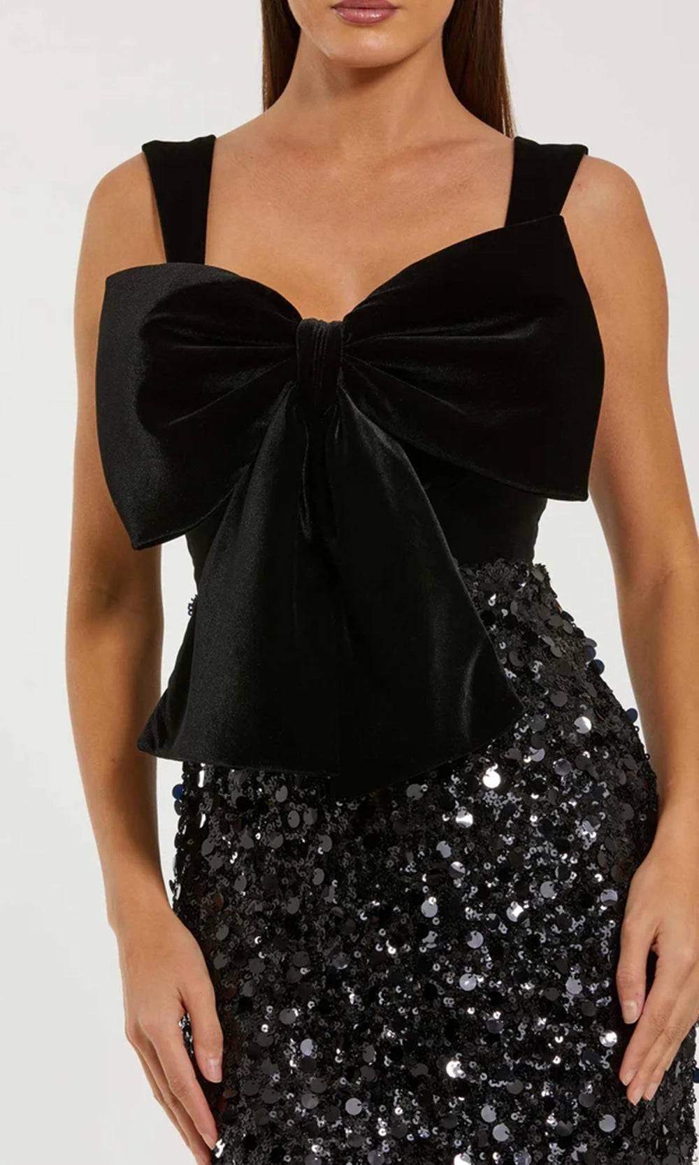 | Details: | Wide Straps, Oversized Bow Detail, Paillette Sequins, Square Back, Concealed Back Zipper |