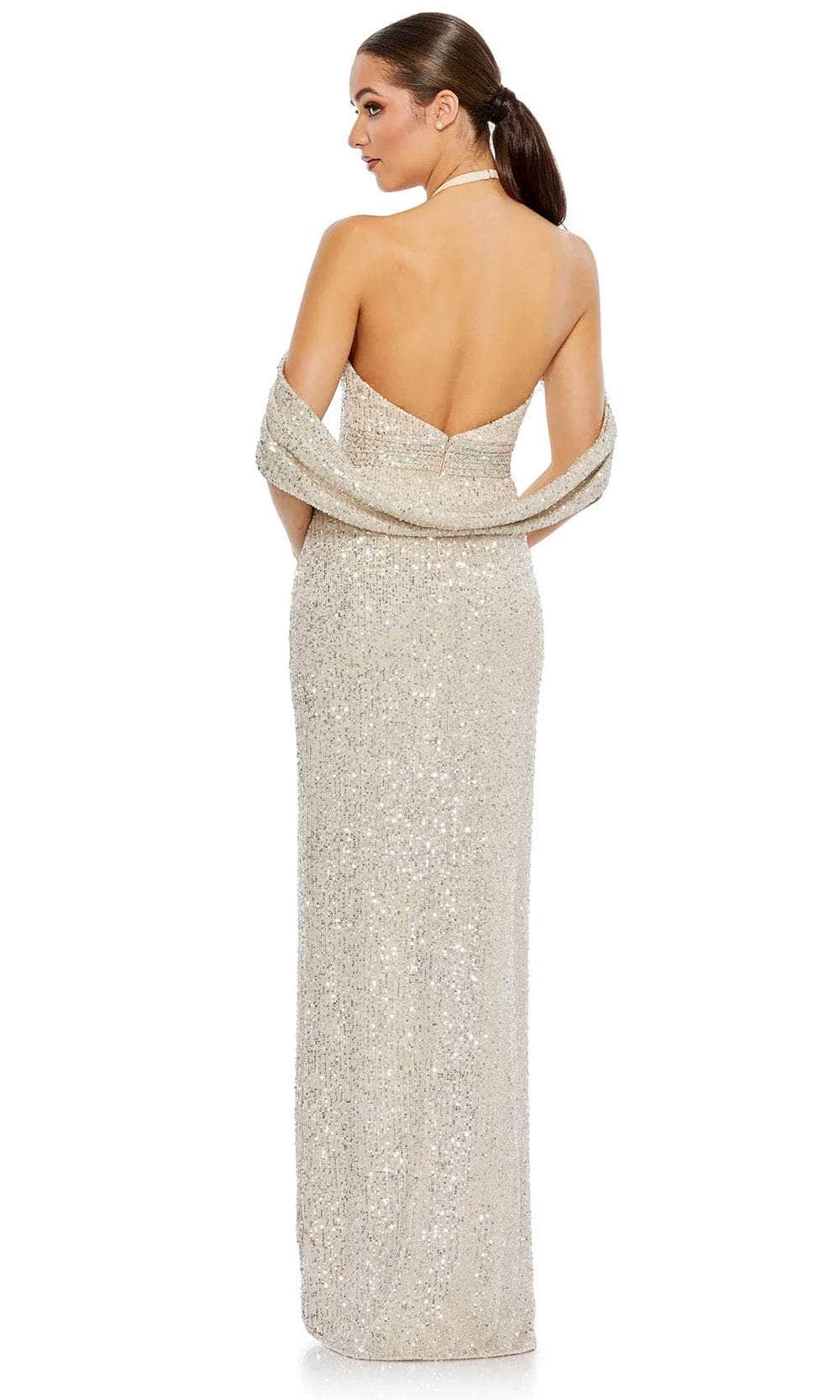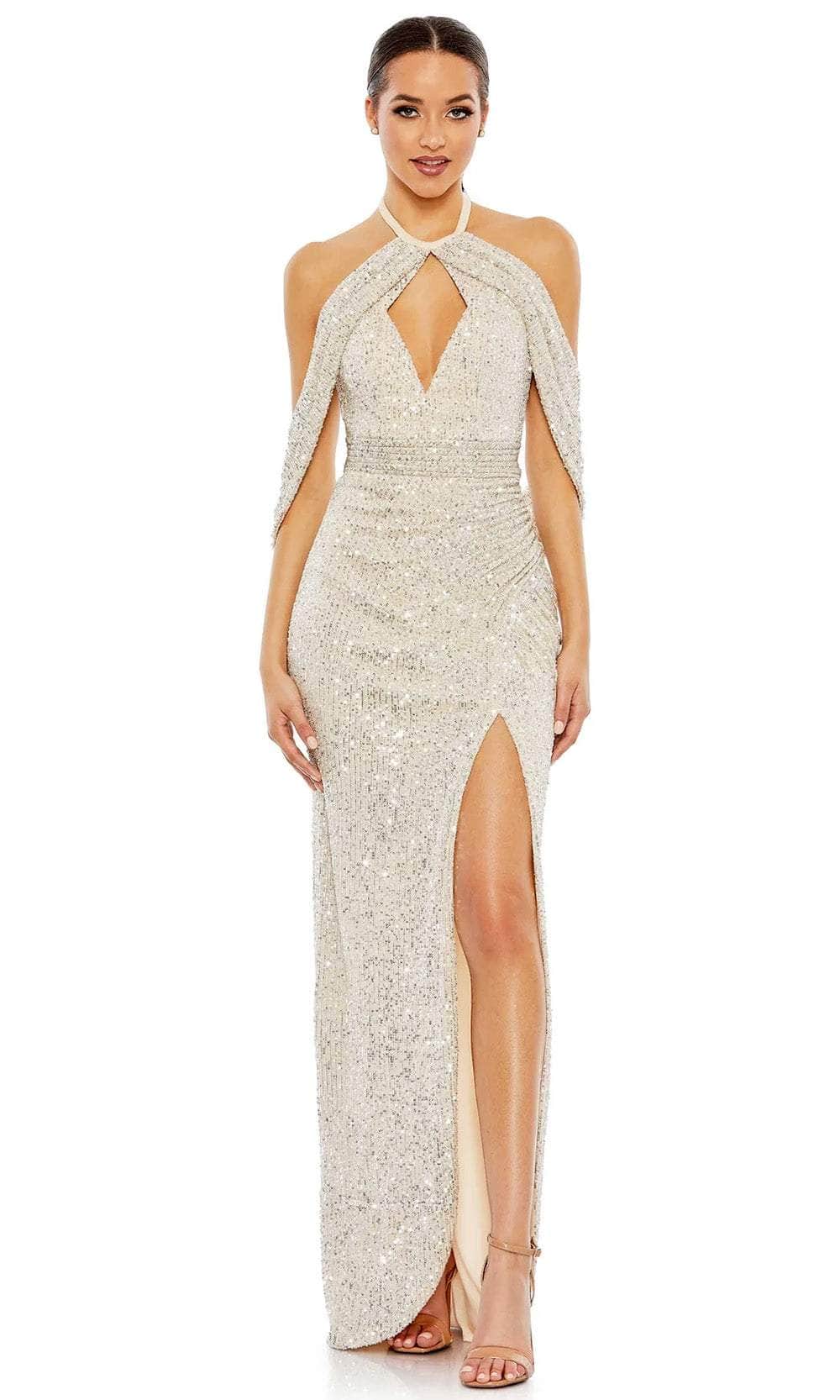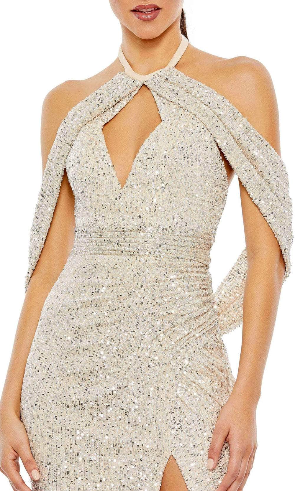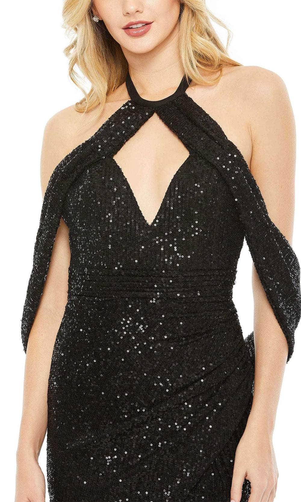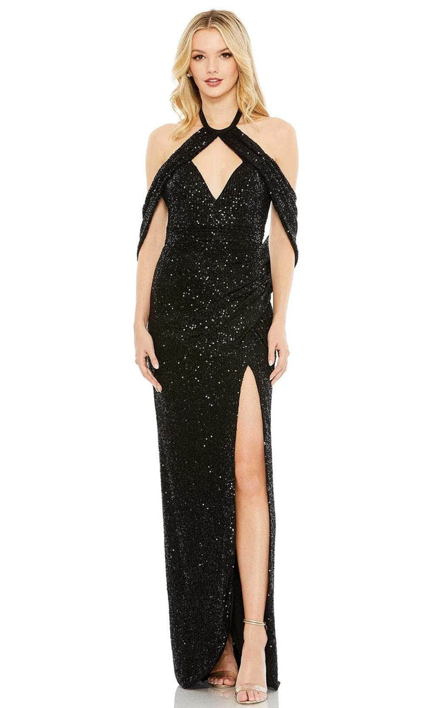 Watch the torrent of people stare at you in this Mac Duggal 42021 gown. Impeccably tailored lines embrace and enhance the feminine form, while the exquisite sequin fabric bestows a radiant allure. The halter neckline features a diamond-cutout bodice, gracefully complemented by a draped cold-shoulder detail, leading to a midrise back secured by a concealed zipper closure. A cowl detail and a ruched waist add tasteful intricacies to this opulent ensemble. The sheath skirt, culminating in a side slit, descends to a floor-length hem. Take the spot on the best dressed list in this alluring Mac Duggal 42021 masterpiece. Models are wearing the Nude Silver and Black colors.