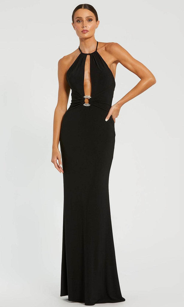 Make a striking impression in Mac Duggal 42065, a high-neck cutout gown designed to captivate. Crafted from luxurious jersey fabric, this sleeveless dress features a keyhole detail and a fitted bodice that flatters the silhouette. The open back adds a touch of allure, creating a modern and sophisticated look. Secured with a back zipper closure, Mac Duggal 42065 ensures a seamless fit, making it the perfect choice for those seeking a chic and contemporary ensemble for special occasions. Model is wearing Black color.