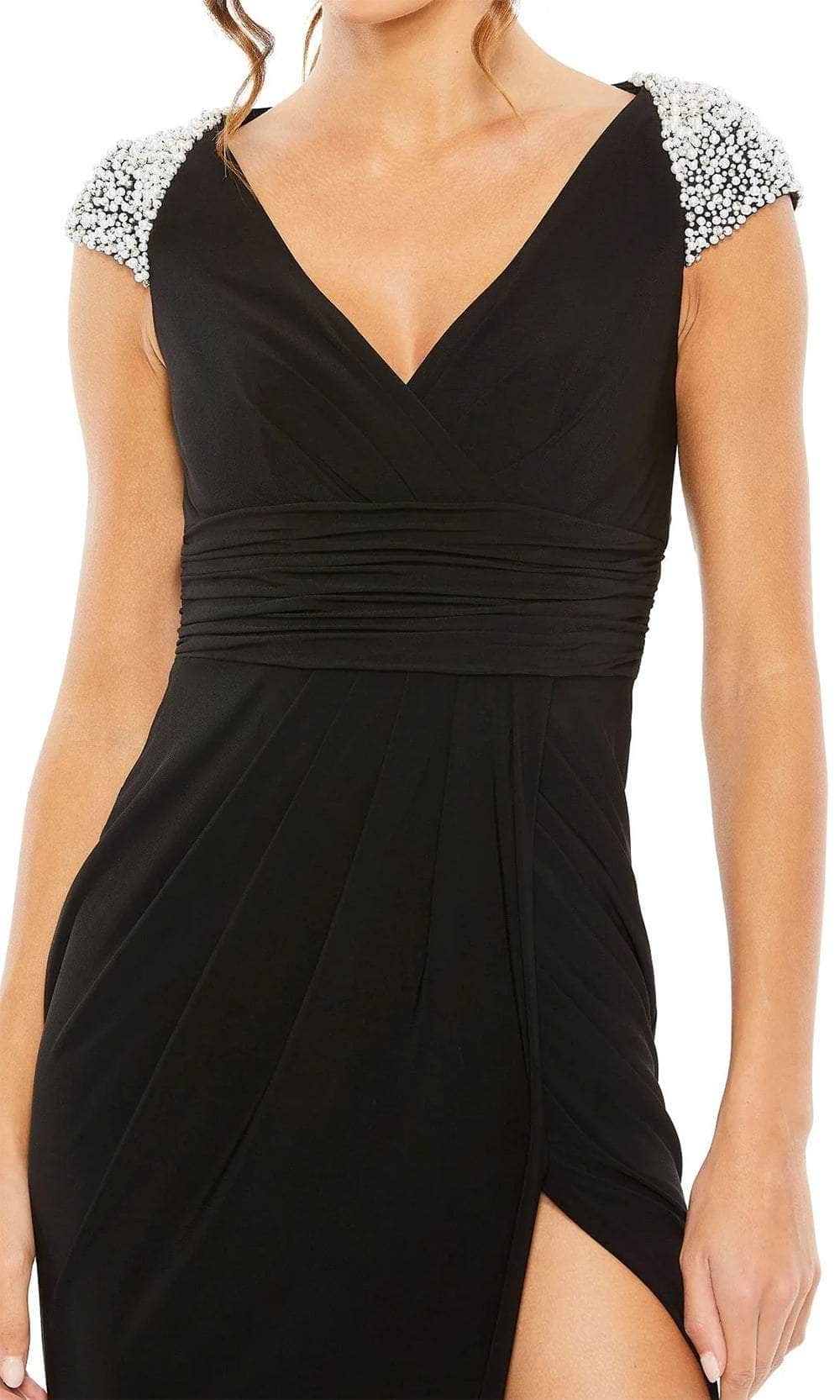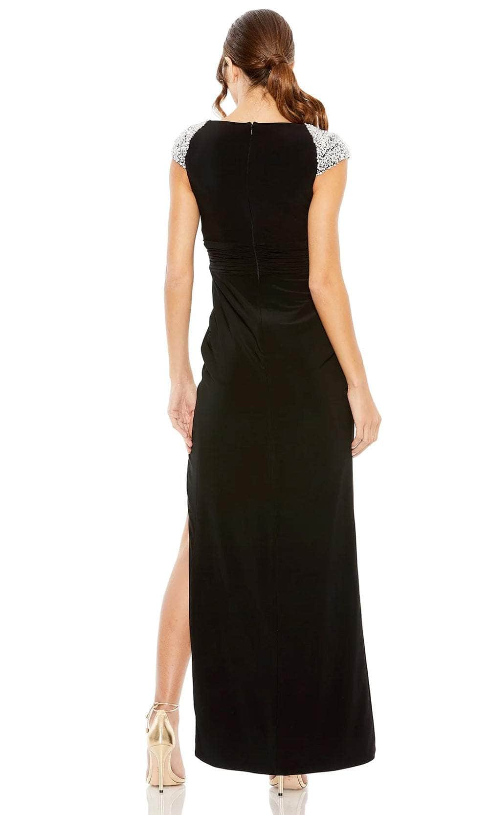 Command the spotlight and shine with timeless allure in the Mac Duggal 42069 masterpiece. This captivating evening dress flatters the figure with a ruched jersey silhouette. The v-neckline adds a touch of sophistication, while the embellished cap sleeves offer a hint of regal detail. This gown cascades into a dramatic high-slit on the sophisticated sheath silhouette. Leave a lasting impression of sophisticated elegance and stunning flair in this Mac Duggal 42069 masterpiece. Model is wearing the Black color.