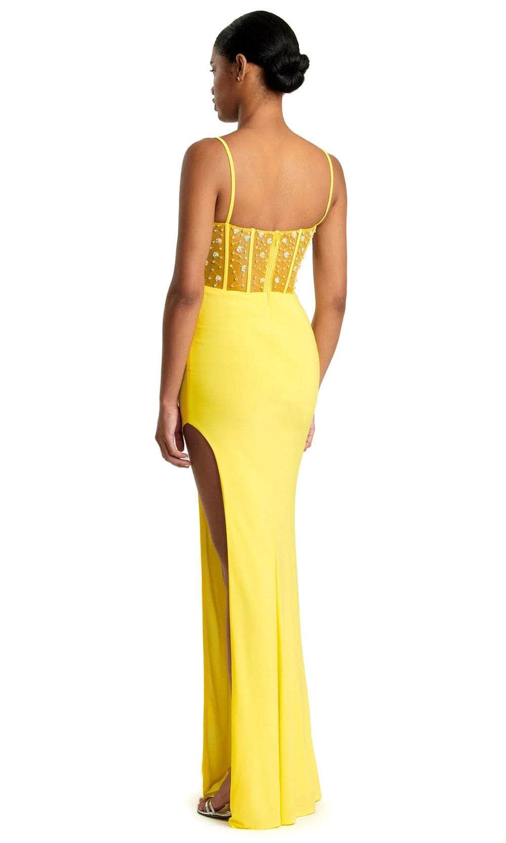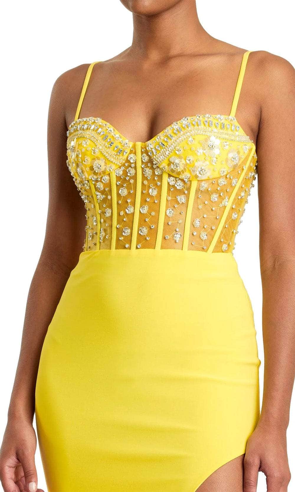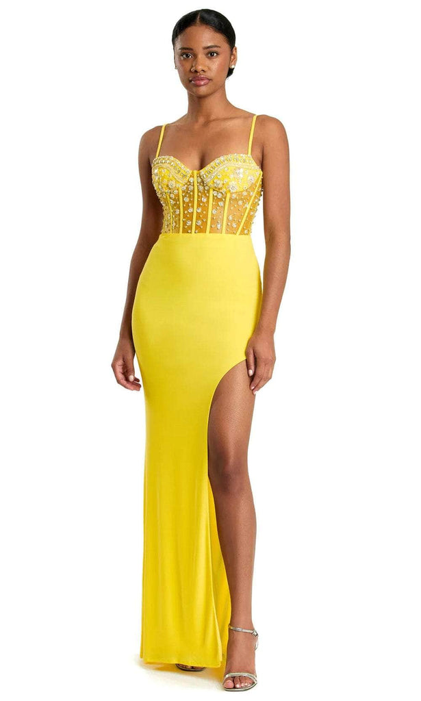Look effortlessly stylish in this Mac Duggal 44029, impeccably tailored from jersey fabric. The sleeveless sheer corset bodice, adorned with beads and supported by delicate spaghetti straps, features a captivating sweetheart neckline. A concealed center zipper closure ensures a secure fit. Below, the floor-length skirt cascades in a sleek sheath silhouette, accentuated by a daring high slit. Elevate your allure with Mac Duggal 44029, a vision of timeless elegance and modern sophistication. Model is wearing Lemon color.