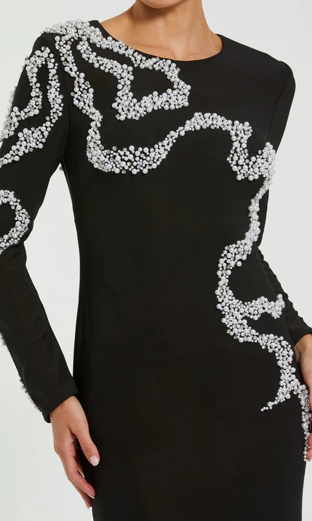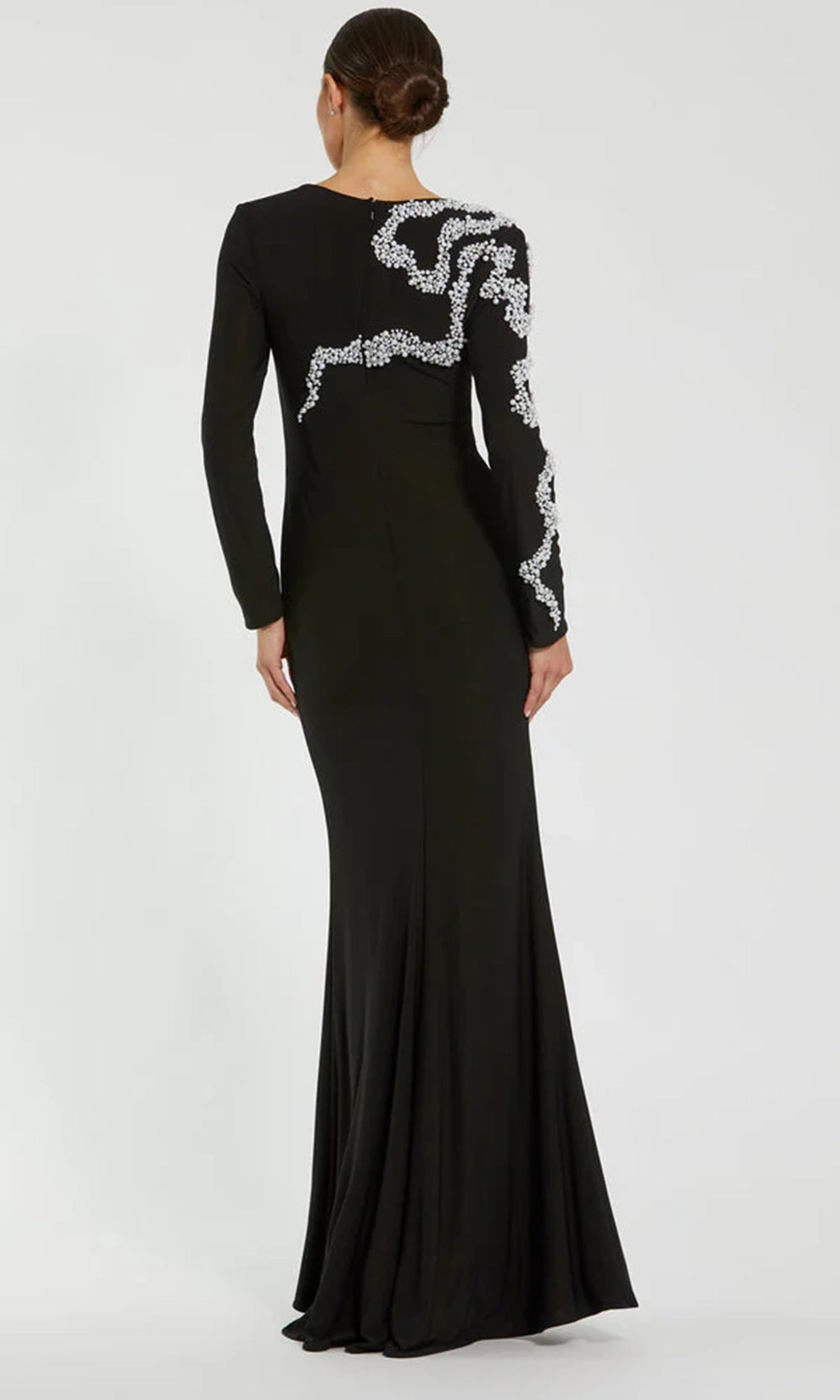 | Details: | Beaded Swirl Detail, Long Sleeves, Full Back, Concealed Back Zipper, Fitted |