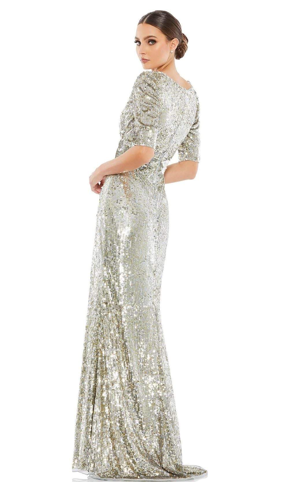 Go beyond beauty in a galactic evening gown in Mac Duggal 4707. This full length gown is decked out in dual-toned sequins throughout the fit and flare silhouette. The bodice features a plunging v-neckline and lightly puffed quester blouson sleeves. This Mac Duggal evening gown will not let anyone miss your grand entrance.