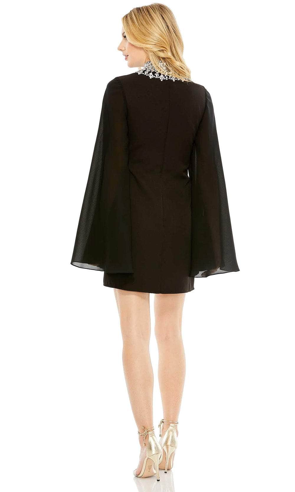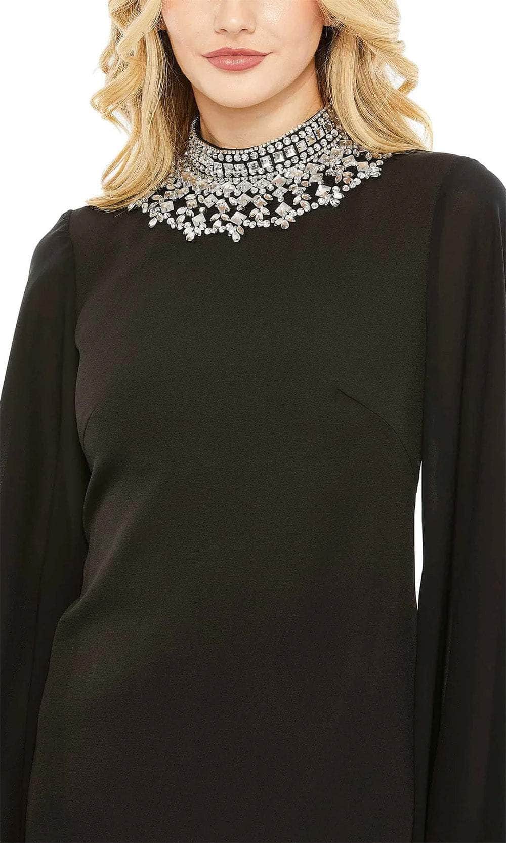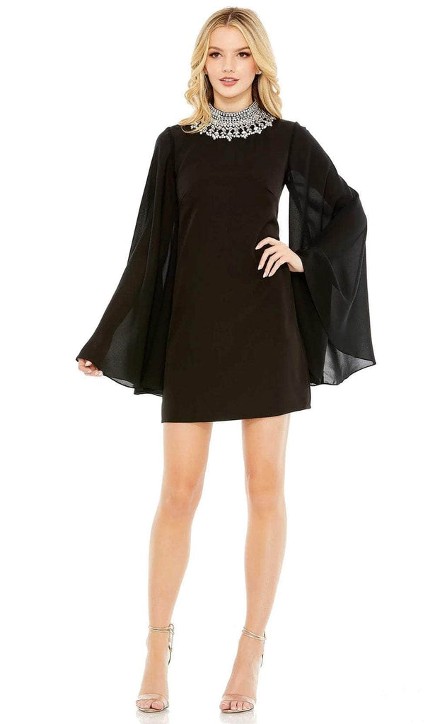 Unveil your timeless beauty in this Mac Duggal 49607 cocktail dress. With its glistening rhinestone collar, this dress creates an irresistible glamour that is sure to make heads turn. The long kimono sleeves add a touch of drama, while the high neckline and closed back exude an aura of elegance. Falling gracefully to a mid-thigh hem, the sheath skirt heightens your curves and allows you to display your sexy legs. This Mac Duggal 49607 creation is an instant refresh for your eveningwear repertoire. Model is wearing Black color.