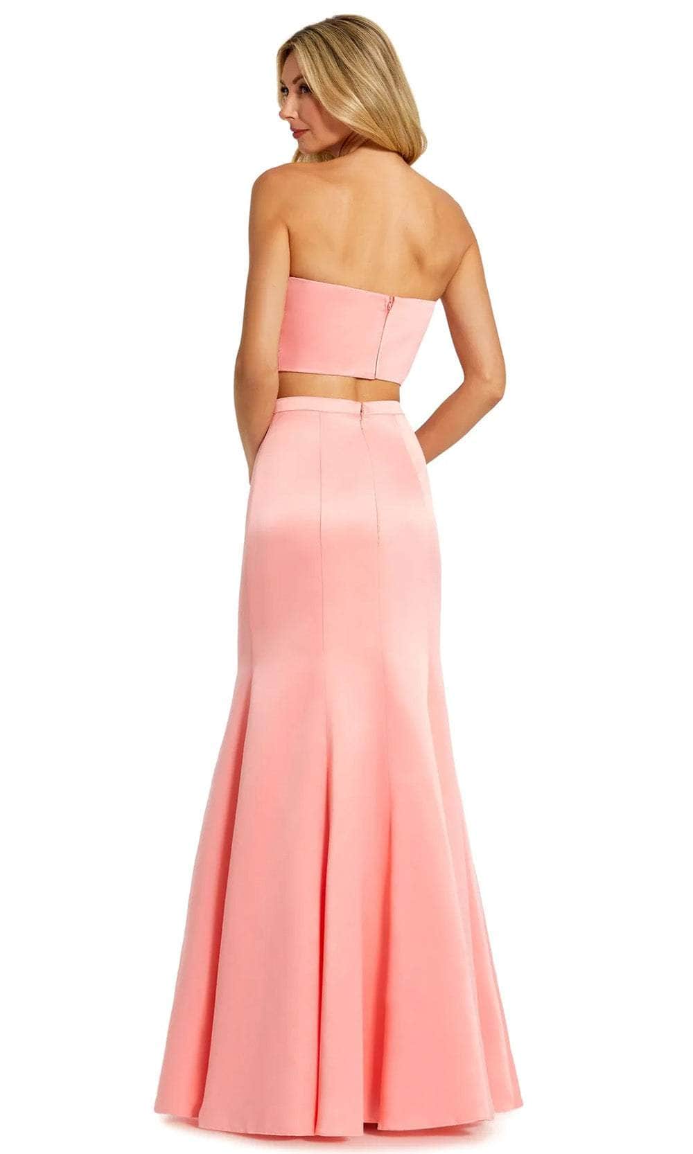 Achieve the picture-perfect prom look with this Mac Duggal 49832 creation. Fascinating in a two-piece set, the dress exudes timeless beauty and poise. The strapless crop top bodice offers a sweetheart neckline, midrise zipped-up closure, and ruching with a sweet bow detail. Splendidly sculpted with seams to heighten your shape, the high waist skirt flares a beautiful mermaid silhouette that smoothly trickles to the full-length hemline. Fall in love when you slip on this Mac Duggal 49832 masterpiece. Model is wearing Petal Pink color.