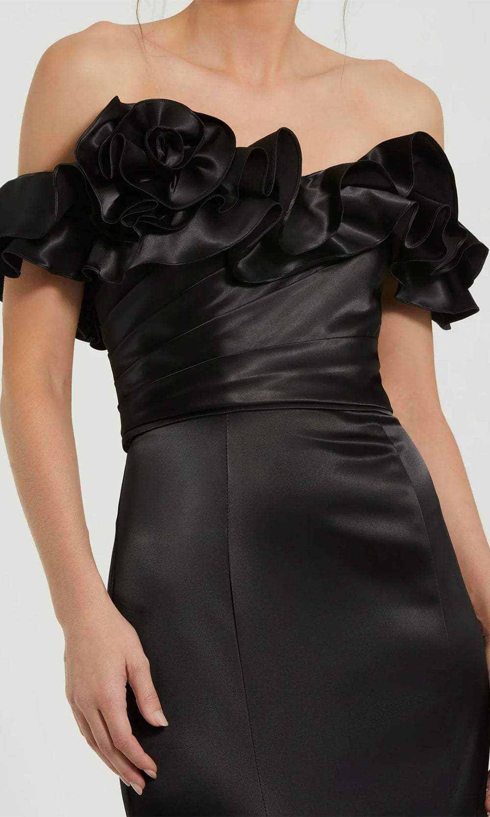 Strut your stuff on the red carpet in this Mac Duggal 49834 masterpiece. The dress boasts asymmetric pleats on top and ruffle-trimmed on the off-shoulder neckline, creating a stylish and show-stopping look. Additionally, it displays cap sleeves and a sexy open back with a concealed zipper closure. The mermaid skirt is designed with sculpted seams to enhance its shape and has a godet accent for extra volume. Embrace timeless elegance with this Mac Duggal 49834 dress. Model is wearing Black color.