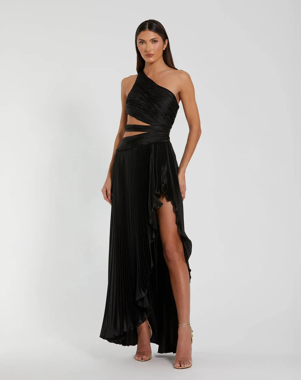 | Details: | Sleeveless, Ruching, Side Cutouts, Ruffled Trims, High Low Design, Full Length Hem |