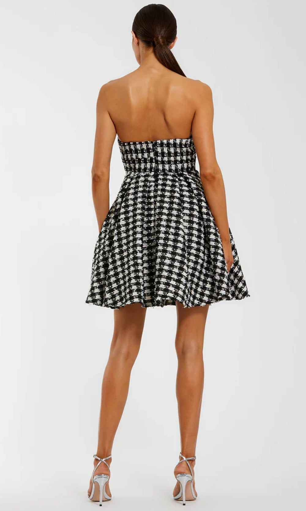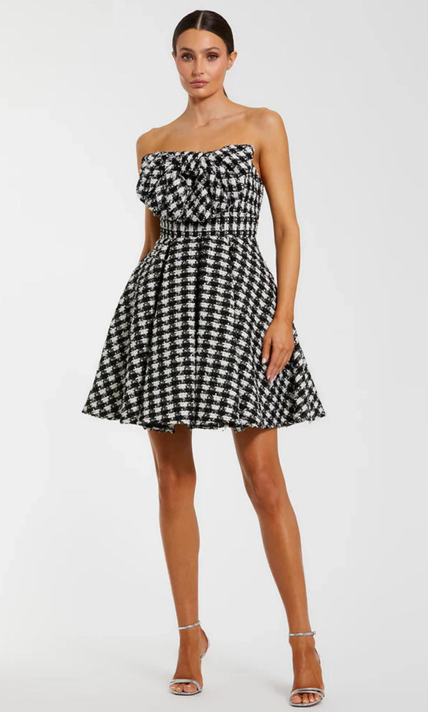 | Details: | Strapless, Statement Front Bow, Houndstooth Pattern, Open Back, Concealed Back Zipper |