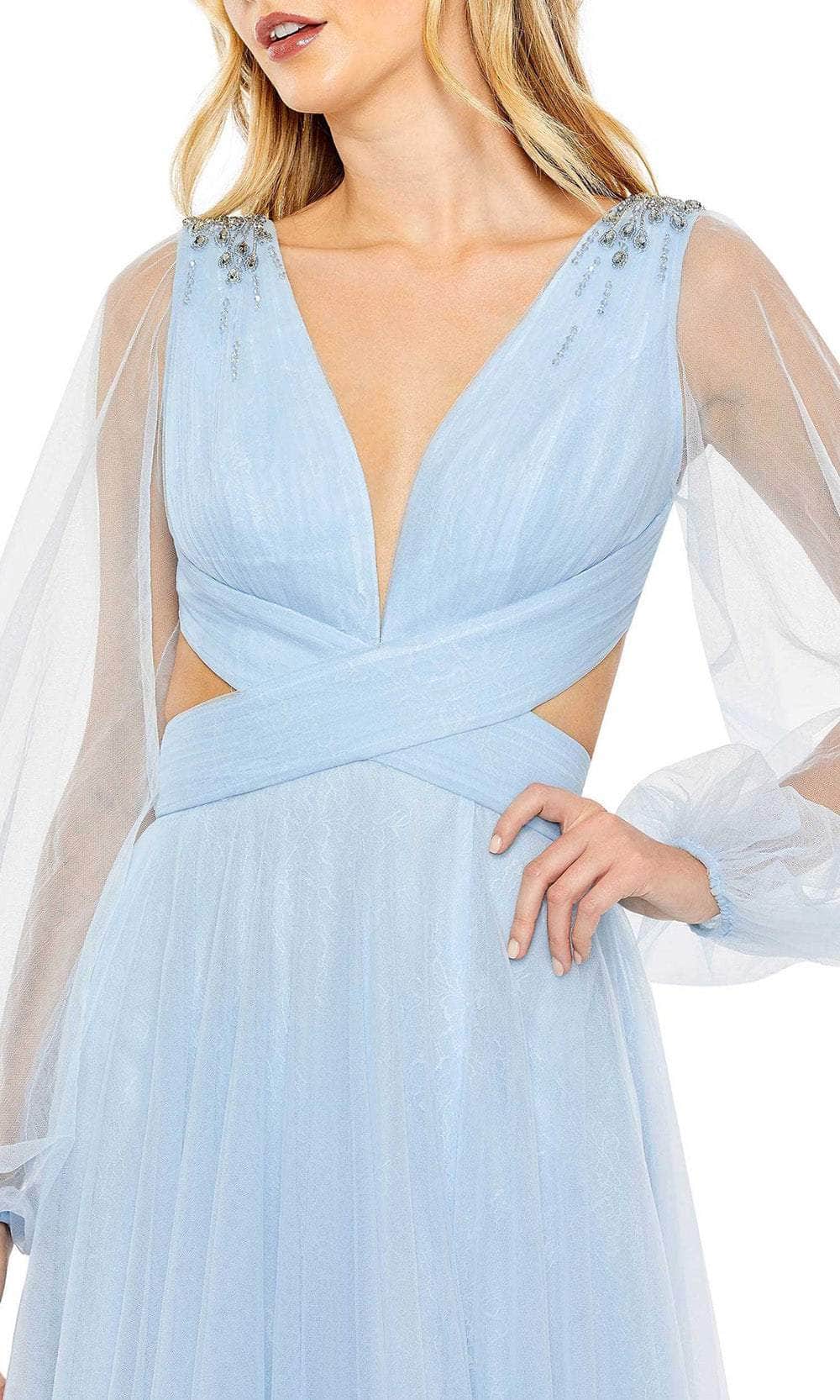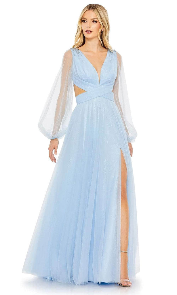 Make a jaw-dropping entrance in this Mac Duggal 50662 masterpiece. This ensemble displays bishop illusion sleeves, a plunging v-neckline and a crisscross waistband, perfectly accentuating your feminine allure. The enticing cutout details on the side waist extend to the strappy lace-up back. The beaded detailing on the shoulders adds a right amount of sparkle and extravagance. To complete the look, the skirt flares a full-length A-line silhouette with a dramatic sweep train and thigh-high leg slit. Everyone will be in awe of your timeless beauty when you wear this Mac Duggal 50662 dress. Model is wearing Ice Blue color.