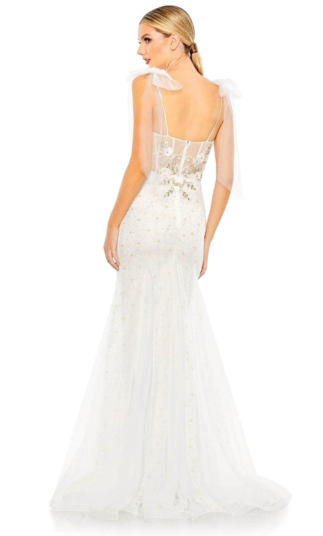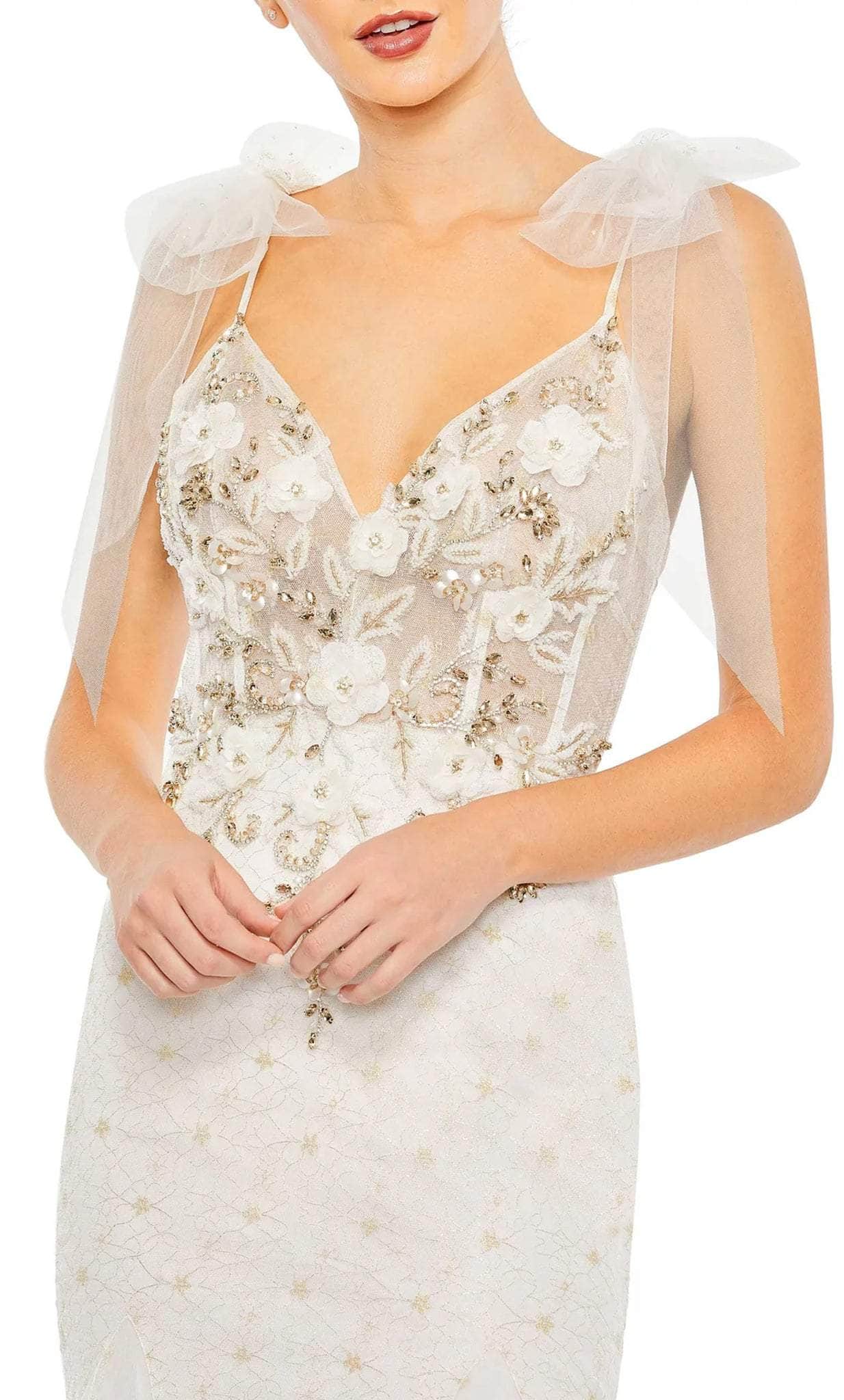Bring forth your inner fashionista with this absolutely flawless design by Mac Duggal 50666. This lovely dress is a stunner thanks to its exquisite tailoring and luxurious fabric detailed with rhinestone-dotted shoulder bows and botanical embroidery. Features a V-neckline supported by two and corset boned bodice. The zipper at the back ensures a smooth and comfortable fit, while the trumpet silhouette highlights your curvy figure. This dress, with its modest train, will leave them speechless. Show off your style with this magnificent creation by Mac Duggal 50666. Model is wearing the White/Gold color.