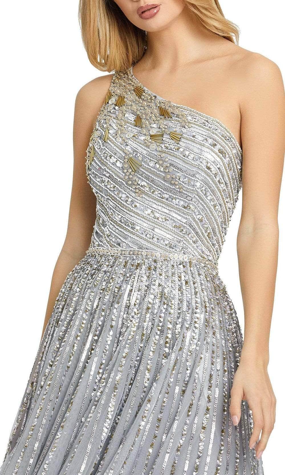 Promote attention-grabbing style in this stunning gown from Mac Duggal 5220. This lavishly embellished gown shows off a sleeveless, asymmetric neckline with a fitted bodice and a back zipper closure. The skirt is tailored in a full-length A-line silhouette. This Mac Duggal dress is perfect for any formal evening.