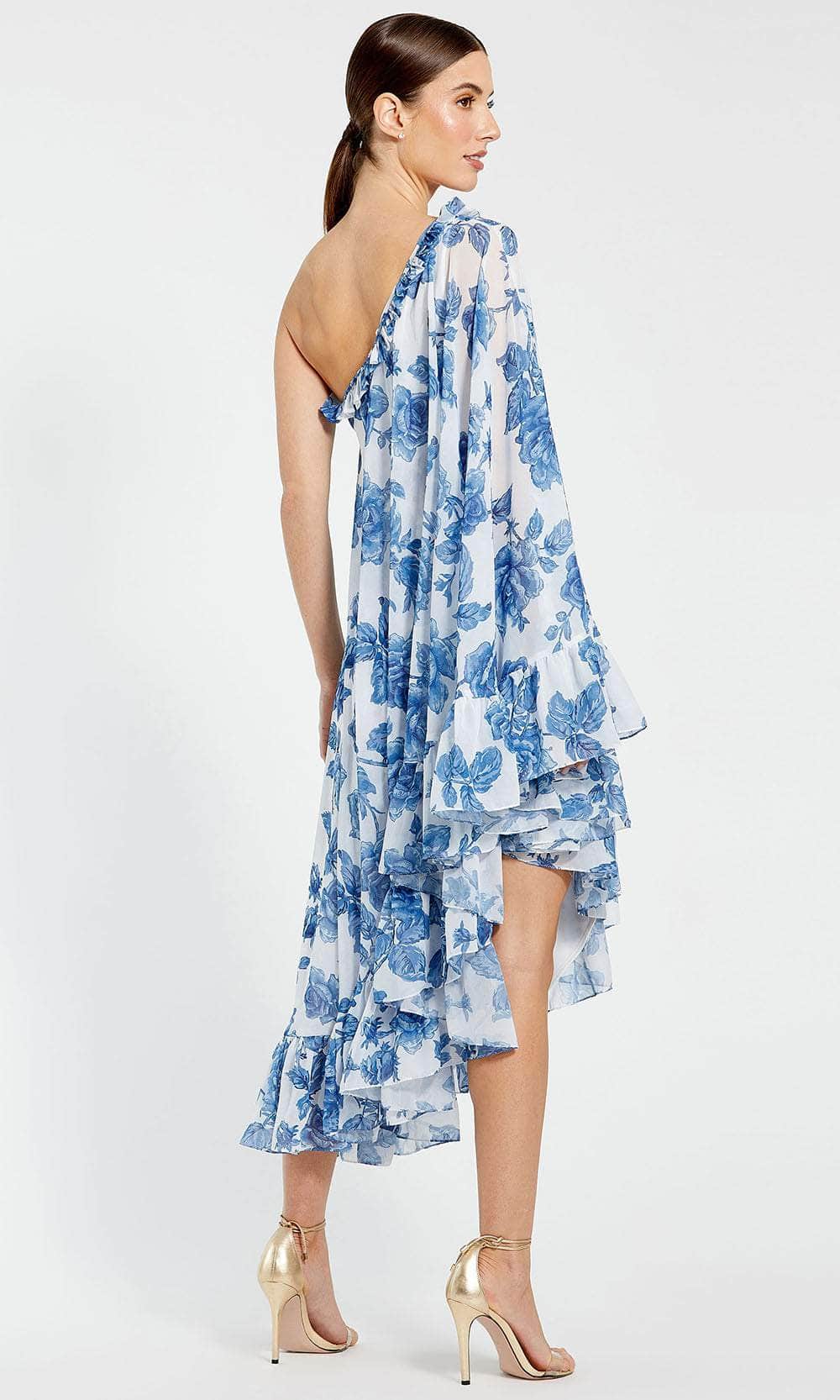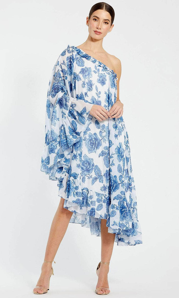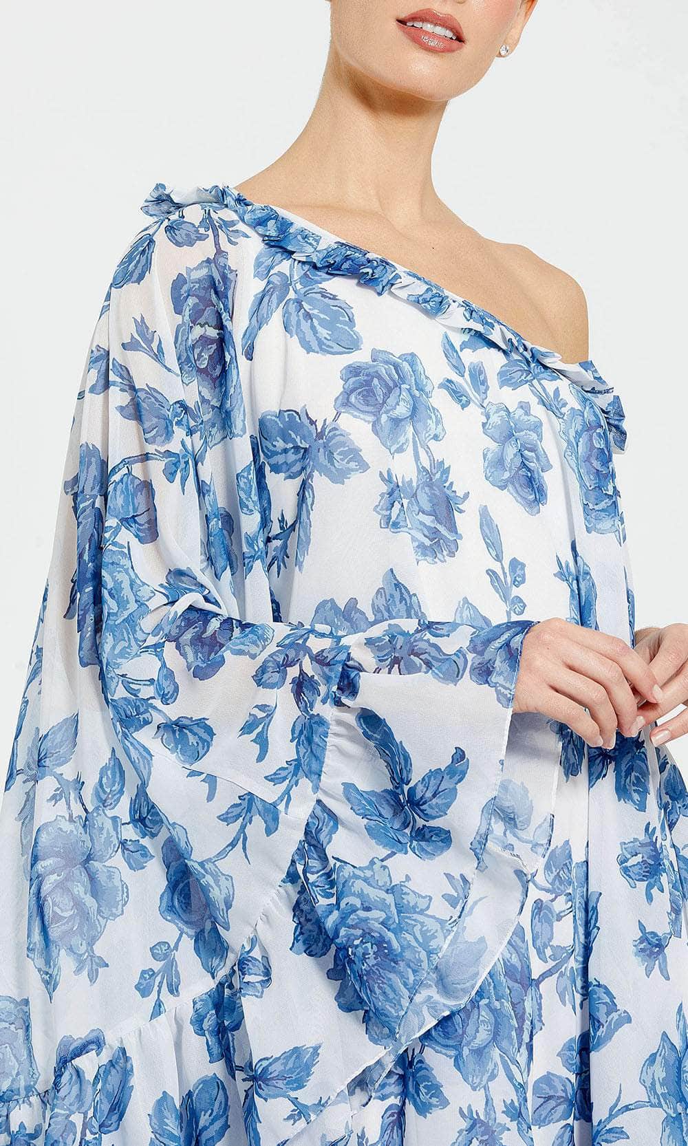 Embrace floral allure in the Mac Duggal 55073 dress, meticulously crafted from floral-printed chiffon. This enchanting ensemble features a captivating one-shoulder design, accentuated by a flowing cape bell sleeve for a touch of drama. The ruffle asymmetrical skirt adds a whimsical charm, creating movement and grace. Secured with a concealed back zipper, this Mac Duggal 55073 effortlessly captures both femininity and elegance, making it the perfect choice for a memorable and stylish statement on any special occasion. Model is wearing White Multi color.
