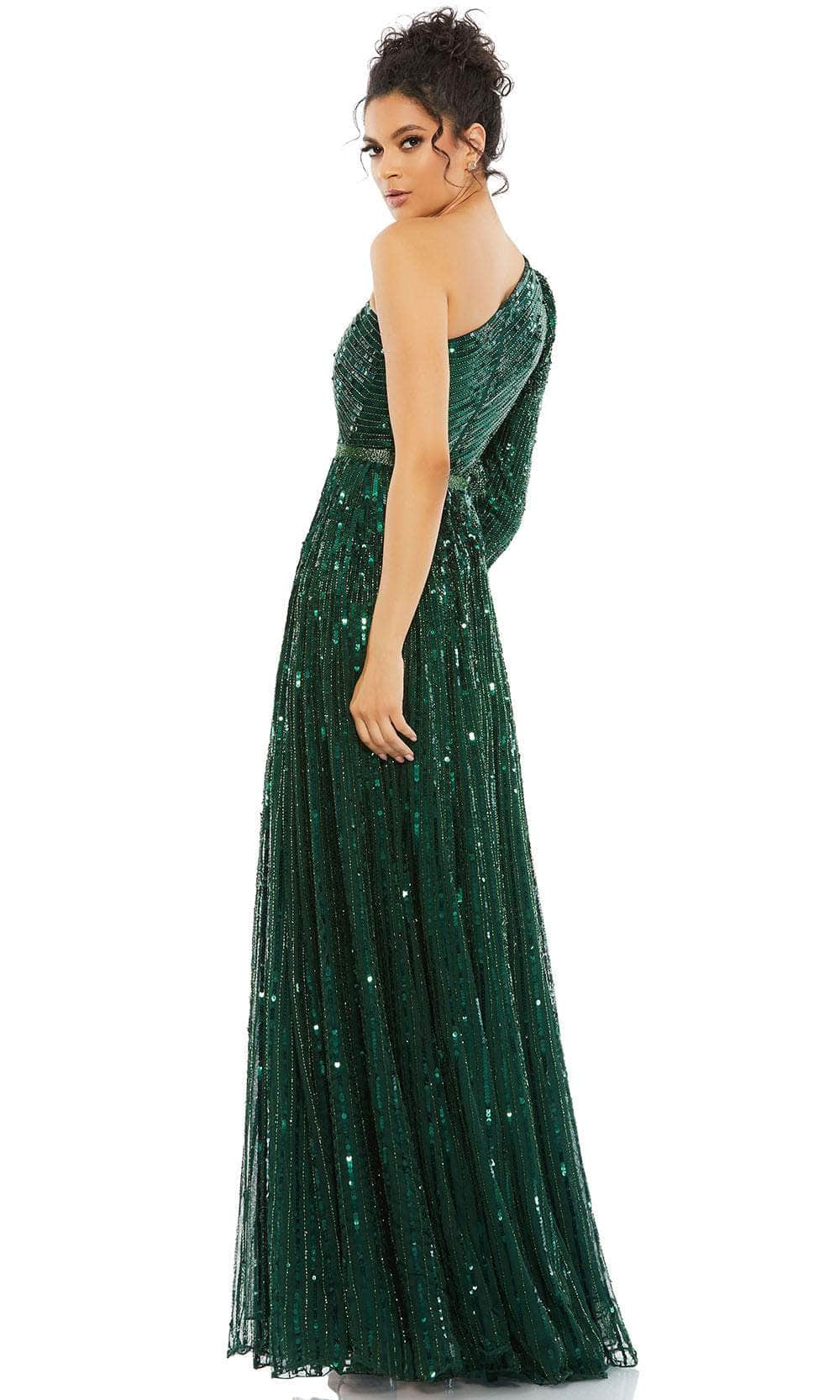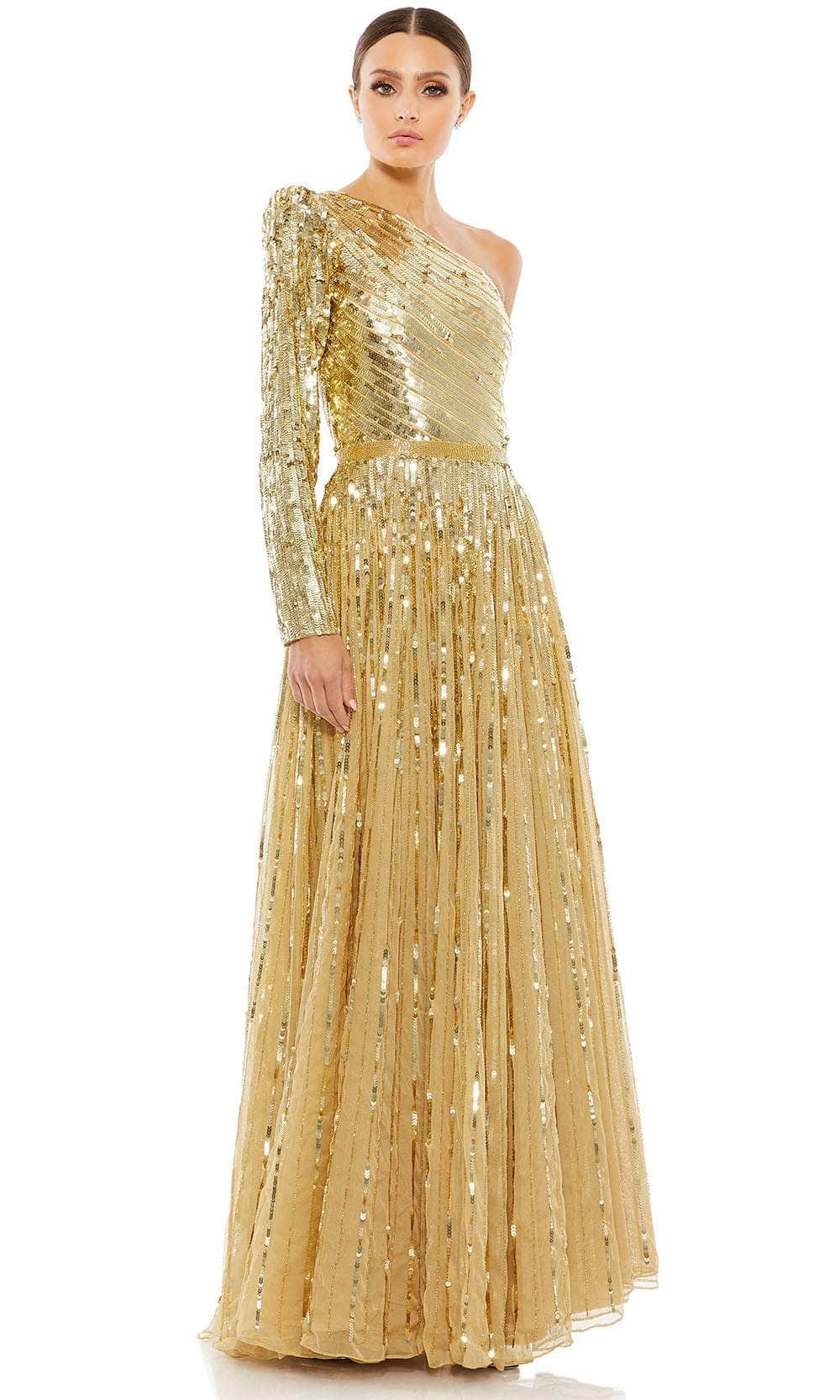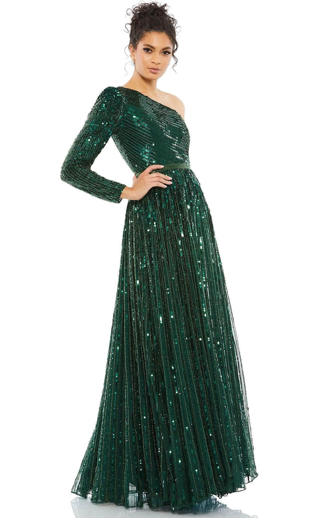 Waltz into the party and feel like a queen in this mesmerizing Mac Duggal 5508 evening dress. This dress showcases an alluring asymmetrical neckline, supported by a one shoulder long sleeve, in a fitted bodice. This creation is entirely designed with sequins, making it appealing at any angles. The back is in an asymmetrical style, complementing the front. Additionally, an A-line silhouette is exhibited on the full length skirt. You are sure to turn heads in this Mac Duggal 5508 dress. Models are wearing Emerald, and Gold colors.