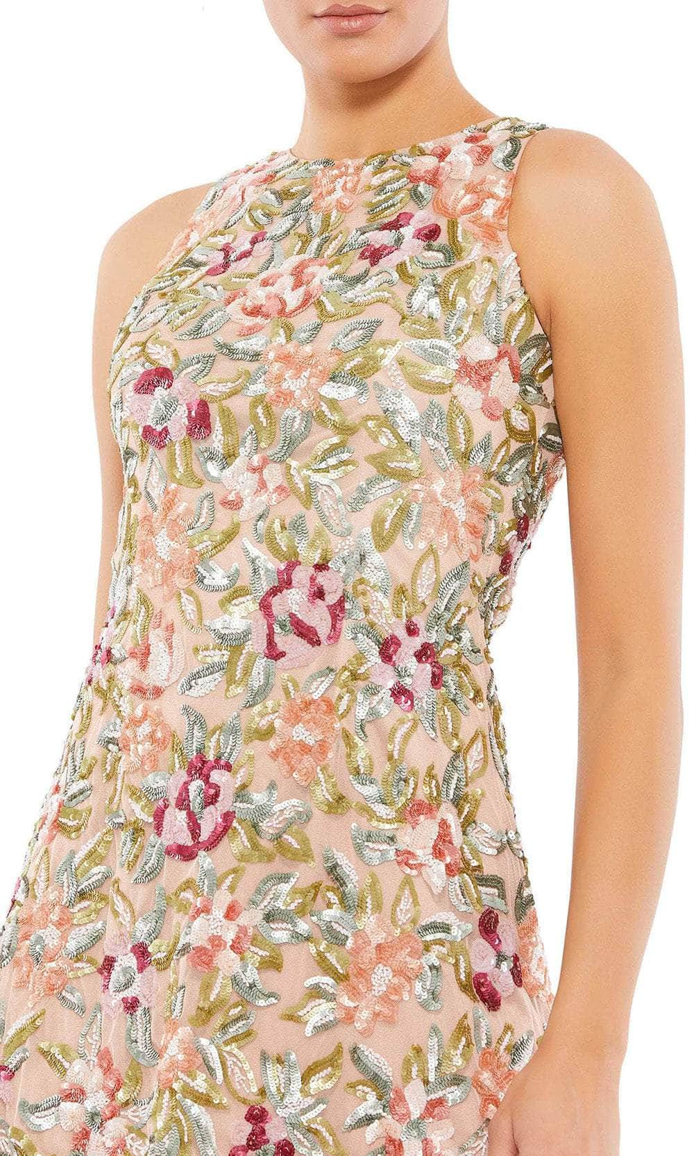 Embrace a radiantly romantic look in the flatteringly feminine dress from Mac Duggal 5537. Lavishly adorned with twinkling sequins in a floral pattern, this beauty shows a sleeveless fitted bodice with a jewel neckline and a fully closed back with a center zipper closure. The skirt forms a sheath silhouette which finishes to the mid-thigh hem. This Mac Duggal creation is sure to make you the darling of the party! Model is wearing the Blush Multi color.