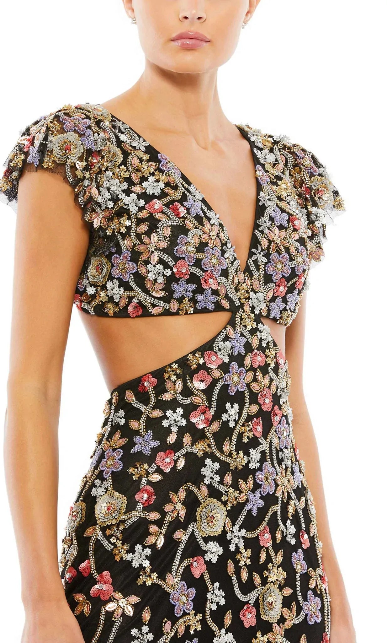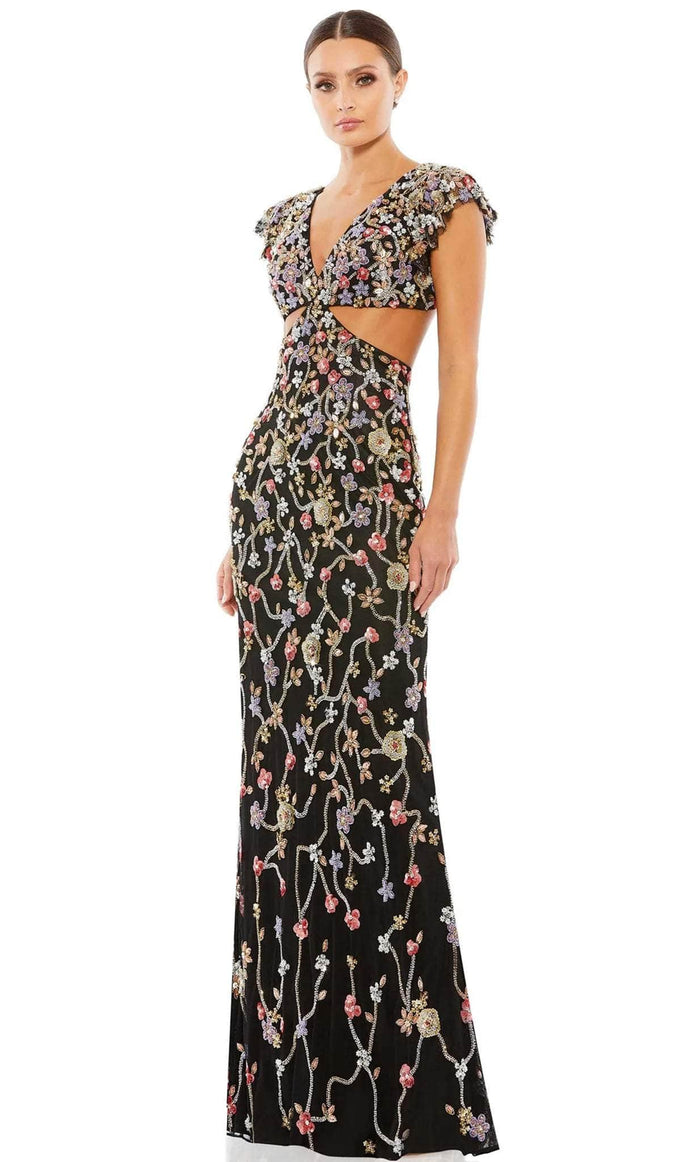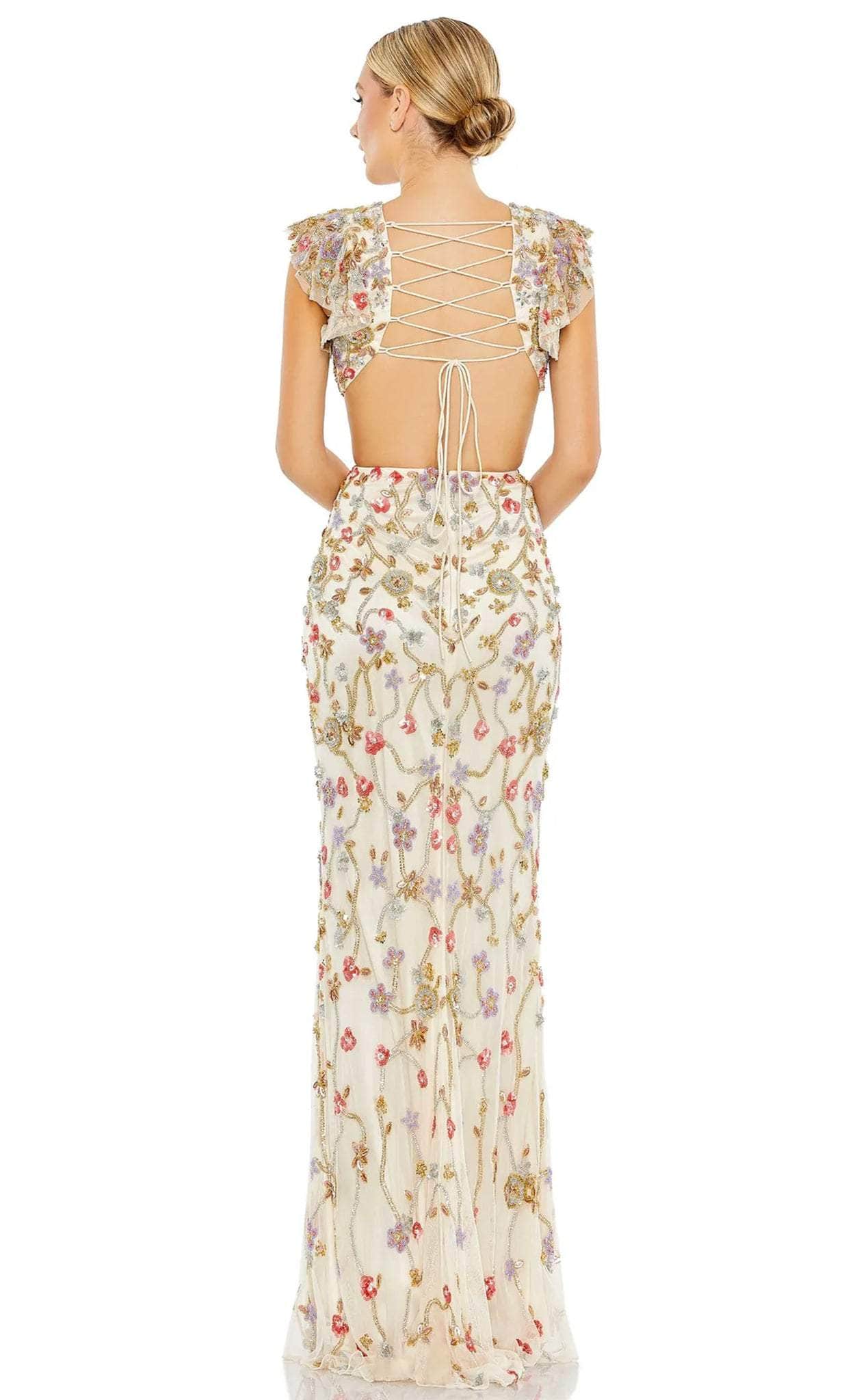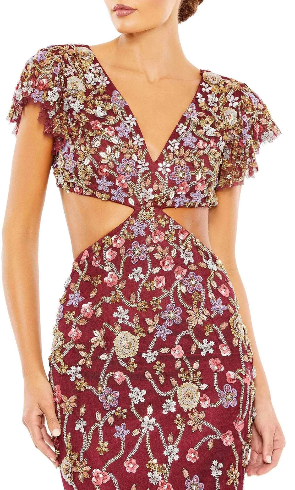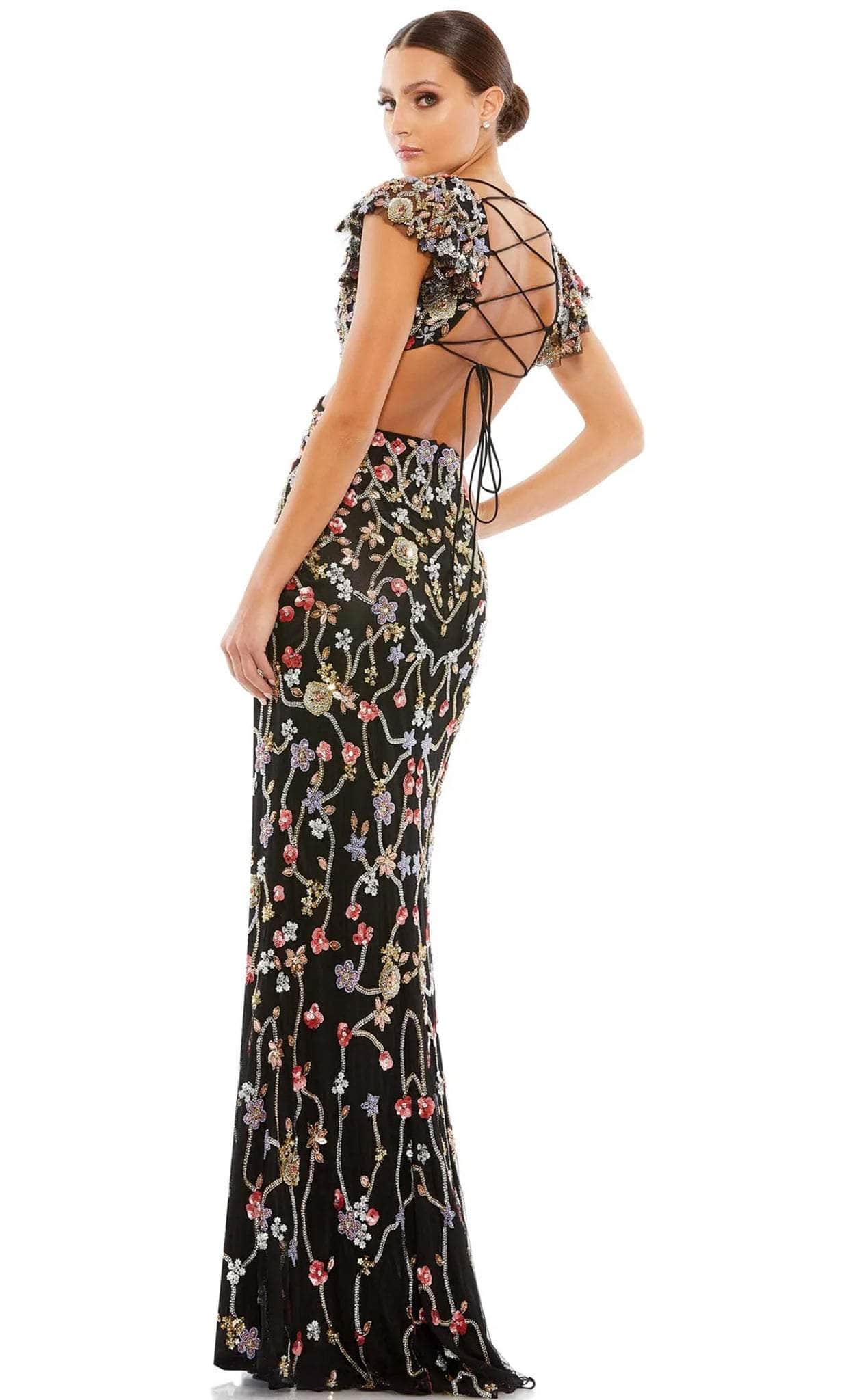 Be pretty in this lovely Mac Duggal 5564 masterpiece. All over the mesh fabric are delicate beadings and flower appliques, and the dress is expertly tailored with a soft lining. The fitting bodice is supported by a deep V-neckline and ruffled cap sleeves, as the open-back flaunts strappy lace-up closure. The full length sheath silhouette of the skirt is secured with a zipper at the back for a perfect fit. This unique Mac Duggal 5564 creation is sure to mesmerize everyone on your special event. Models are wearing the Nude Multi, Black Multi, and Burgundy Multi colors.