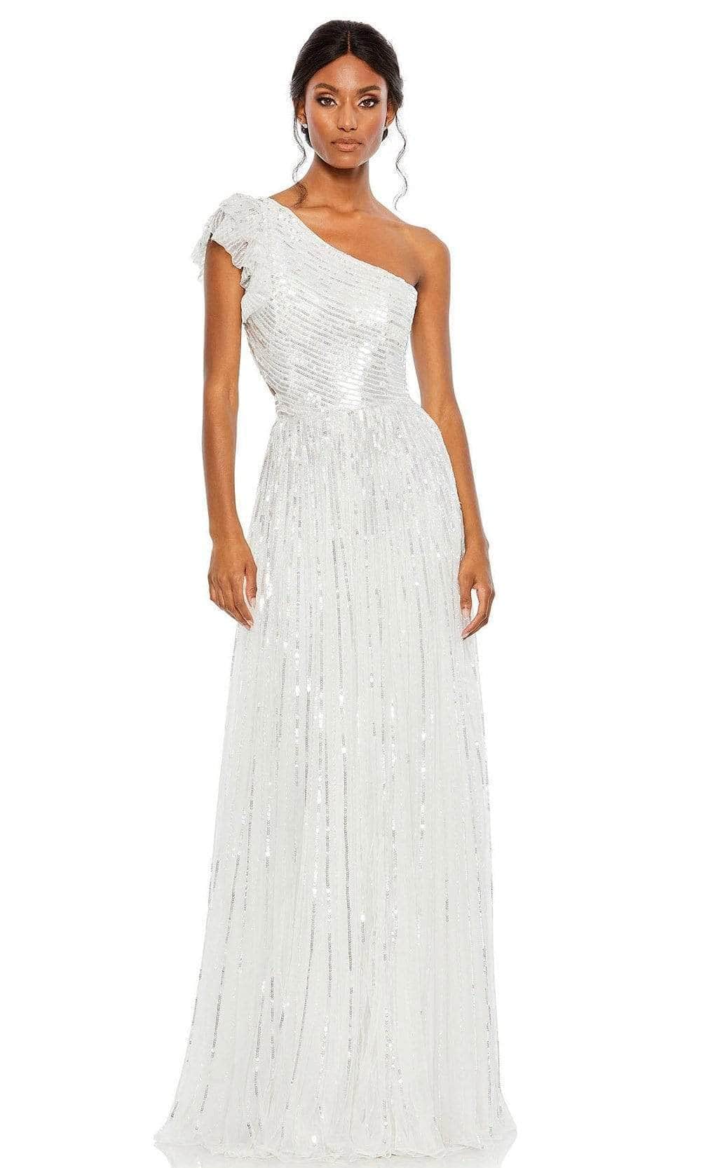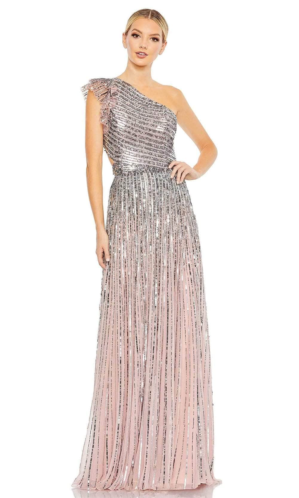 Flourish an iridescent style in this Mac Duggal 5565 creation. Adorned with sequins in a stripe motif gleaming the entire silhouette, this piece shows a one shoulder neckline. Straps ornate the laced up back. A flutter sleeve accents on shoulder as the A-line skirt cascades into a train. Fancy a romantic night of celebration in this Mac Duggal masterpiece.