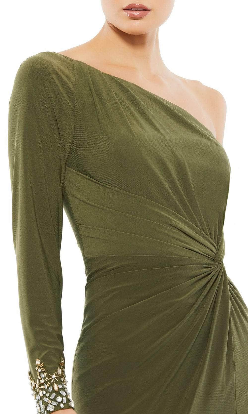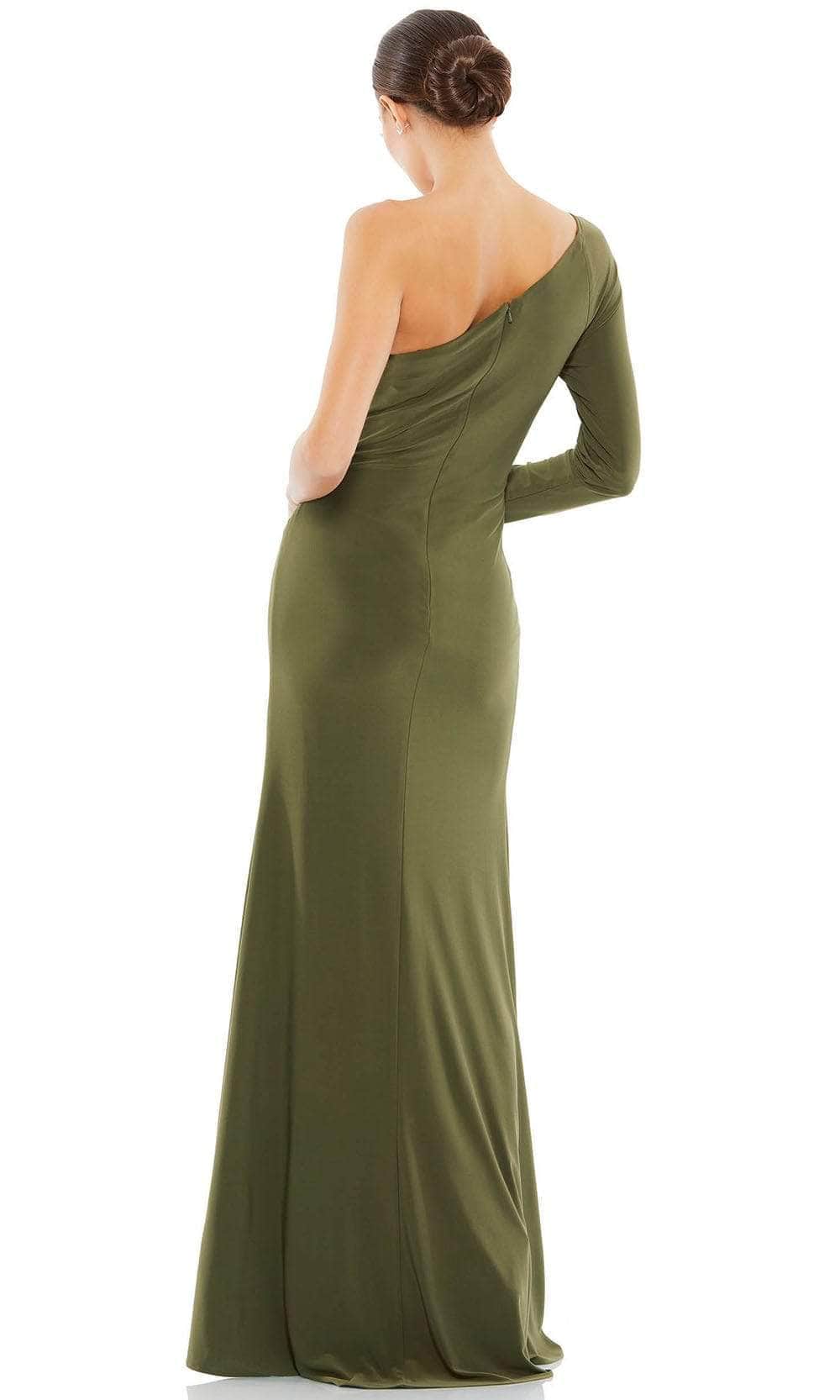 Elevate a style that is tantalizing in this chic Mac Duggal 55696 creation. Fashioned in a smooth jersey silhouette, this gown flaunts an asymmetrical bodice textured with draped accents that lead to a knot ornate bodice. A long sleeve frames the bodice as a high slit opens the sheath skirt as it flows into a floor grazing train. Saunter on the red carpet in this Mac Duggal masterpiece. Exquisite attention to detail is the hallmark of Mac Duggal dresses. Mac Duggal dresses encapsulate the very essence of the women who wear them, reflecting their confidence, feminine power, and inner beauty.