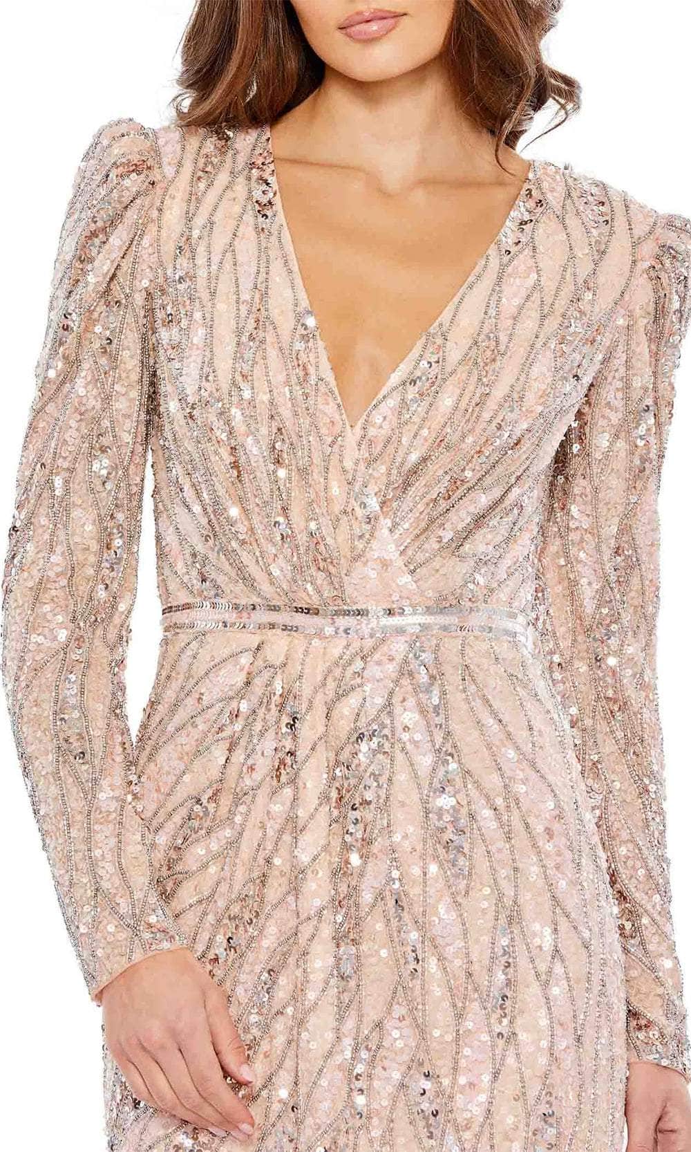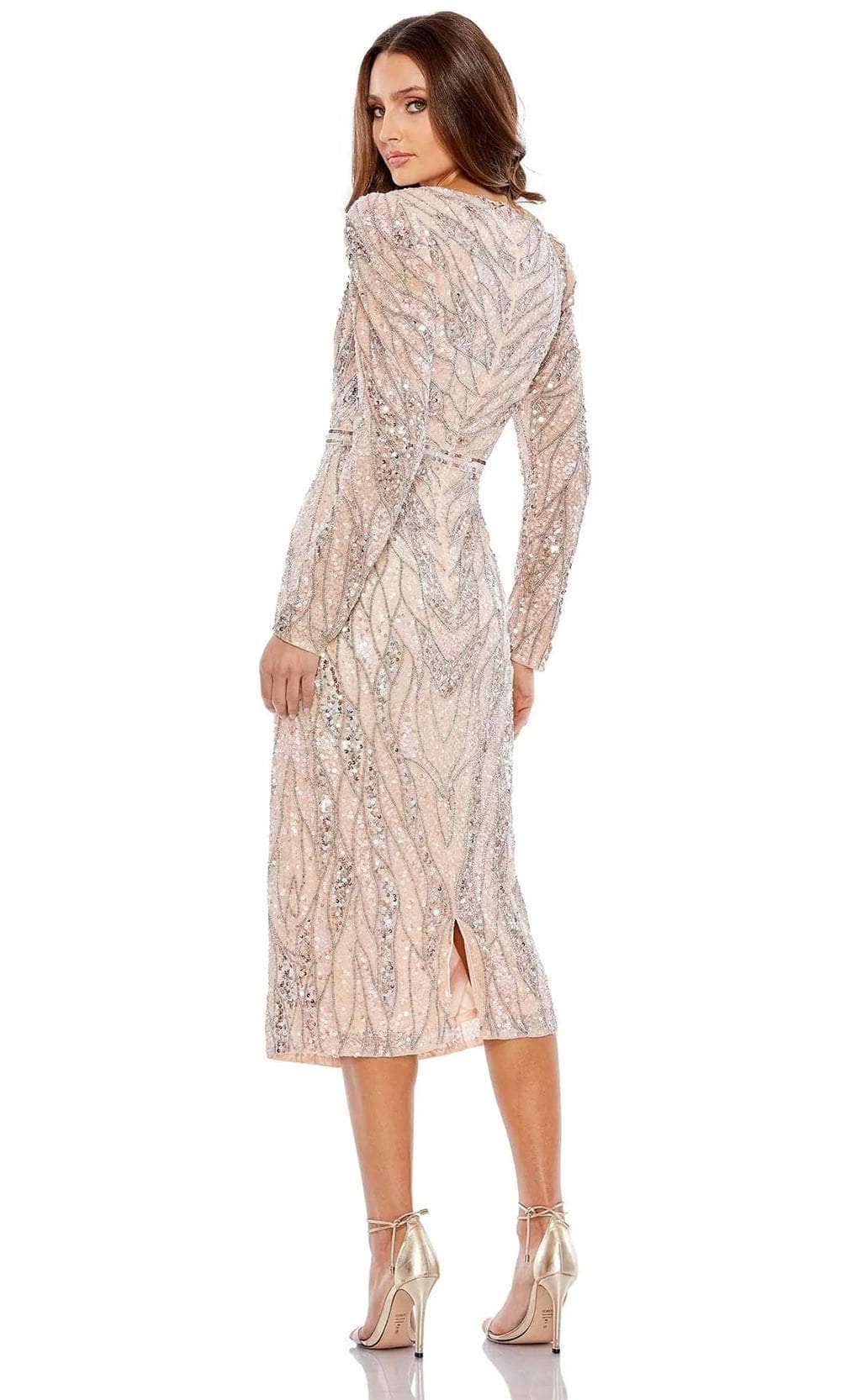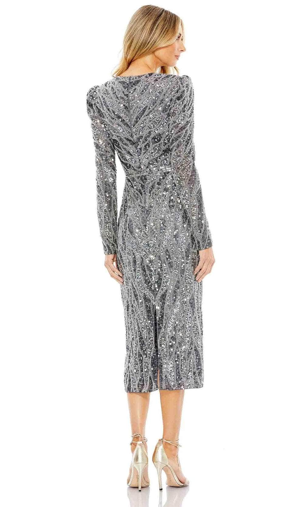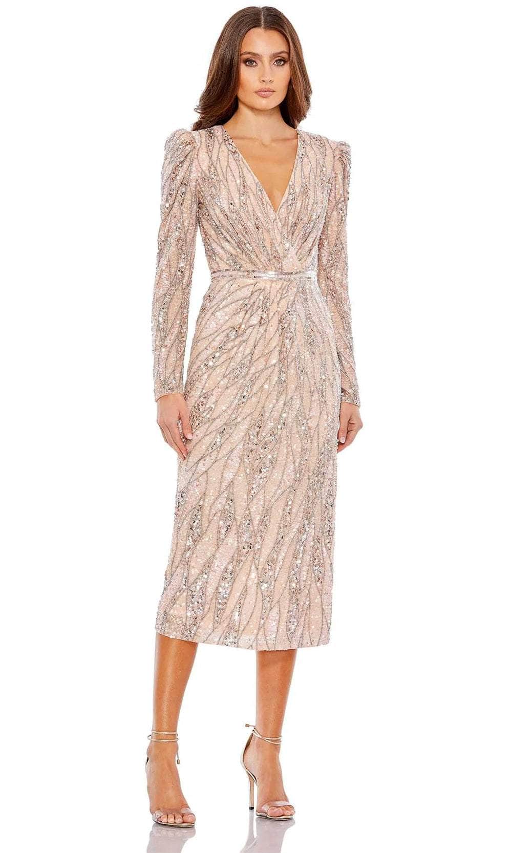 Steal the spotlight in the captivating Mac Duggal 5574 masterpiece. This tea-length dress shimmers with intricate beadwork, transforming you into a vision of vintage glamour. The ruched surplice bodice with a V-neckline flatters your curves, while the puff long sleeves add a touch of romantic charm. A dazzling sequin waistband cinches your silhouette, and the center-back slit adds a touch of alluring movement. Ideal for cocktail receptions, soirees, or any event demanding a touch of sophisticated sparkle, this Mac Duggal 5574 creation effortlessly charms everyone. Models are wearing the Charcoal and Rose Gold colors.
