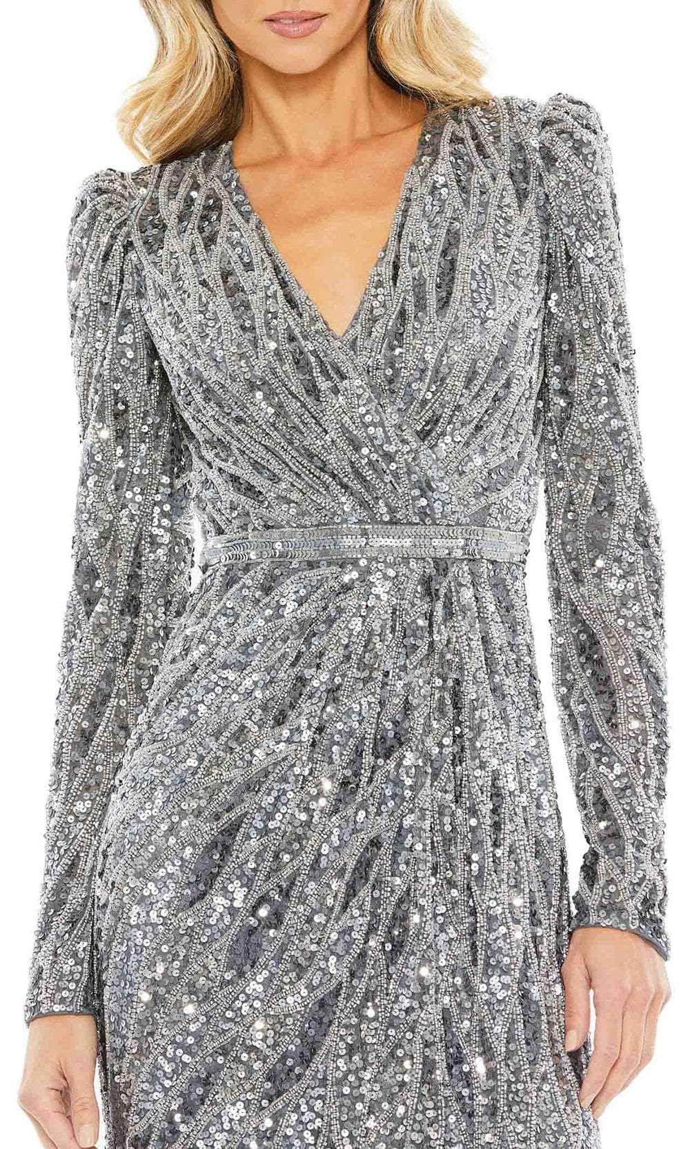 Steal the spotlight in the captivating Mac Duggal 5574 masterpiece. This tea-length dress shimmers with intricate beadwork, transforming you into a vision of vintage glamour. The ruched surplice bodice with a V-neckline flatters your curves, while the puff long sleeves add a touch of romantic charm. A dazzling sequin waistband cinches your silhouette, and the center-back slit adds a touch of alluring movement. Ideal for cocktail receptions, soirees, or any event demanding a touch of sophisticated sparkle, this Mac Duggal 5574 creation effortlessly charms everyone. Models are wearing the Charcoal and Rose Gold colors.