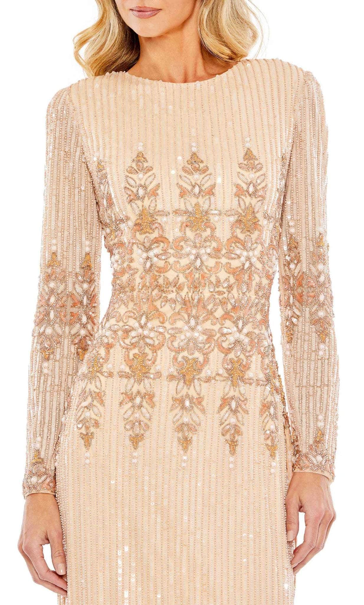 When wearing this Mac Duggal 5576 you will feel elegant and glitzy. This stunner is lavishly ornamented with shimmering sequins and showcases a long sleeve figure-flattering bodice and a high neckline that matches the fully enclosed back with a center zipper closure for a perfect fit. This ensemble has a knee-length skirt accented with a slit at the back for an elegant touch. Flatter your shape with a sculpted dress from Mac Duggal 5576 masterpiece. Models are wearing Platinum and Peach colors.