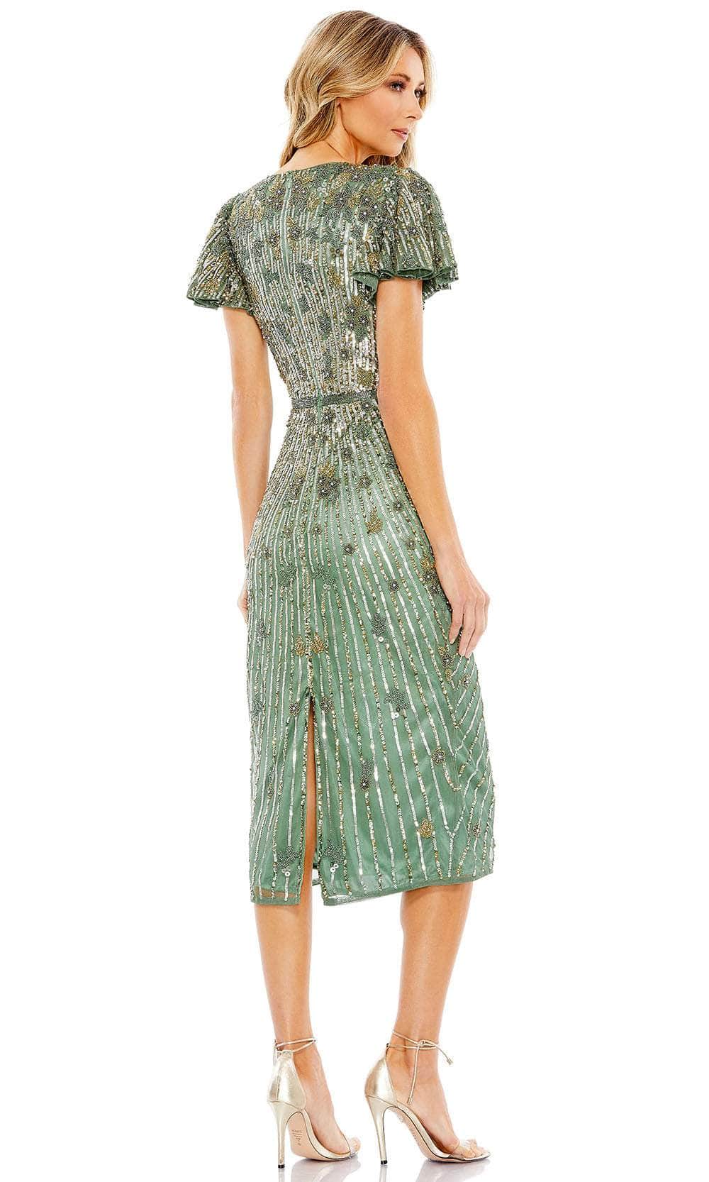 Make a statement at any special event with this Mac Duggal 5582 creation. Adorned with sequins and beadwork in a floral motif, the dress radiates elegance and charm. It flaunts a surplice deep v-neckline, a beaded thin belt, and short flutter sleeves. The full back with a zipper closure guarantees a secure and comfortable fit. Opening a back slit for ease of movement, the sheath skirt brings out your curves and flows gracefully to a tea-length hemline. Sparkle in beauty wearing this Mac Duggal 5582 dress. Model is wearing Sage color.