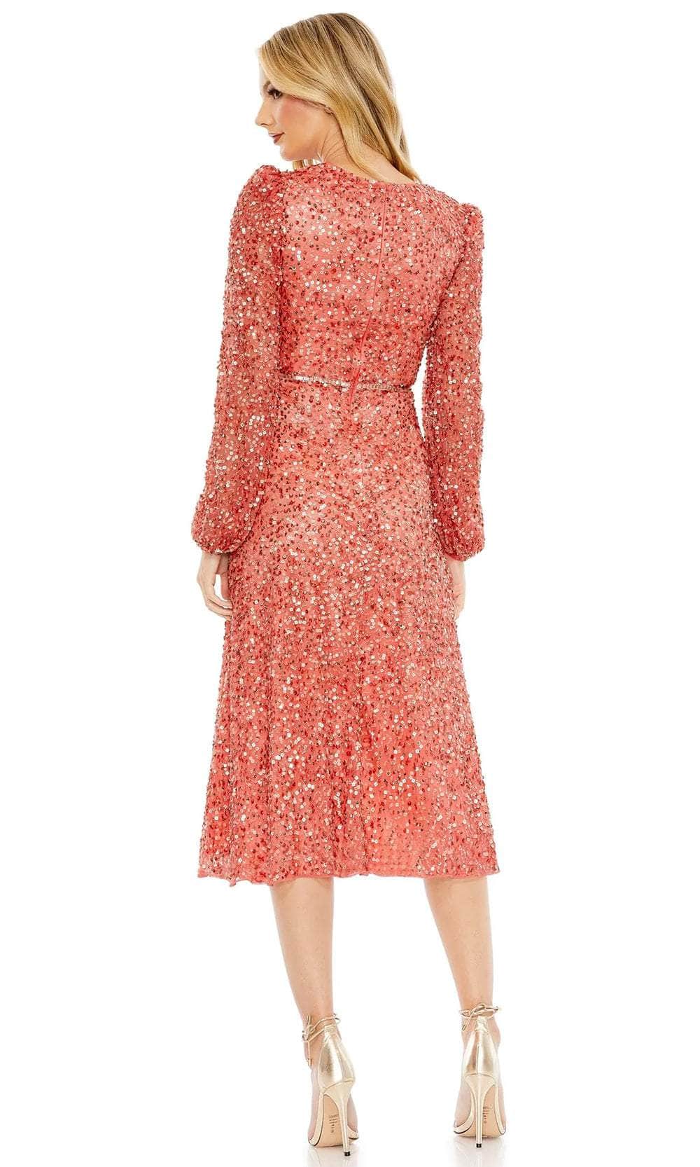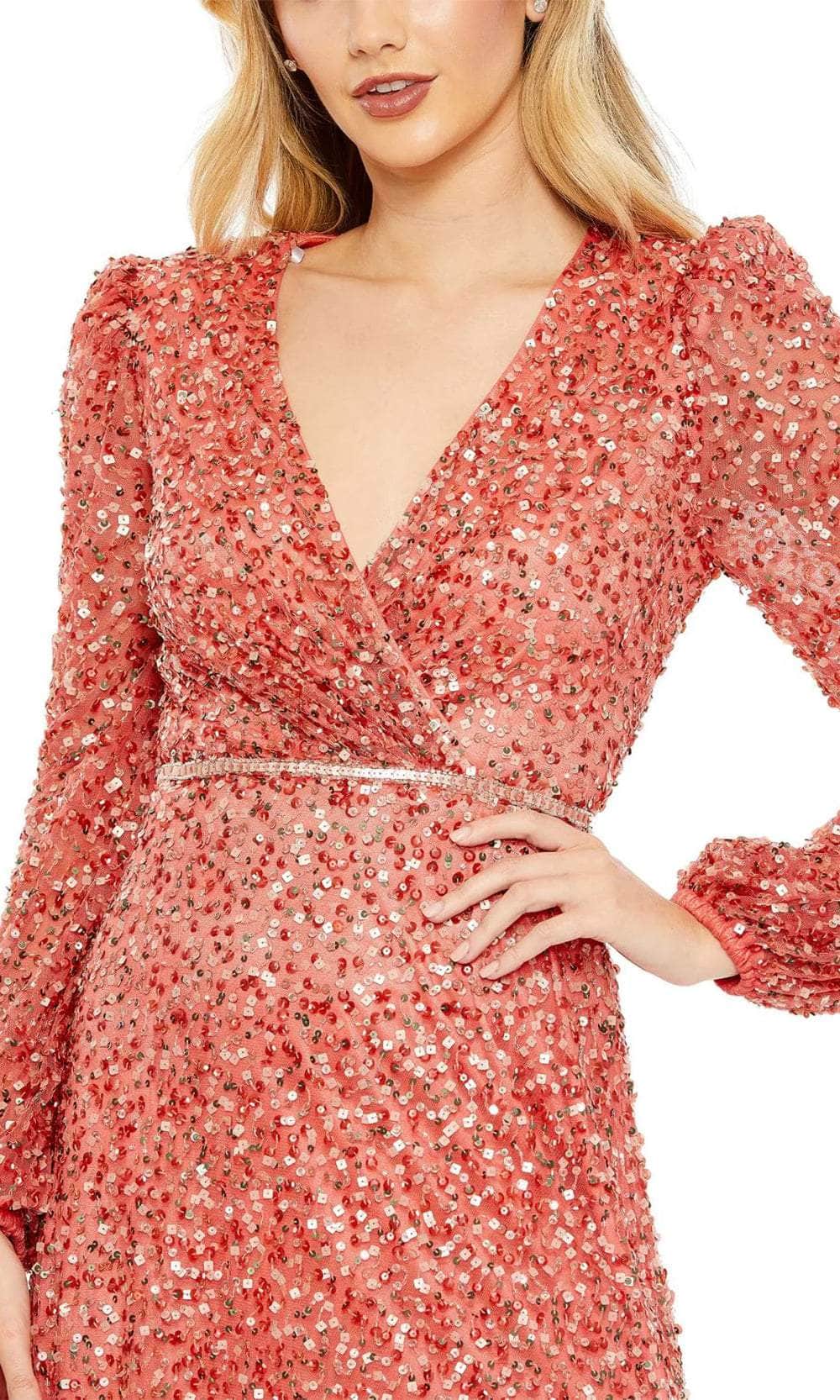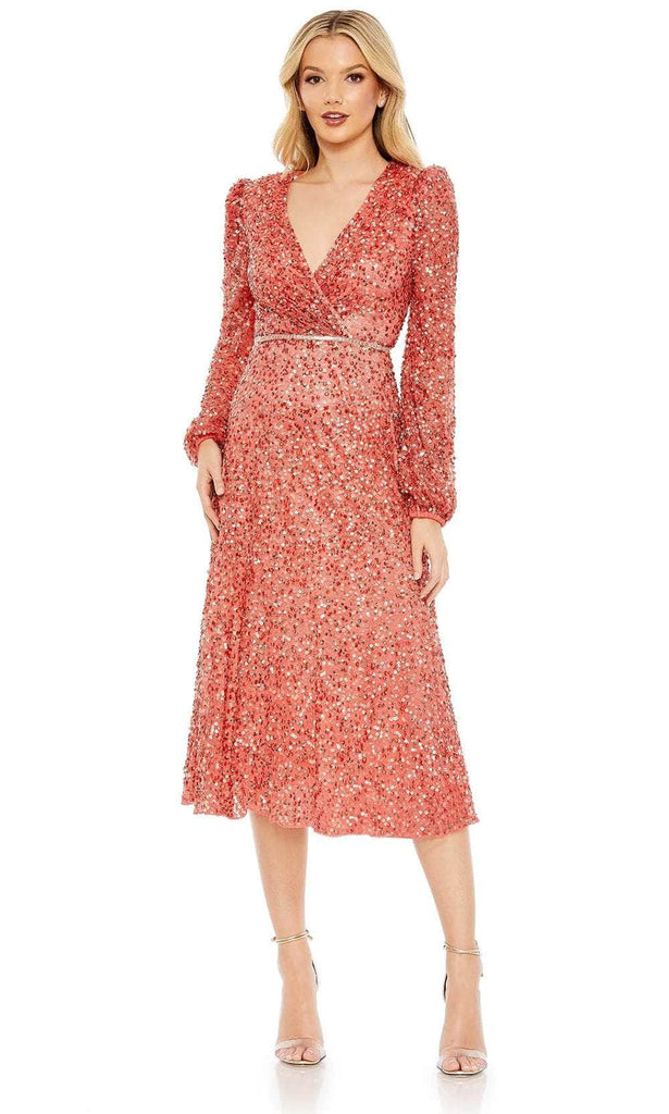 Be the life of the party in the Mac Duggal 5588 masterpiece. This glamorous tea-length dress shimmers with captivating allure, adorned with cascading sequins that dance with your every move. The elegant wrap-over design accentuates a flattering V-neckline, while dramatic puff sleeves add a touch of vintage charm. Delicate beadwork adorns the waist, cinching your silhouette before cascading down the A-line skirt, which flows into a chic tea-length hem. The Mac Duggal 5588 creation is perfect for cocktail parties, galas, or any event where you desire to turn heads and leave a lasting impression. Model is wearing the Coral color.