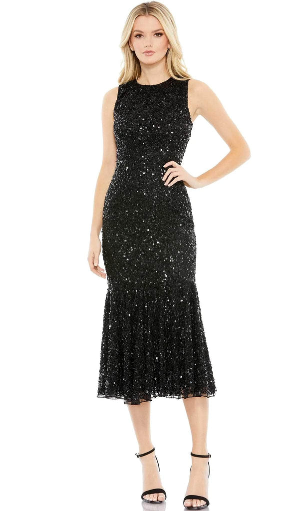 Dress to impress on your next formal event in this simple but captivating Mac Duggal 5597. Known for the highest quality fabrics and fashion-forward designs, this dress is completely lined and made from sequin fabric. This shimmering tea-length dress is sleeveless and has a jewel neckline and hidden zipper for closure. The fitted style is perfect to encapsulate your petite body! Moreover, the trumpet silhouette of the skirt is best for you to dress up to the nines! This Mac Duggal 5597 is the perfect match for the girl who wants to look both sexy and fashion-forward. Model is wearing Black color.