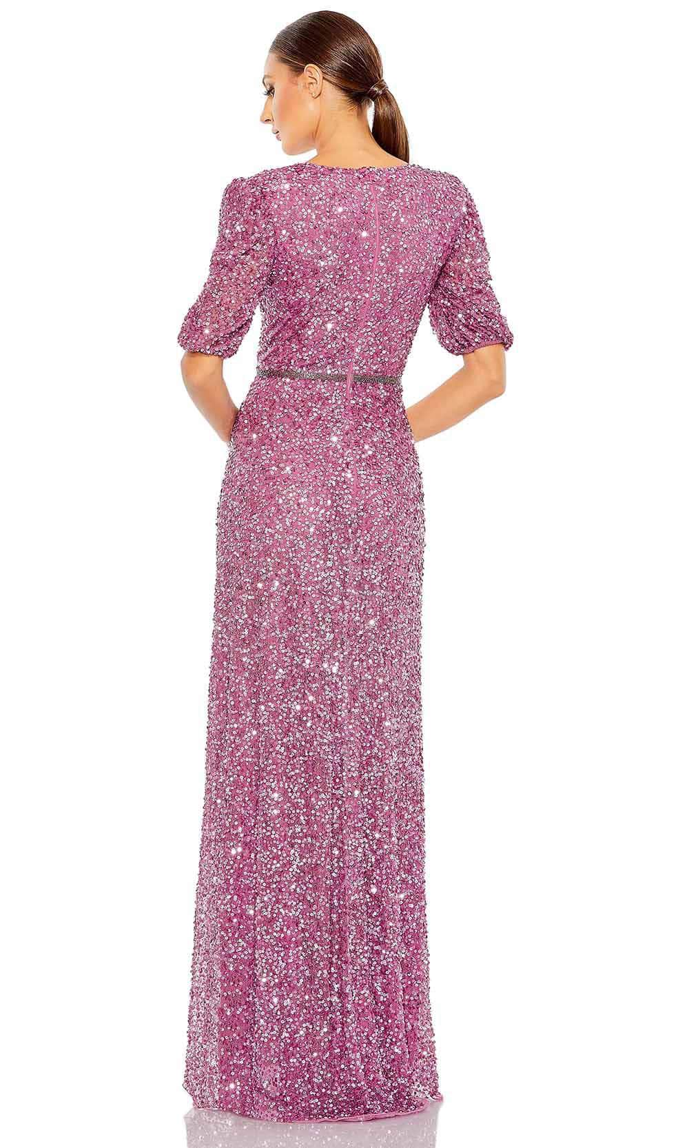 Make a glamorous entrance in this sequined Mac Duggal 5610 sheath dress. This stunning dress features a V-neckline that beautifully frames the décolletage and elongates the neck with short puff sleeves add a touch of femininity and vintage-inspired charm. The faux wrap bodice creates a flattering silhouette and enhances the waistline, while the embellished waist adds a dazzling and eye-catching detail. Overall, sequined fabric shimmers and catches the light, making you the center of attention wherever you go. Look fabulous for your event in Mac Duggal! Model is wearing Plum color.
