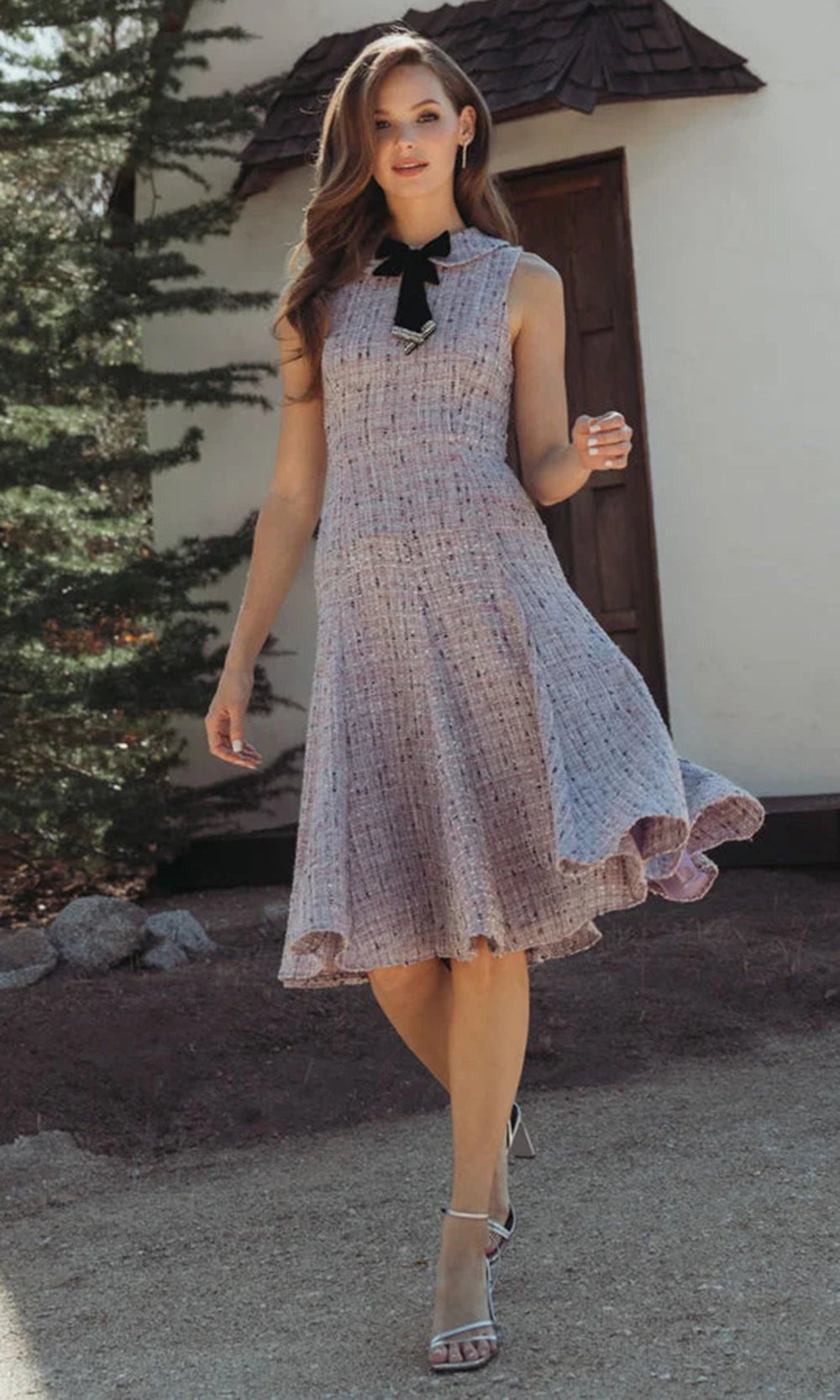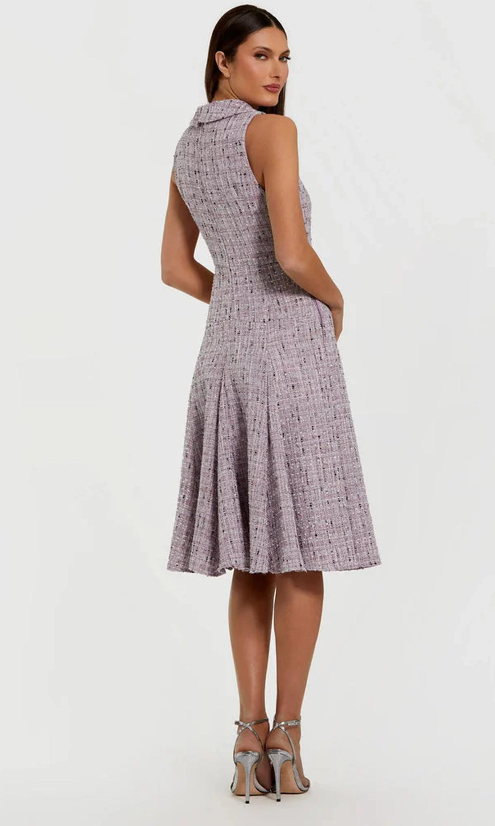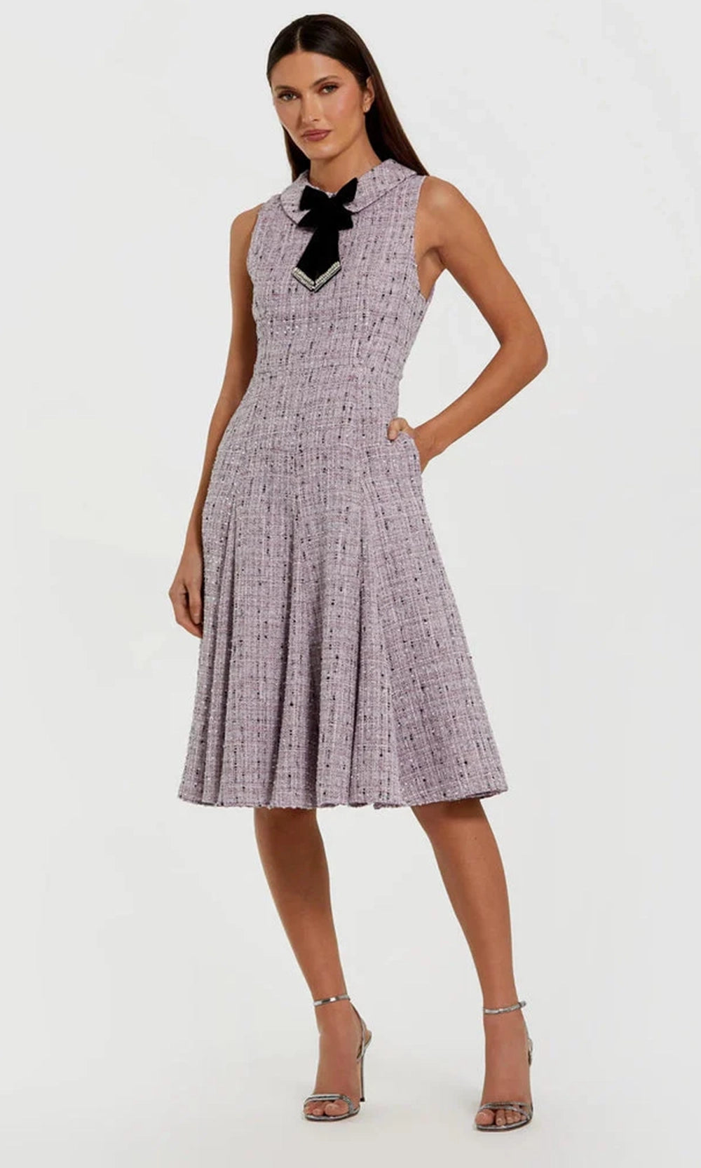 Tailored sophistication meets feminine flair in this Mac Duggal 56175 playful yet polished day dress. It showcases a sleeveless boucle bodice with a pointed collar, high neckline and decorative velvet bow. Its flared A-line skirt brings volume to the look while maintaining structure, falling just at the knee. The plaid pattern adds dimension, and pockets offer a practical touch. Mac Duggal 56175 is the perfect blend of style and ease for events that call for understated elegance. Model is wearing Lilac Multi color.