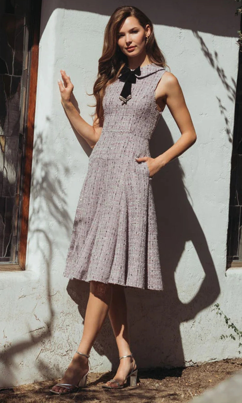 | Details: | Sleeveless, Collared Neckline, Velvet Bow with Beaded Trim, Pockets, Closed Back |