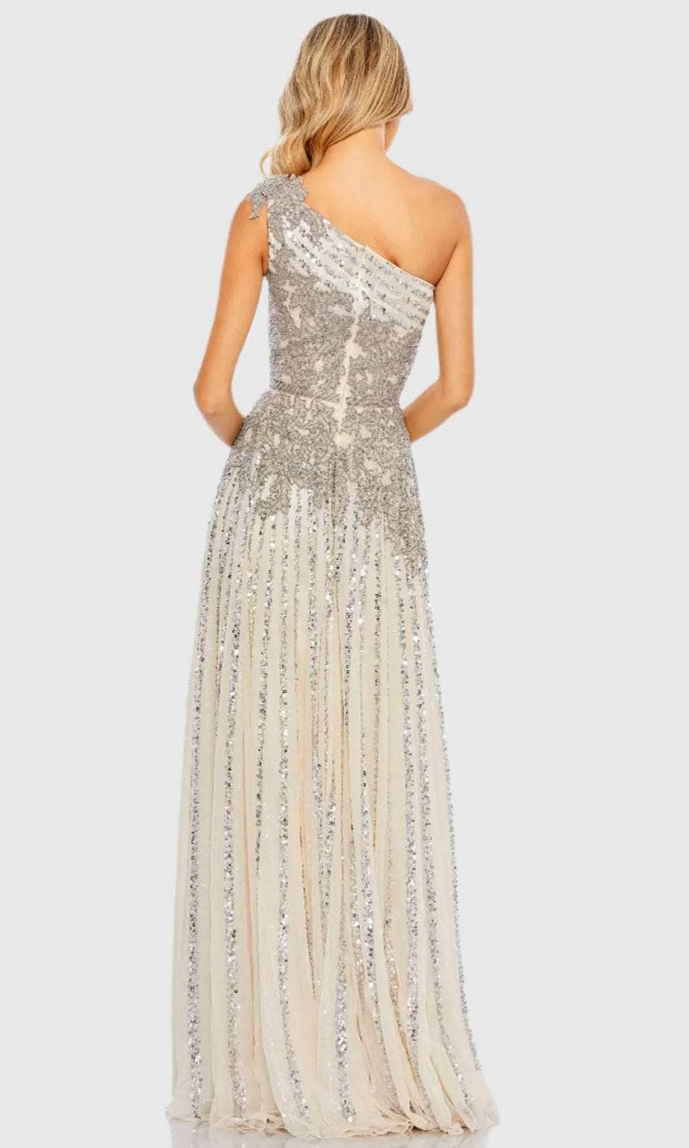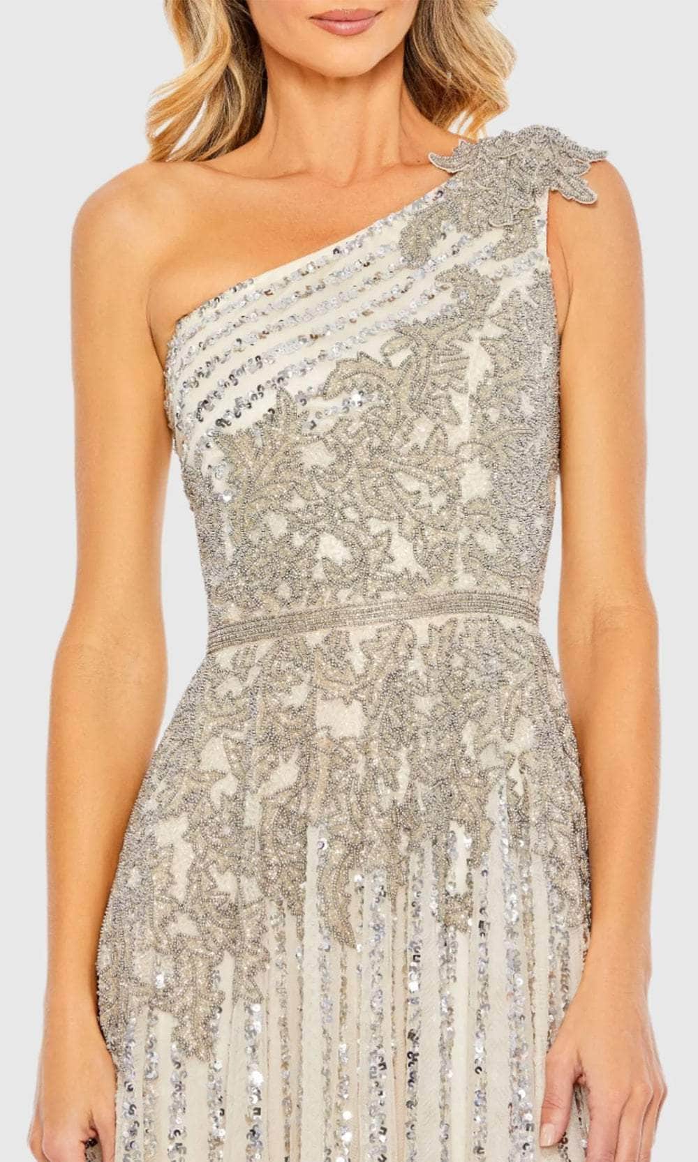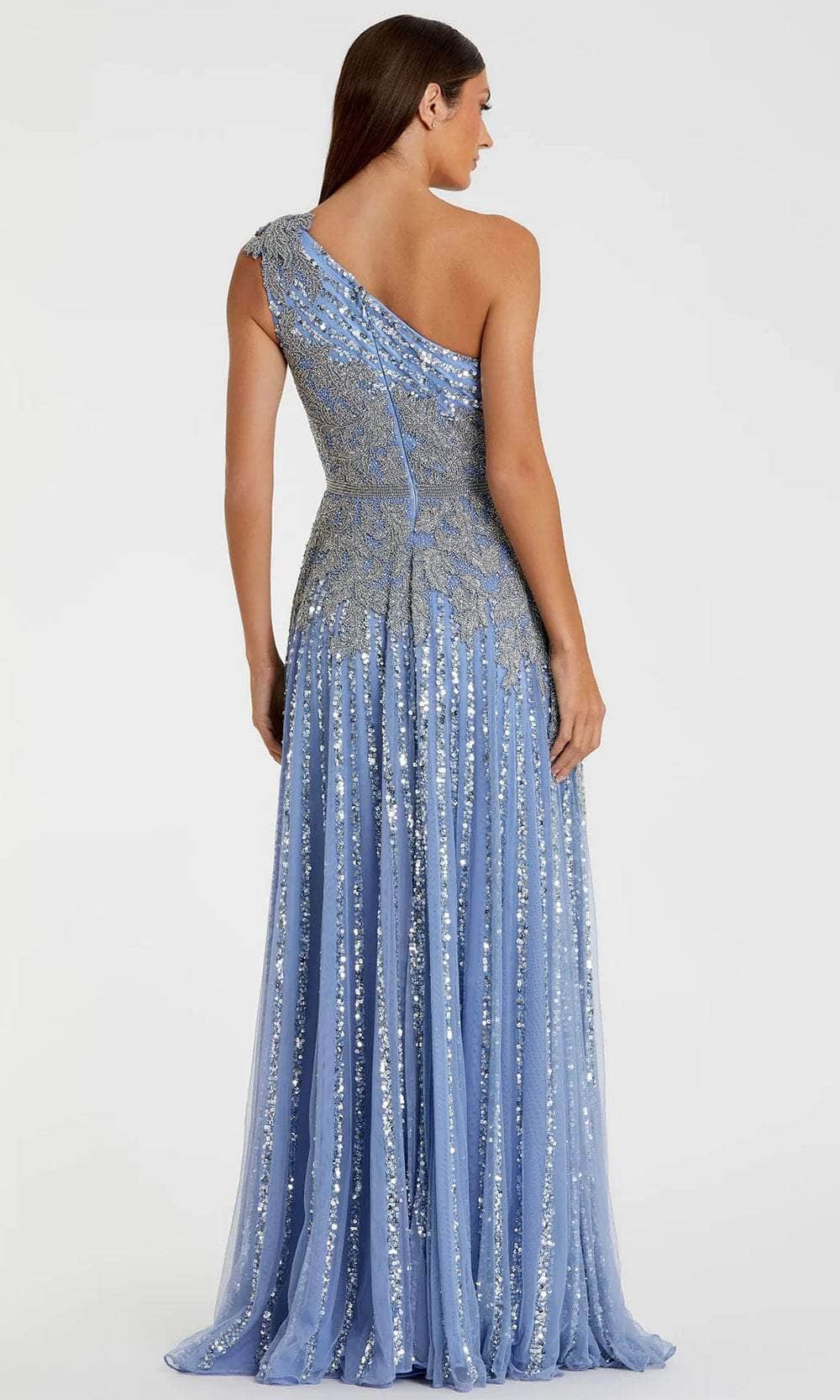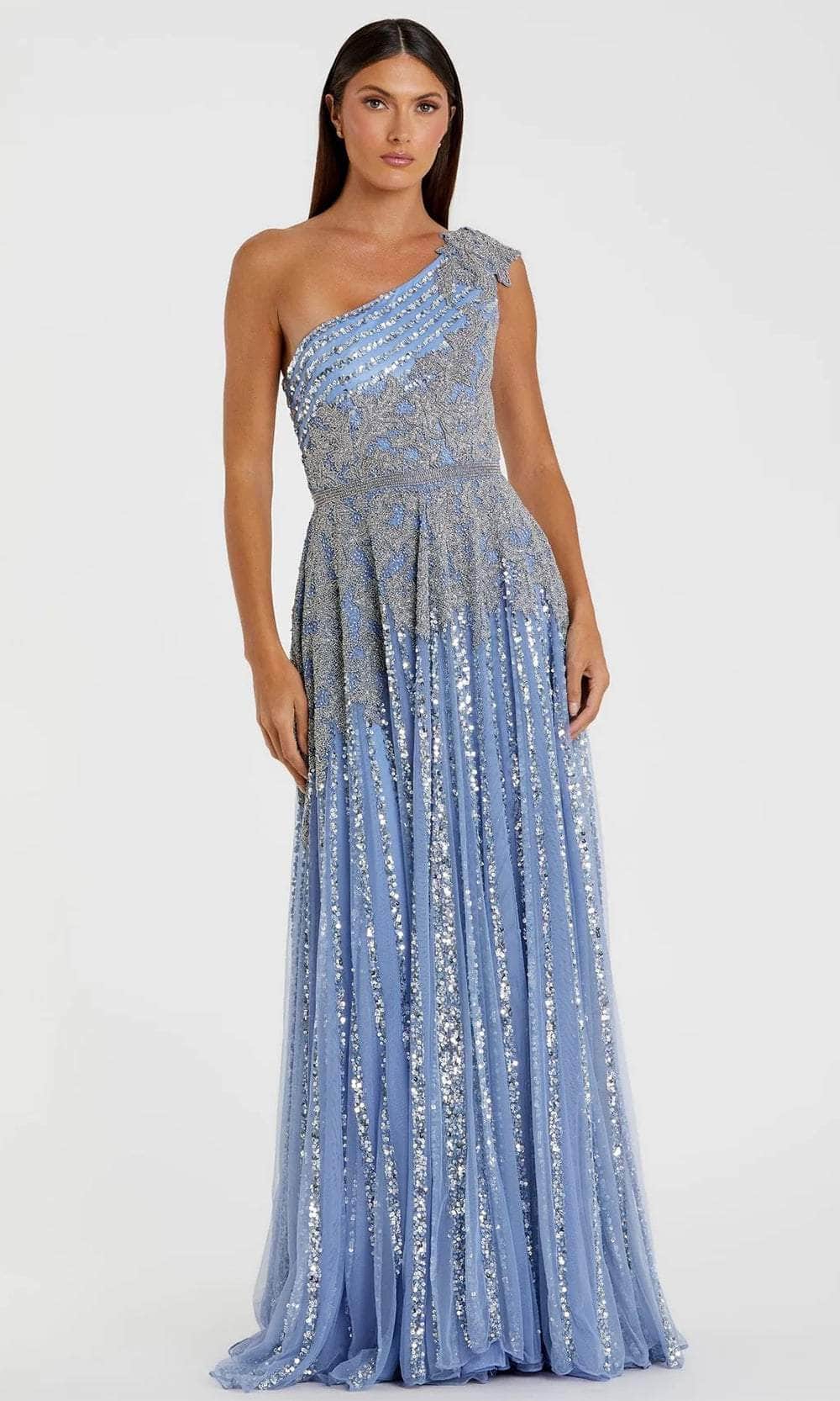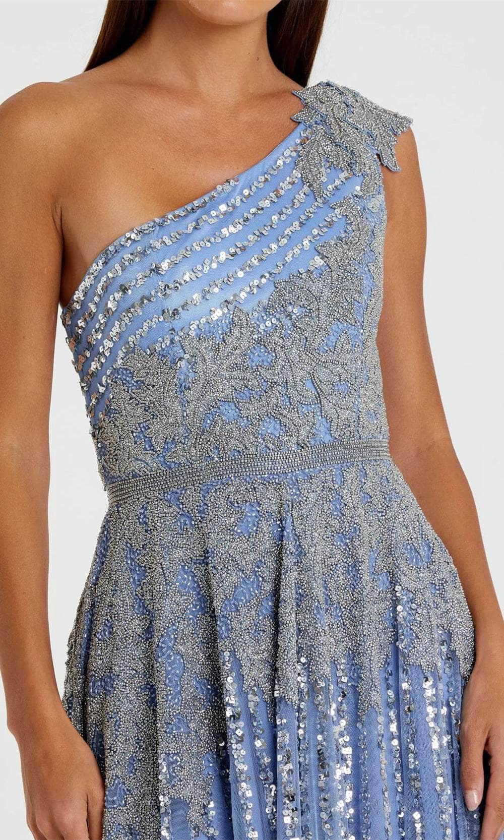 Be the focal point of any occasion with the undeniable charm of this Mac Duggal 5679 creation. Destined to dazzle, this dress has all-over linear sequins and beaded appliques from the top to past the waist. The cap sleeve on one shoulder adds a touch of elegance, while the asymmetric neckline captivatingly mirrors the daring mid-open back. The skirt flows elegantly to the floor, creating a romantic A-line silhouette. The concealed zipper closure at the back and the thin beaded waistband perfectly complete the ensemble. This Mac Duggal 5679 dress will make you feel like royalty. Models are wearing Silver Nude, and Slate Blue colors.