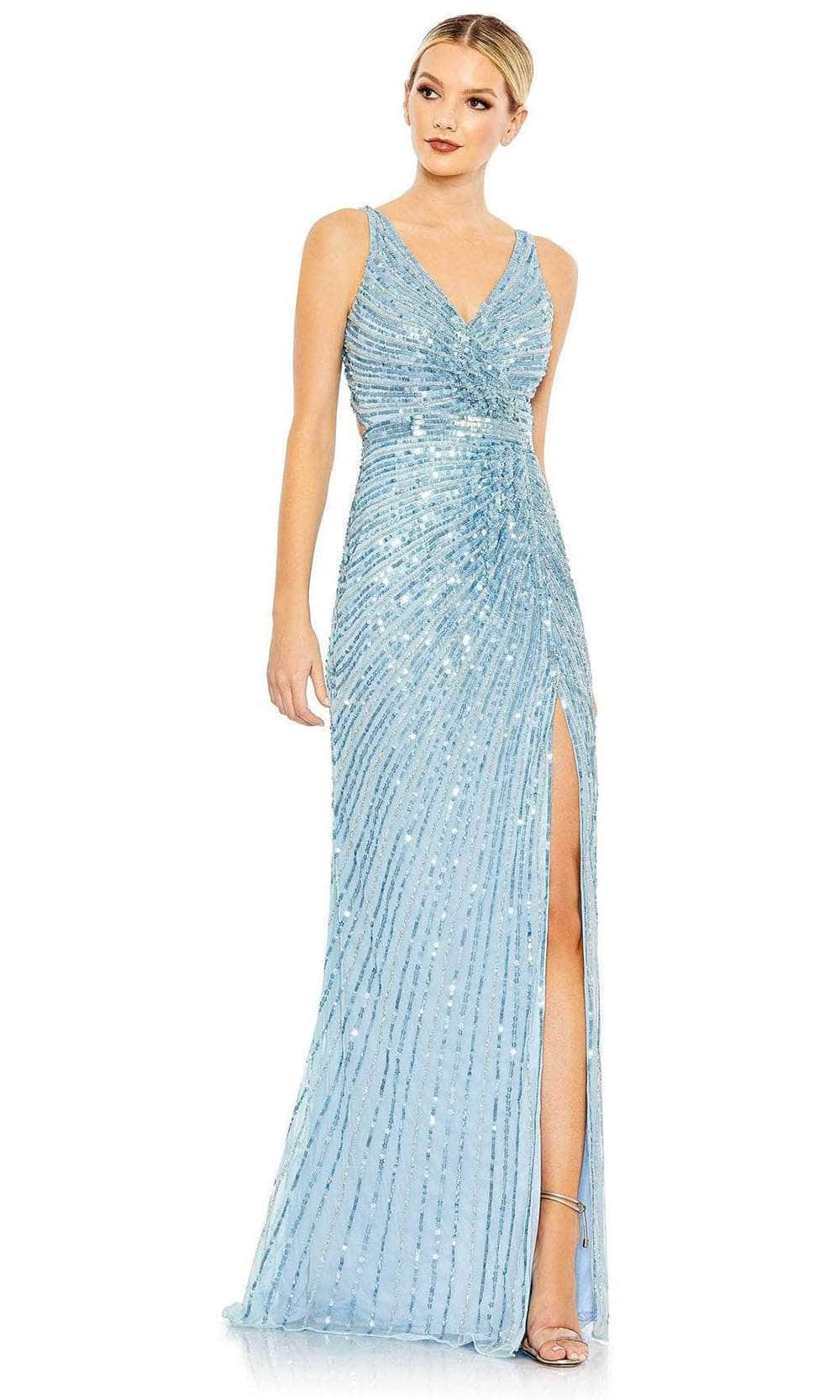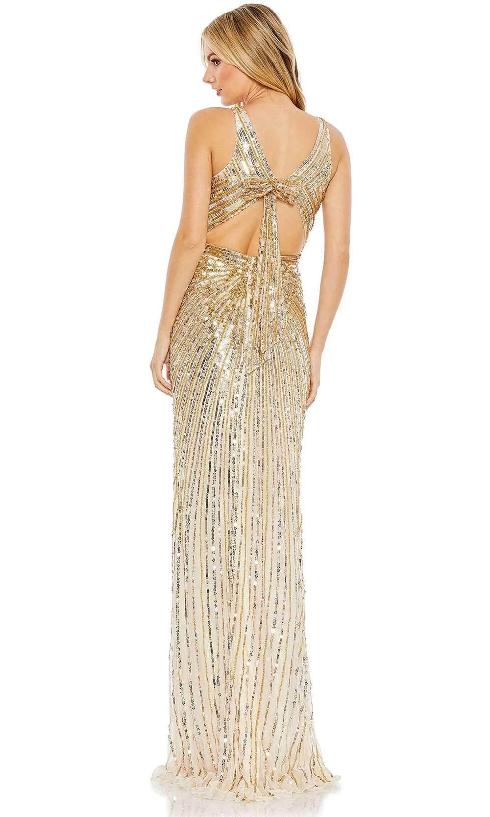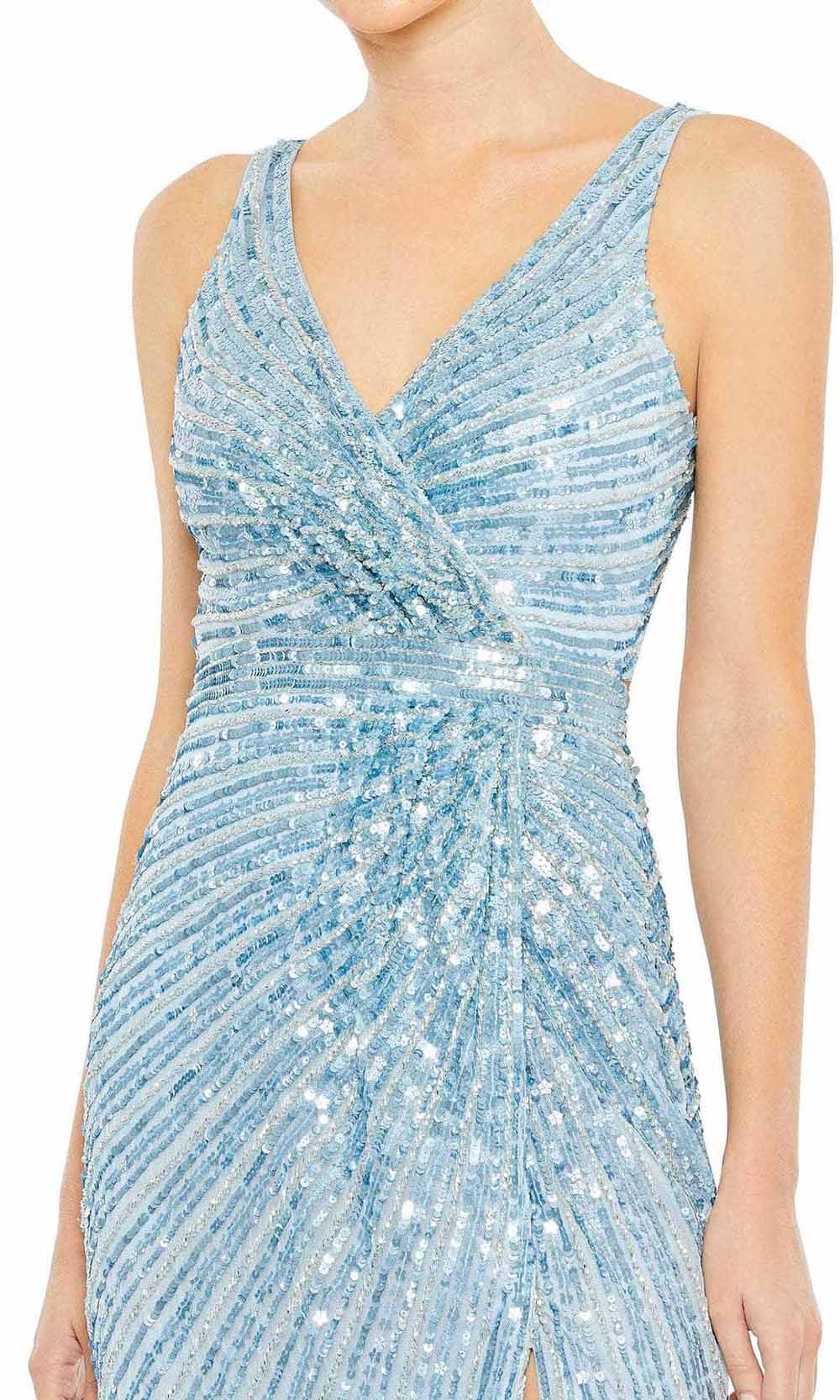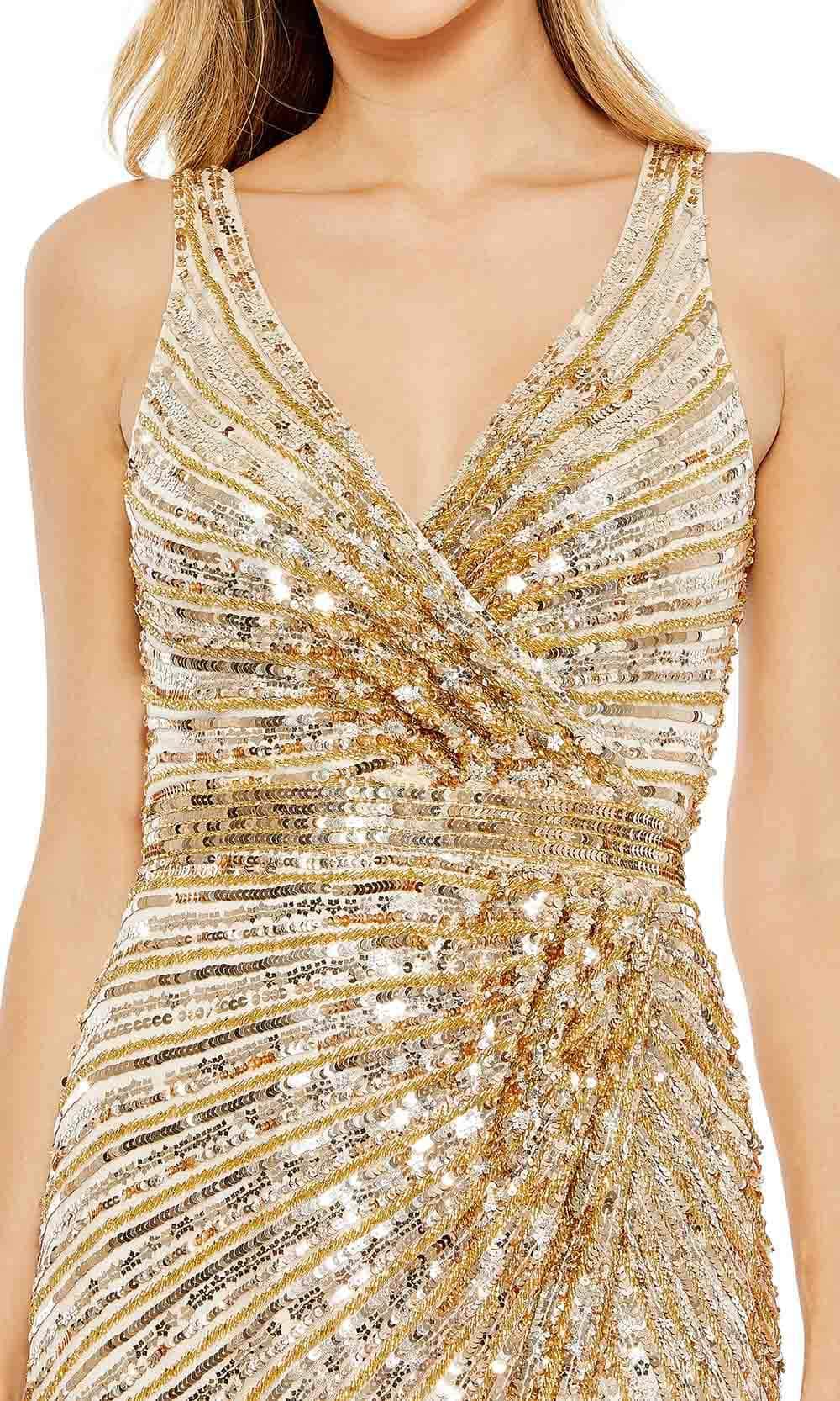 Look like a statuesque beauty on the red carpet when you arrive in this Mac Duggal 5685 creation. Scintillatingly rendered in a stripe motif sequined spectacle, this beauty shows off a sleeveless bodice with a deep v-neckline. Gracing this ensemble with a faux wrap bodice and a cutout back with a bow accent, this alluring piece features a sexy slit that shows off those legs as it forms a sheath silhouette with a sweeping denouement. Flatter those exceptional assets as you flourish charm in this Mac Duggal 5685 masterpiece. Models are wearing the Gold and Ice Blue colors.