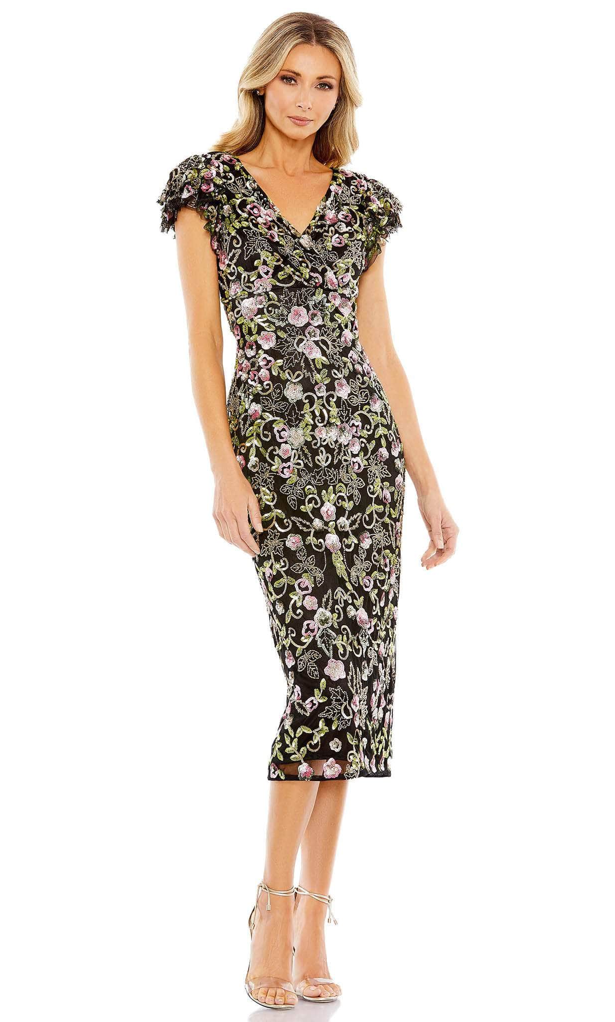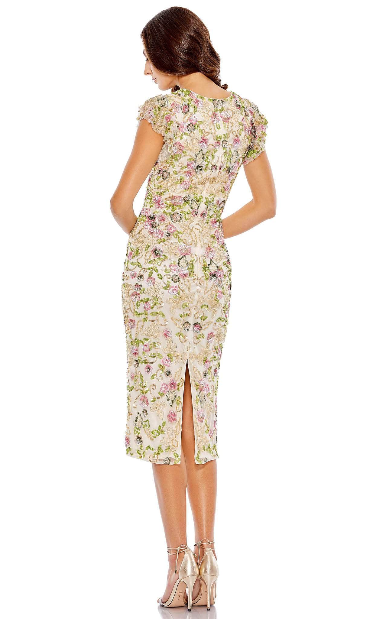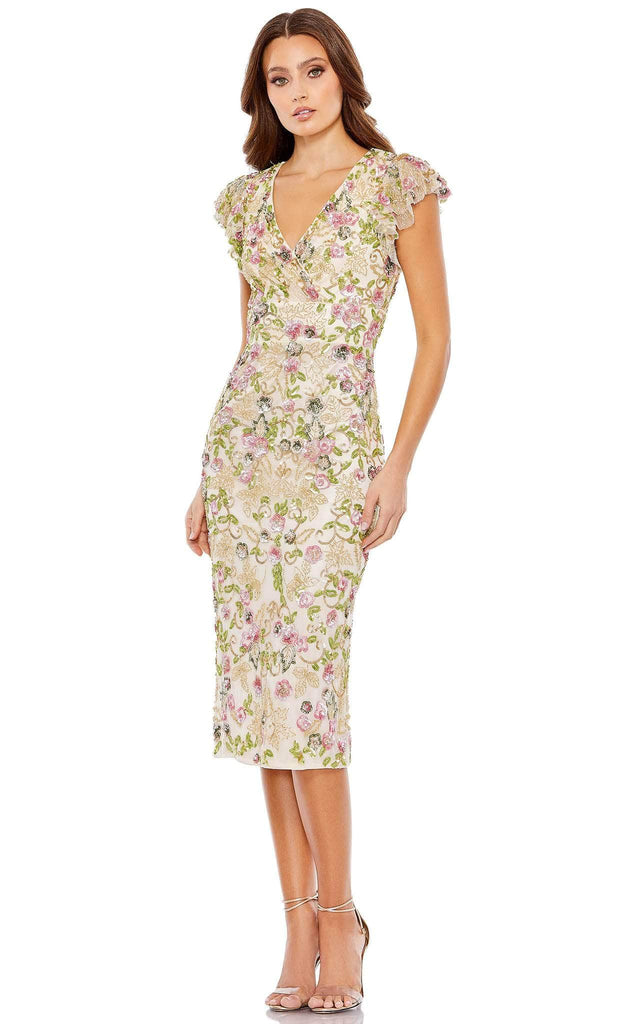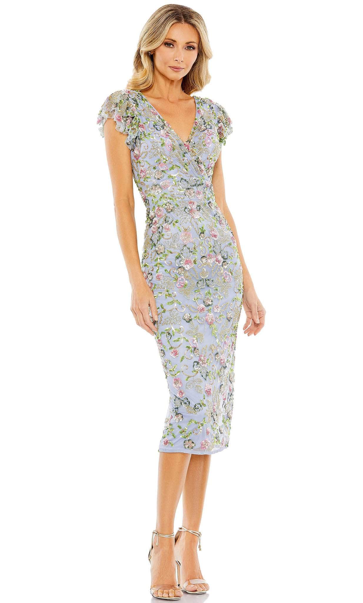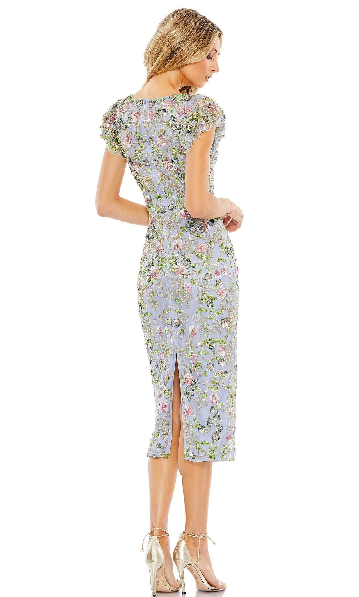 Aspire to float into the room like a breath of fresh air in this lavish Mac Duggal 5722 creation. Intricately detailed with a floral motif beadwork crafting its sculpted length, this dress features a v-neckline with a wrap style bodice and flutter sleeves. Defined with an adorned full back and a zipper closure, this dress parades a nipped waist. Embellished with a back slit, the sheath skirt sculpts into a tea length hemline. Look sexy and utterly chic on your next event in this beautiful Mac Duggal masterpiece. Models are wearing the Cream Multi and Slate Blue Multi colors.