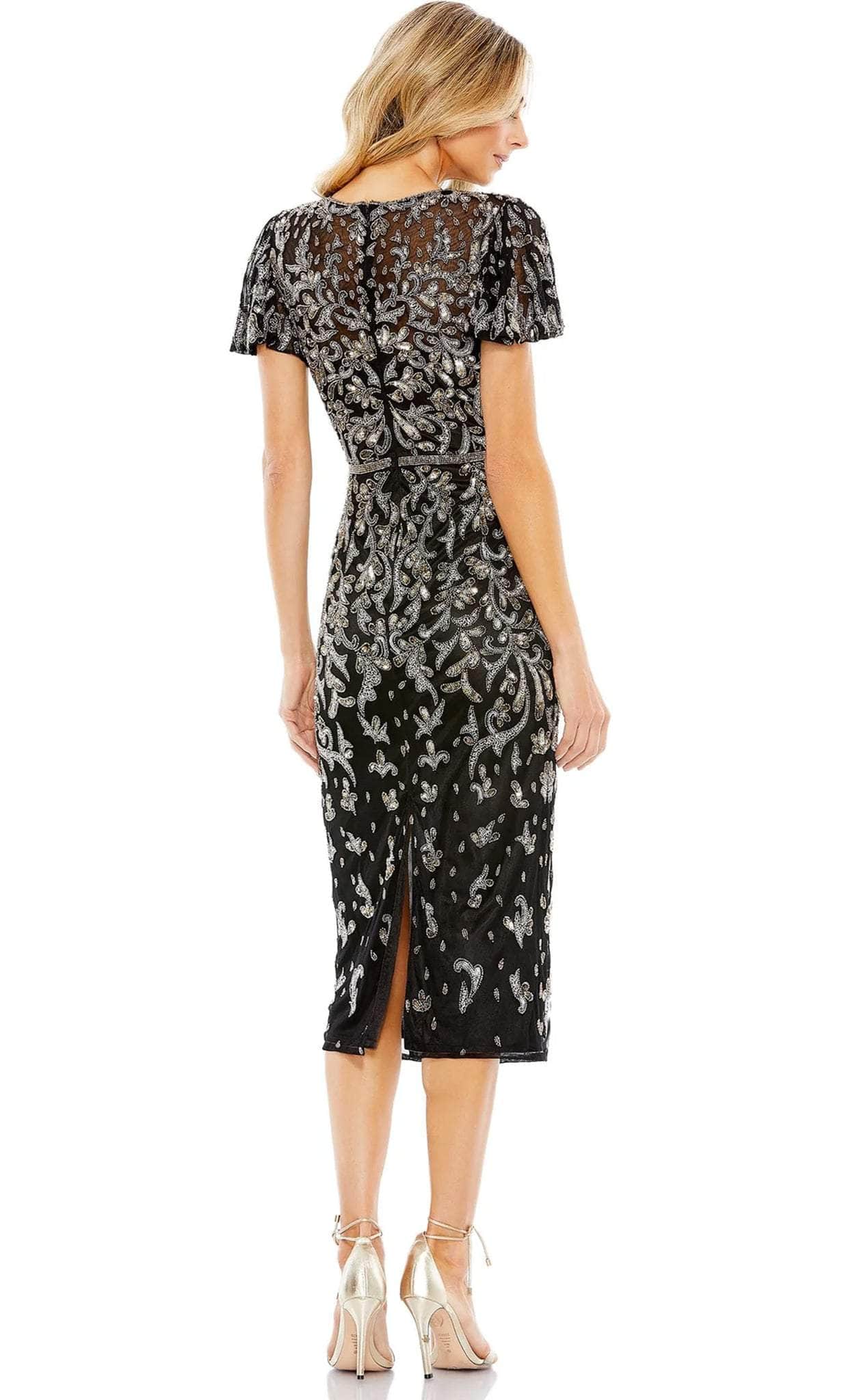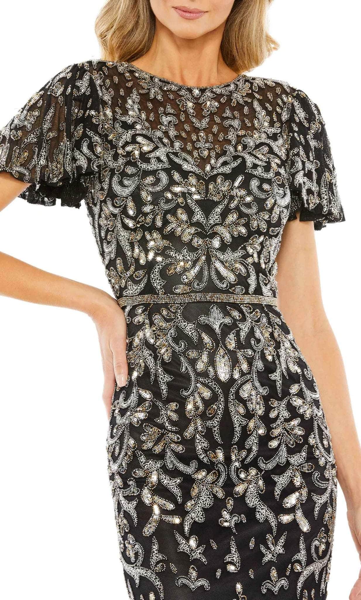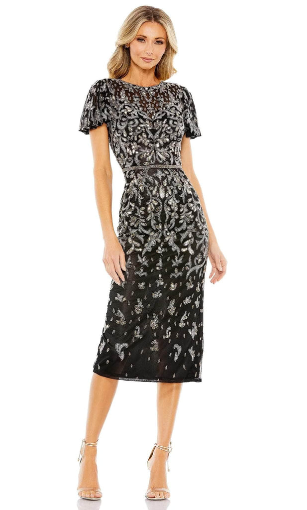Make it your moment to stand out wearing this Mac Duggal 5727 masterpiece. This stylishly-crafted dress is intricately adorned with sparkling beadwork from the top to bottom. It features an illusion bodice framed with a jewel neckline, short flutter sleeves, and a fully closed back. A thin beaded waistband cinched the waist, giving it a slimmer appearance. The skirt descends in a tea length sheath silhouette with an alluring center back slit. This Mac Duggal 5727 dress is specially designed to make that special occasion worth reminiscing. Model is wearing the Black Multi color.