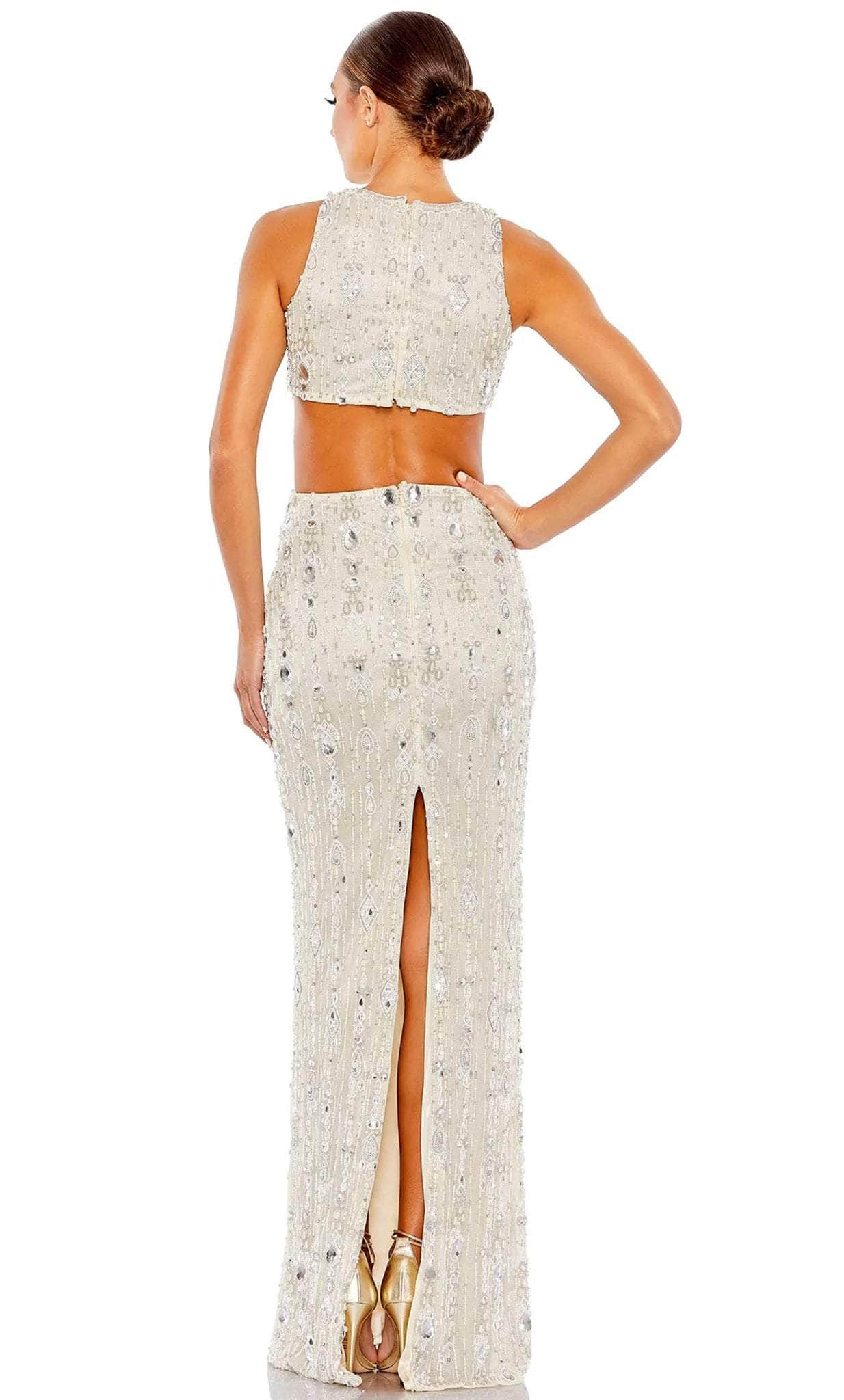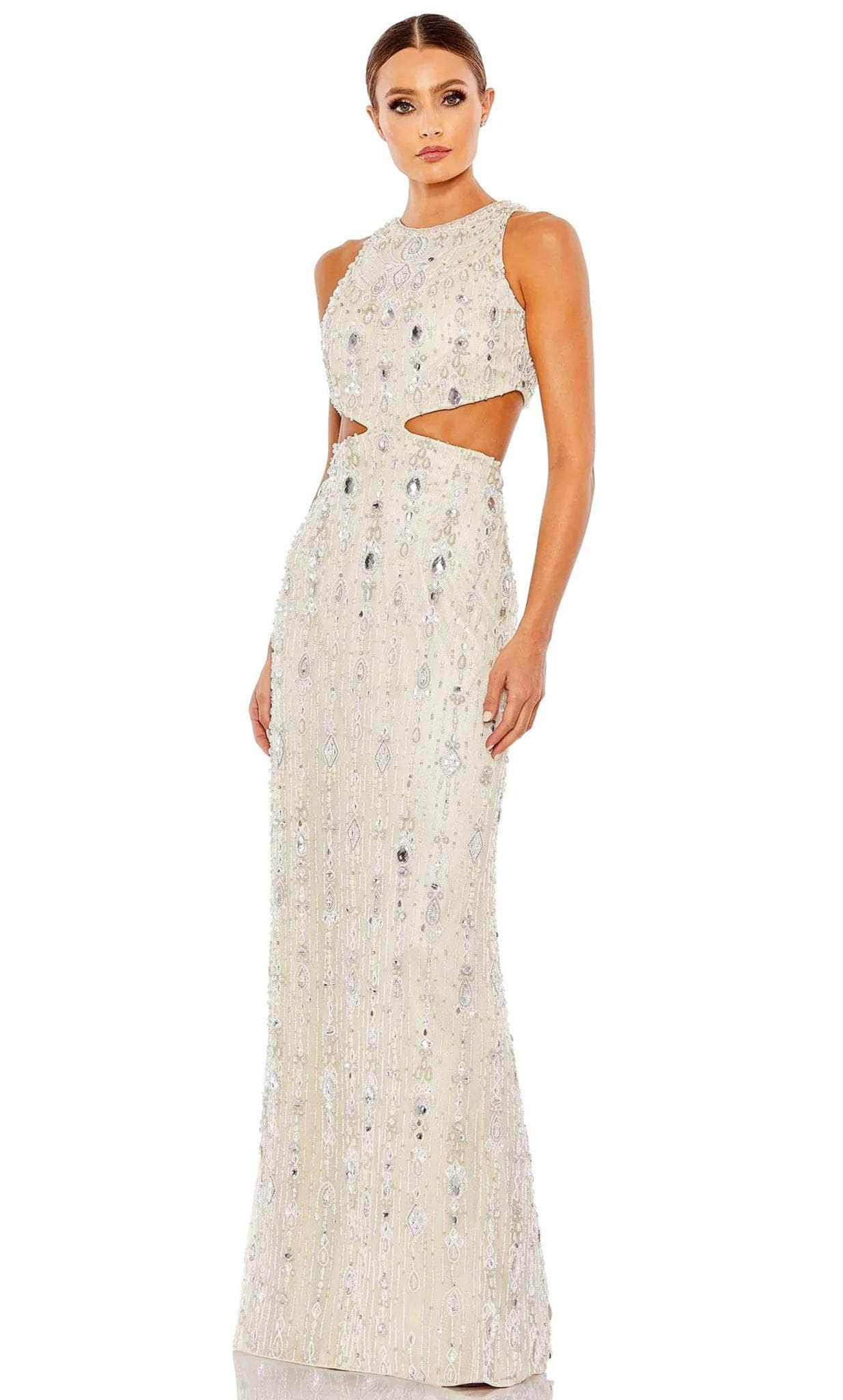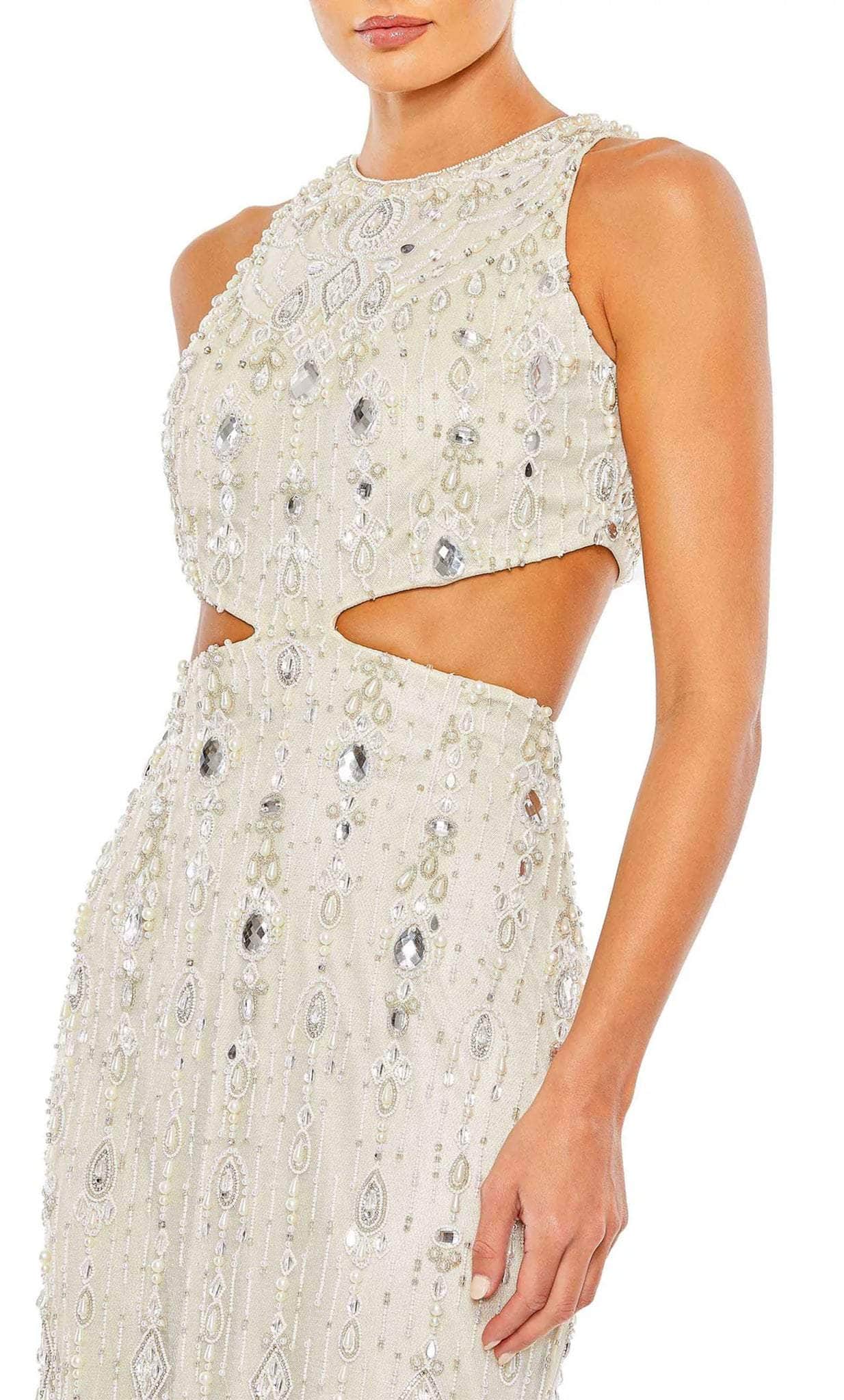 Show off your classy style when you wear this finely-detailed Mac Duggal 5740. This dress is really tailored-fit to flatter your figure with its mesh overlay, hand embellished with pearls and beads, that fully lines your body. This floor-length dress is also complemented with side and back cutouts, sleeveless bodice, and high jewel neckline for it to be both comfy and fashionable. For added comfort, this gown is also sewn with back vent and concealed back zipper for closure. This stunning Mac Duggal 5740 definitely flatters from every angle. Model is wearing Nude Silver color.