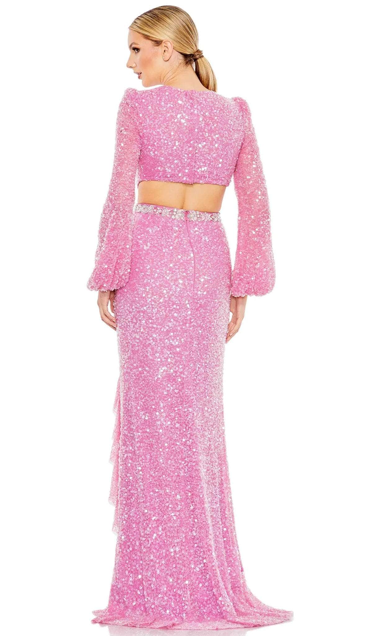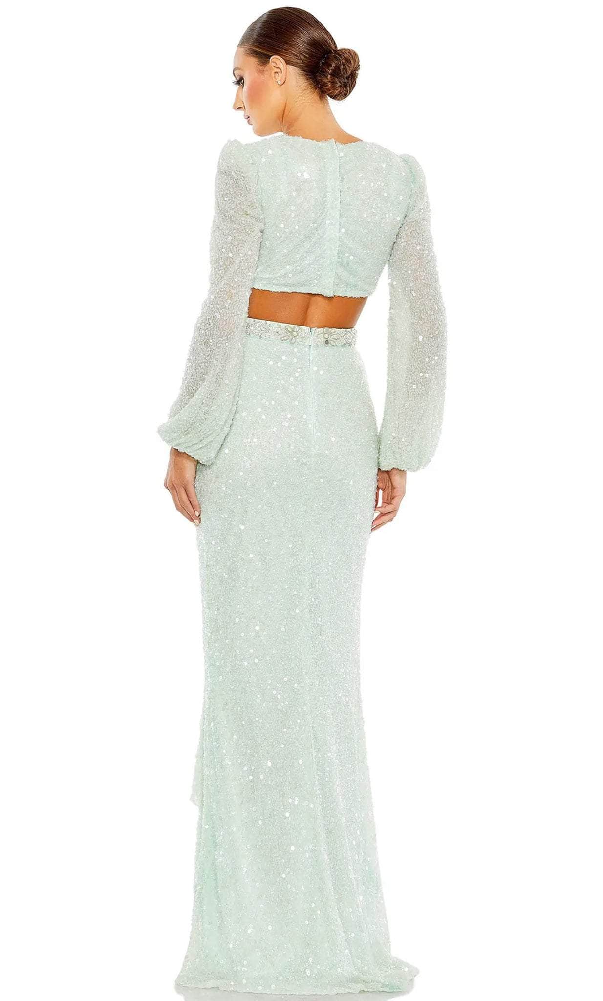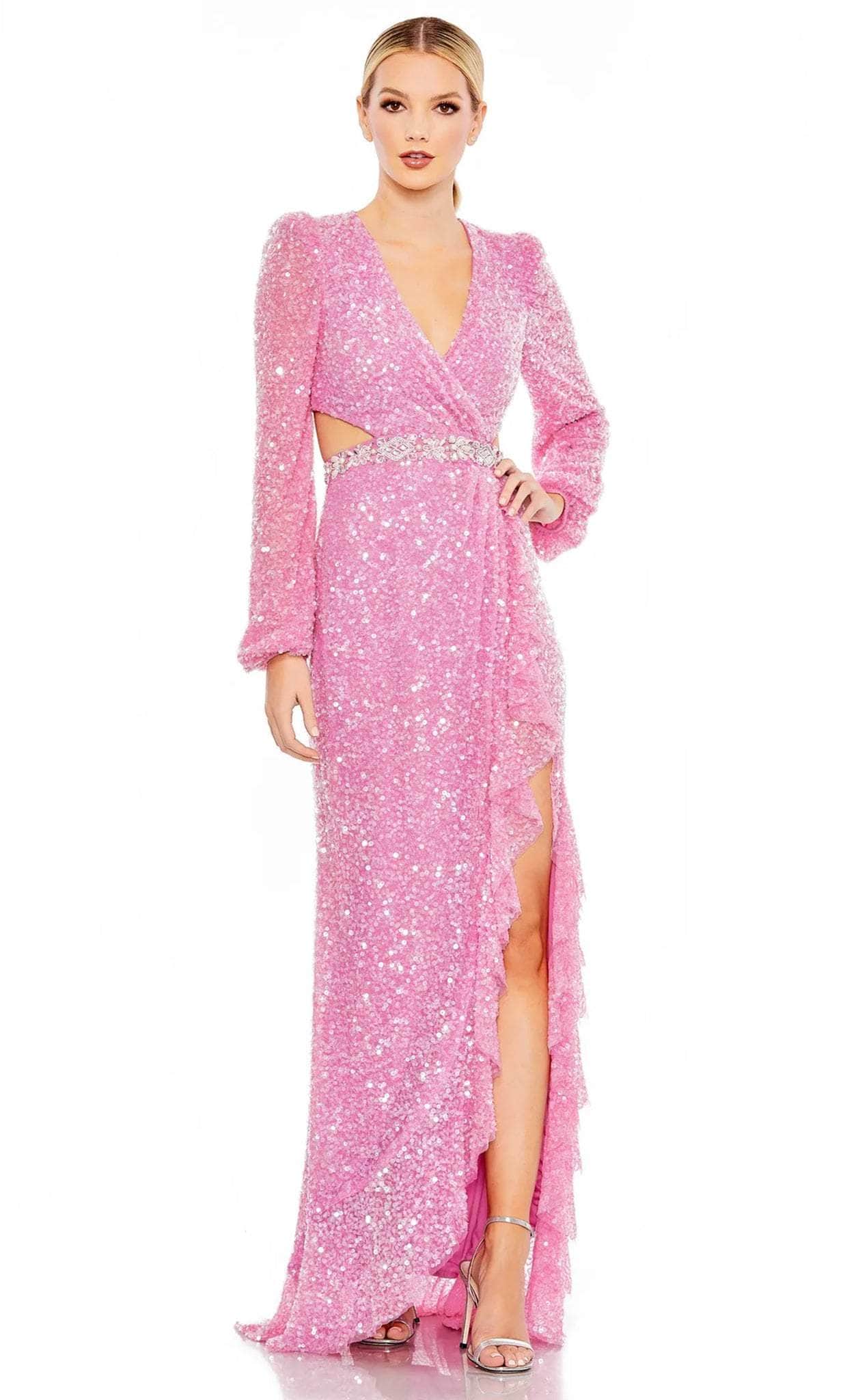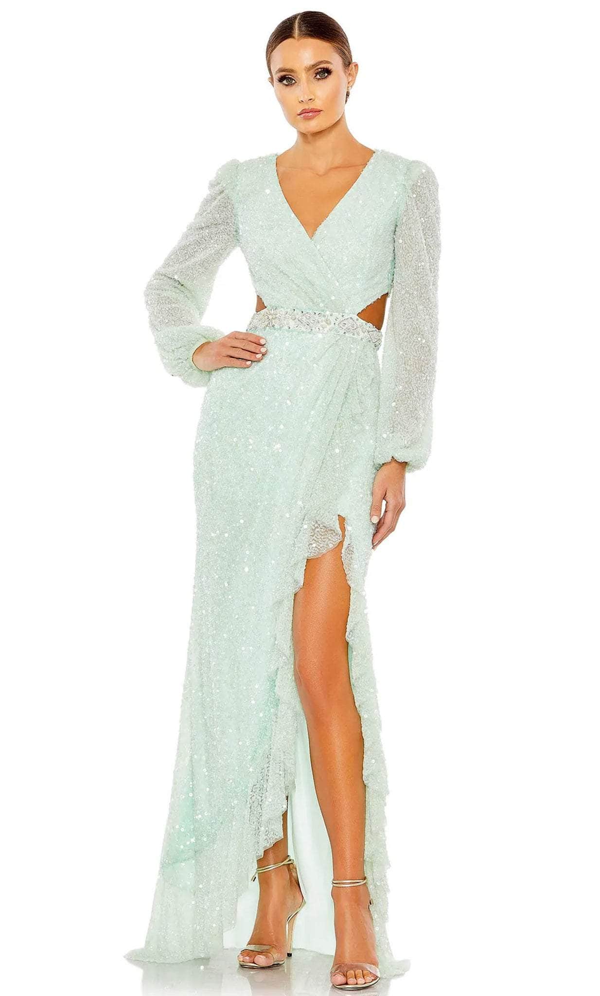 Walk in glamour and let all heads turn on you in this creation by Mac Duggal 5745. This ravishing gown is entirely adorned with radiant sequins and has crystal beadwork on the wide waistband. It offers a surplice v-neckline, a long bishop sleeve with puffed detail and has closed back. The side cutout at the midriff that extends to the back adds an enticing look to this piece. Revealing a cascading ruffle and slit, the high-low skirt carves a sheath silhouette and ends in a sweep train. Leave everyone speechless when you enter the room in this Mac Duggal 5745 masterpiece. Models are wearing the Lilac, Orchid and Soft Mint colors.