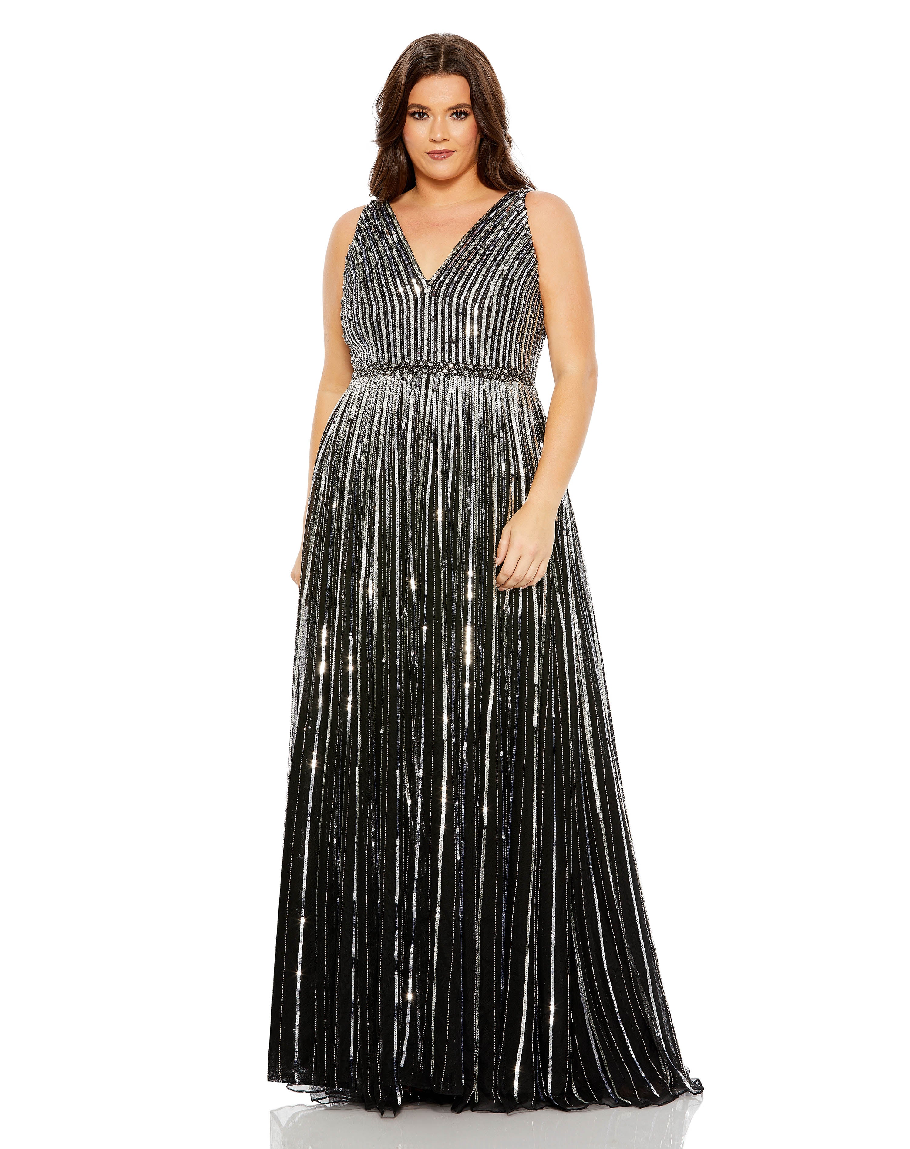 Up your fashion game with this show-stopping Mac Duggal 5755 dress. Our exquisite dress is tailored from intricately embellished mesh fabric. The fully lined body ensures a comfortable fit, while the V-neckline and sleeveless design exude timeless elegance. The contrasting sequin stripe detail adds a touch of glamour to the dress. The concealed back zipper ensures a sleek finish, while the train and A-line silhouette offer a graceful movement. The dress is complete with a beautifully beaded waistband, adding a touch of sparkle to this sophisticated piece. Shine at your next formal occasion with this stunning Mac Duggal 5755. Model is wearing the Apricot, and Black Silver colors.