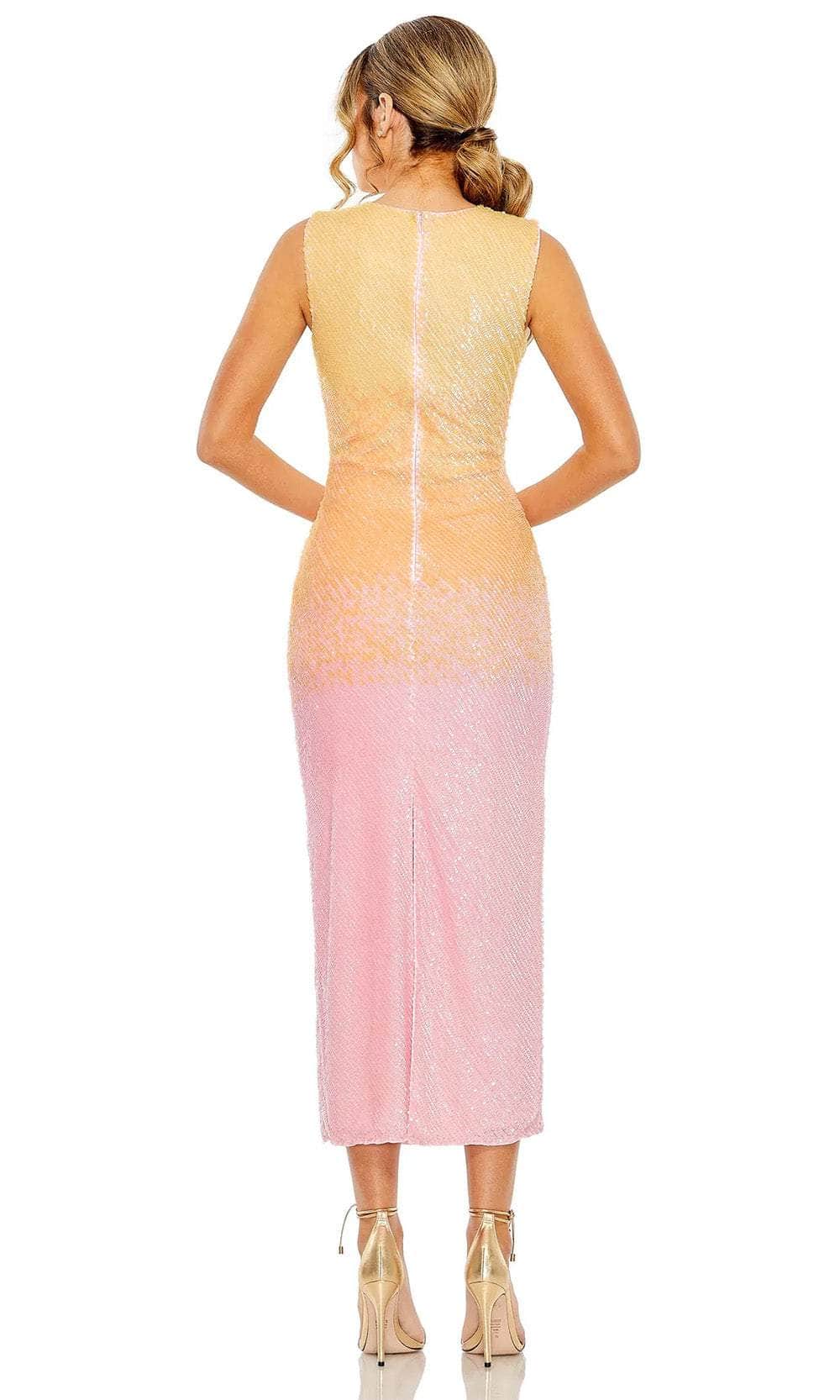 Radiate timeless elegance in Mac Duggal 5772, meticulously crafted from sequined crepe fabric. The sleeveless fitted bodice boasts a regal high neckline, exuding sophistication. With a fully enclosed back and concealed center zipper closure, it ensures a secure fit. Below, the tea-length skirt drapes gracefully in a sheath silhouette, epitomizing chic refinement. Make a statement of grace and poise in Mac Duggal 5772, a masterpiece of understated glamour and sophistication. Model is wearing Sunset color.