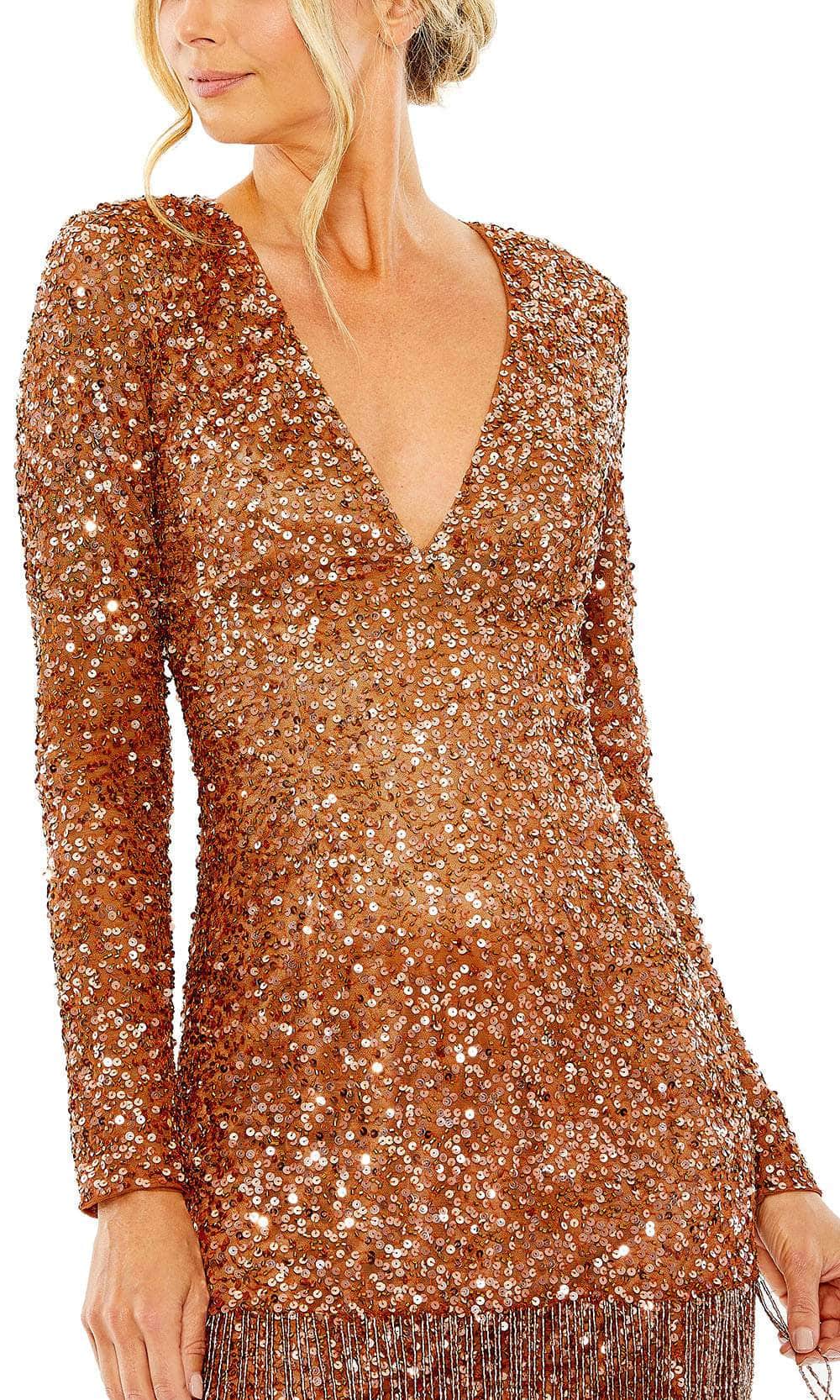 Make a glamorous statement in Mac Duggal 5928, a V-neck long-sleeve dress designed to captivate. Crafted from sequin fabric, the dress showcases intricate fringe details, adding a playful and chic element. The fitted bodice ensures a flattering silhouette, while the concealed back zipper provides a seamless fit. The full back design exudes sophistication, making Mac Duggal 5928 the perfect choice for those seeking a blend of elegance and modern flair for special occasions and glamorous events. Model is wearing Copper color.