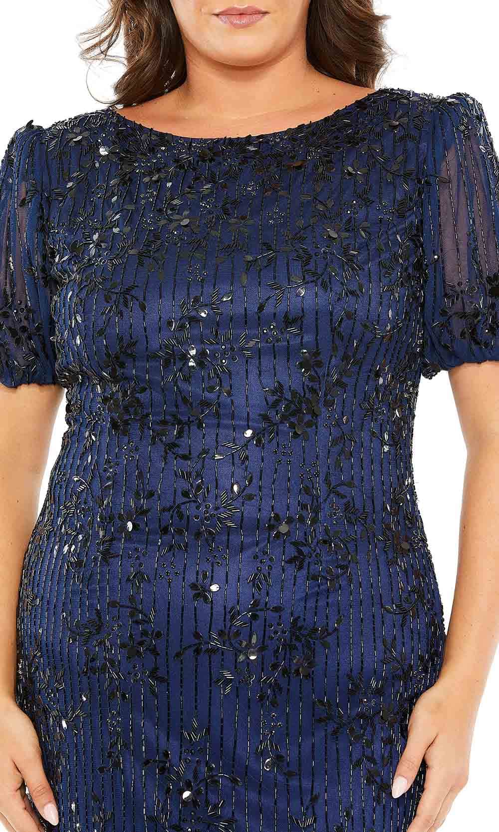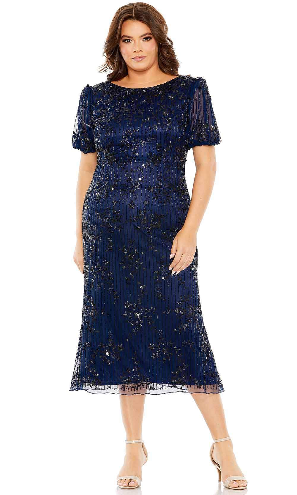 Grace in the ethereal beauty of this Mac Duggal 5940 masterpiece. Embellished with a delicate leaf motif, this ensemble exudes enchantment and sophistication. The bateau neckline frames your collarbones with a touch of timeless elegance. Short puff sleeves add a whimsical touch, reminiscent of a fairytale. The full-back ensures an elegant look from all angles, while a concealed back zipper guarantees a seamless fit. The tea-length skirt parades in a graceful column silhouette, allowing you to move with grace and charm. Embrace the magic of nature in this Mac Duggal 5940 masterpiece. Model is wearing Midnight color.