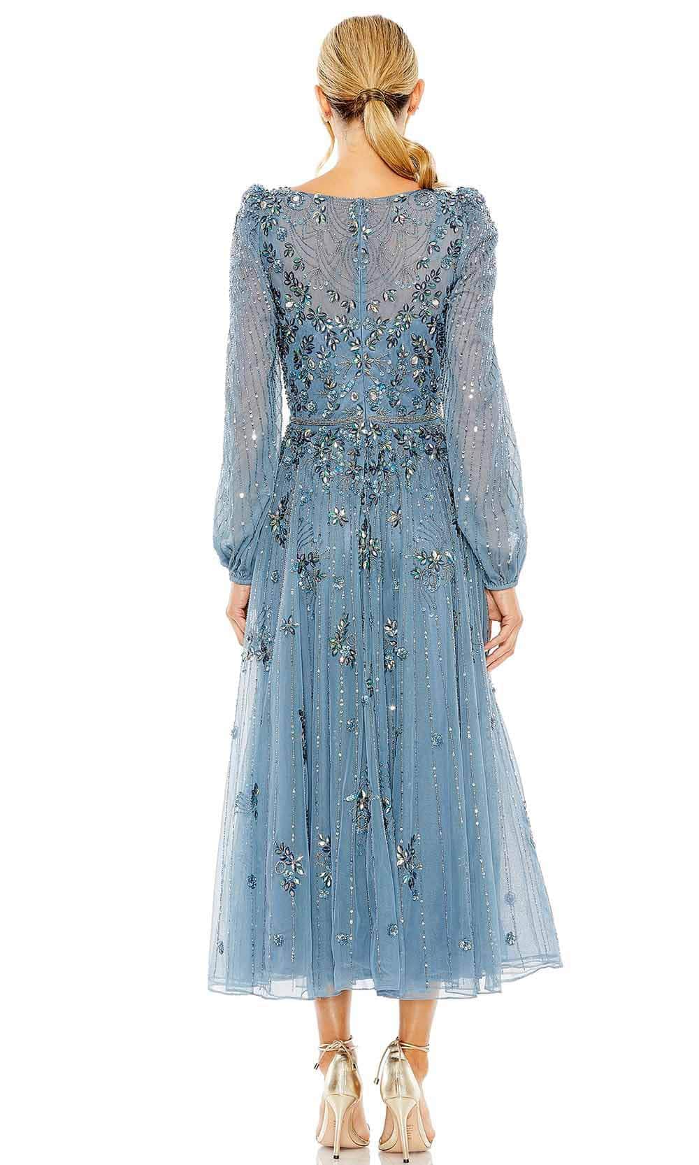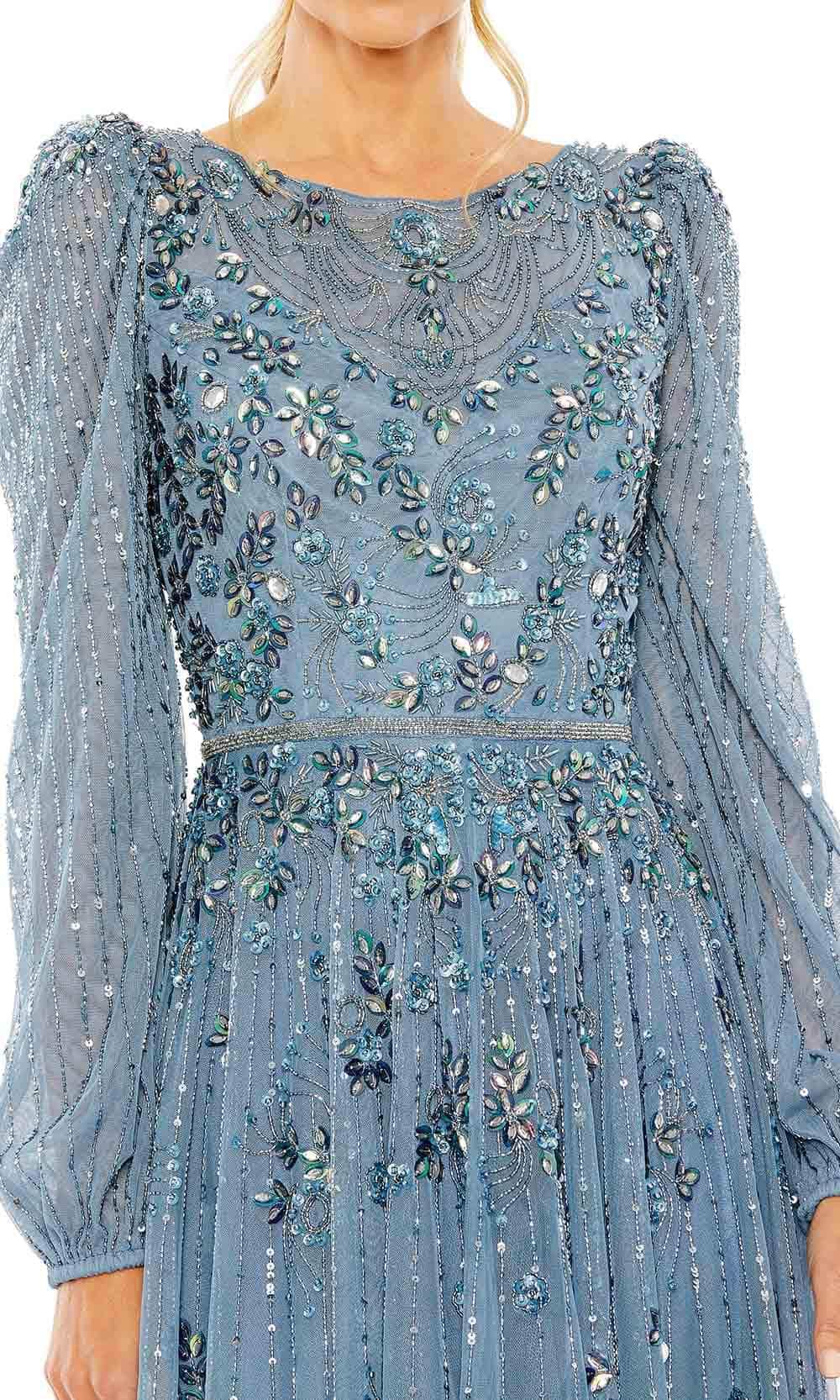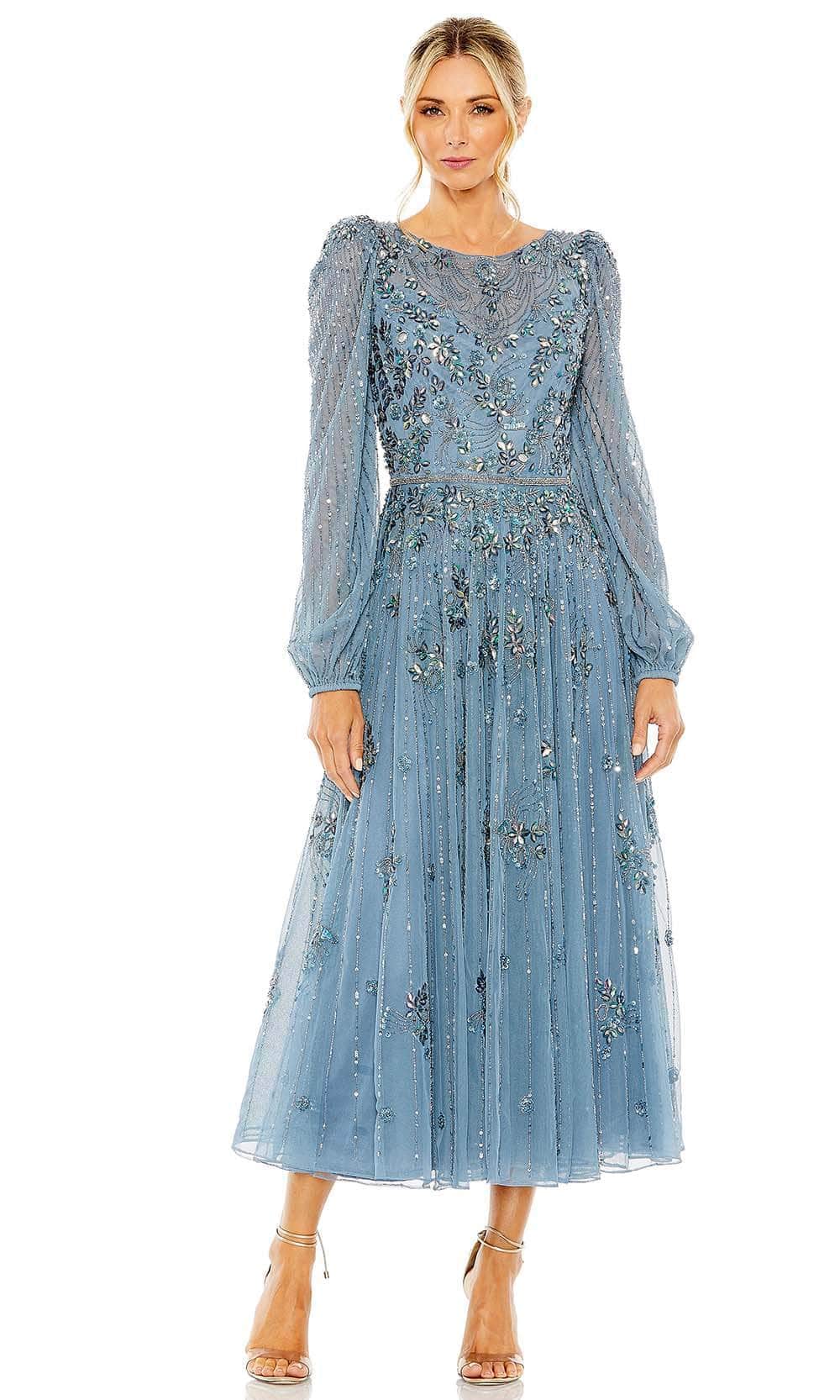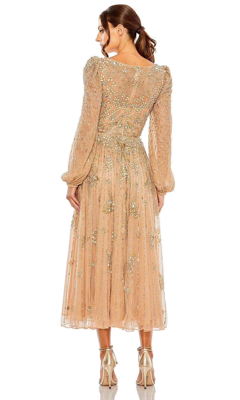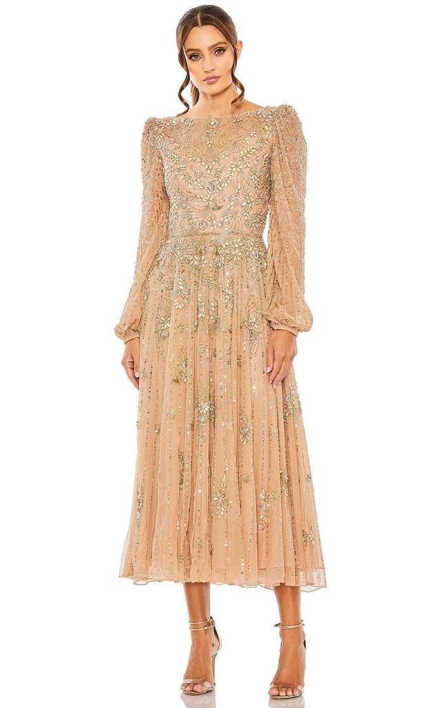 Bound to steal the spotlight in this winning creation by Mac Duggal 5990. This alluring dress is adorned with intricate patterns of beads and sequins. The illusion top displays a bateau neckline, long puff sleeves, and a partial illusion back. With its flattering beaded thin waistband, the pleated skirt flares out in an exquisite tea-length A-line silhouette. This Mac Duggal 5990 cocktail dress will let you celebrate that divine feminine beauty! Model is wearing the Taupe color.