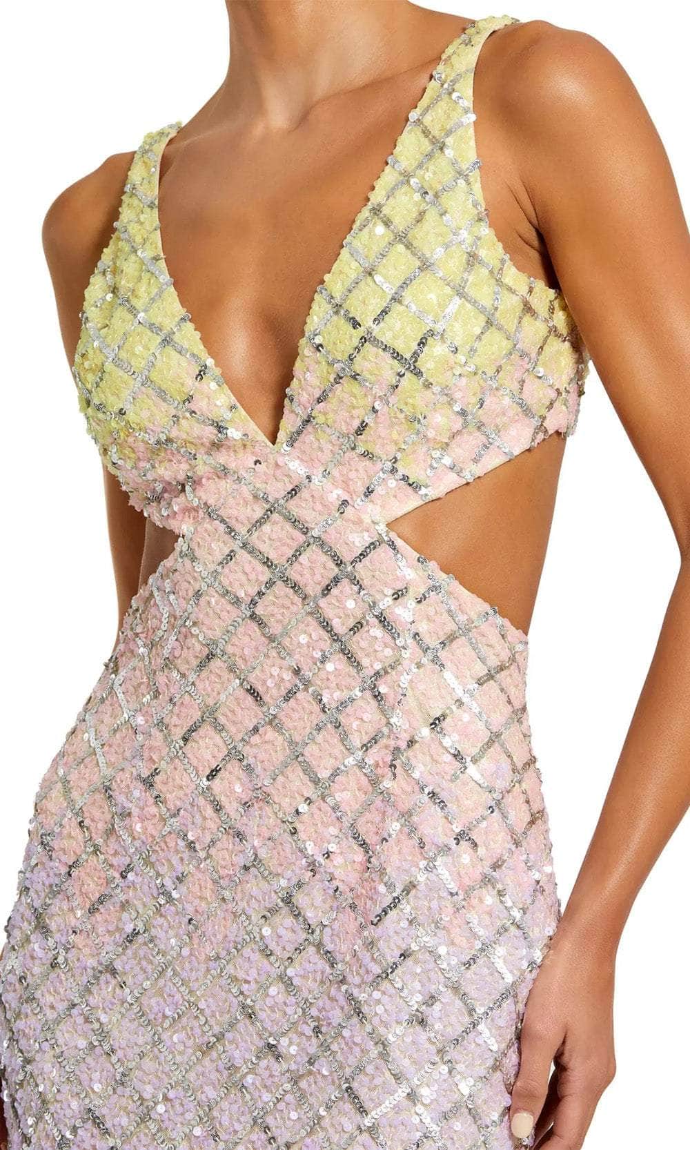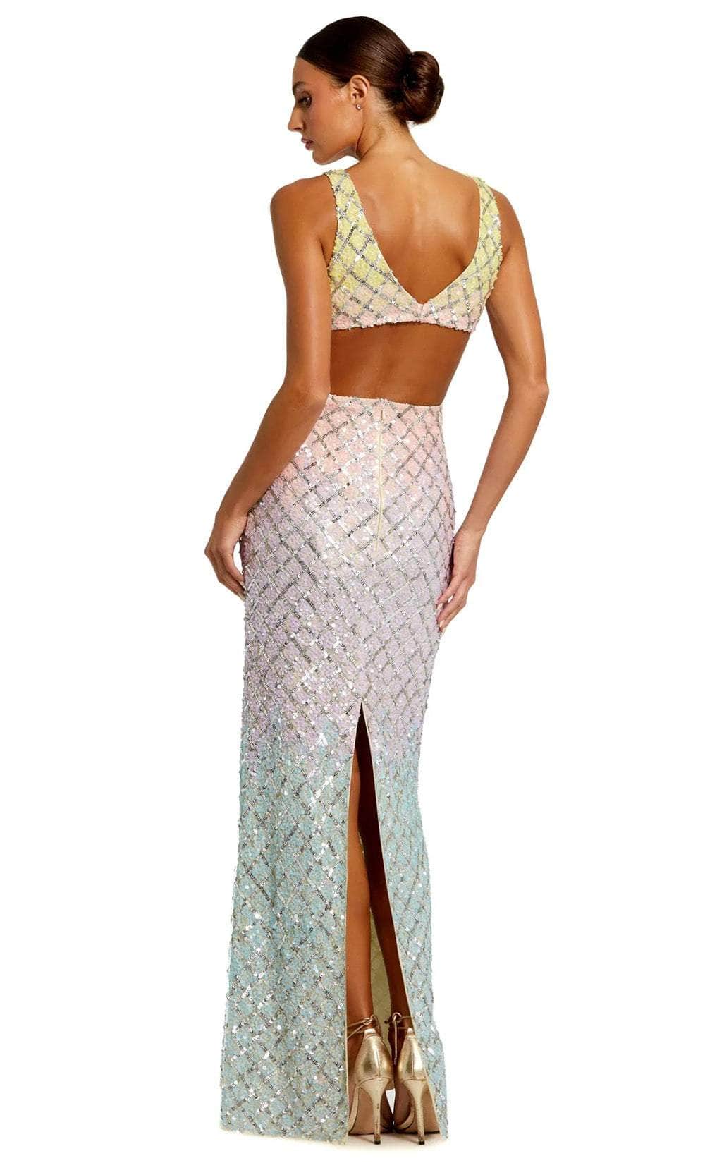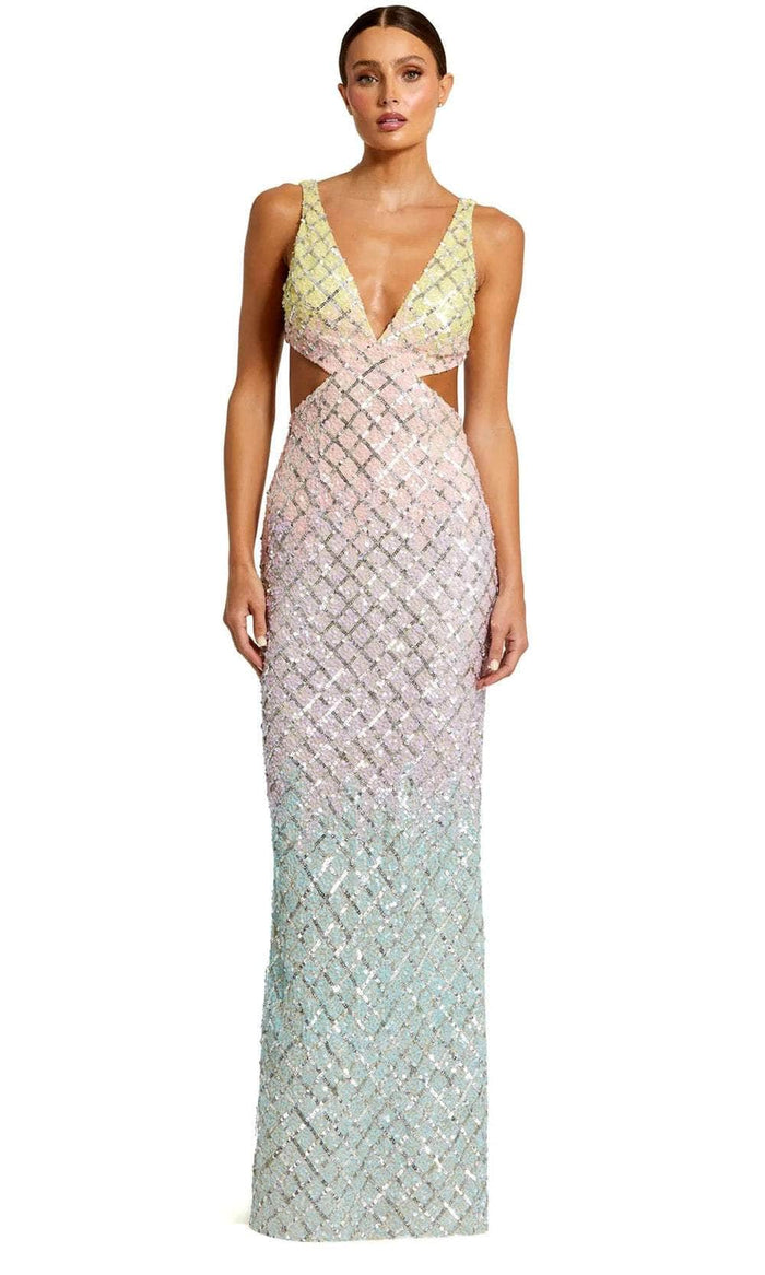 Step into elegance with Mac Duggal 6049, a breathtaking masterpiece crafted from embellished mesh overlay fabric. Its sleeveless bodice boasts intricate detailing, complemented by sultry side and back cut-outs. The deep V-neckline exudes allure, while a center zipper ensures a flawless fit. The floor-length skirt, adorned with an irresistible slit at the back, flows gracefully in a column silhouette, promising a captivating entrance and an unforgettable evening for Mac Duggal 6049. Model is wearing Rainbow color.