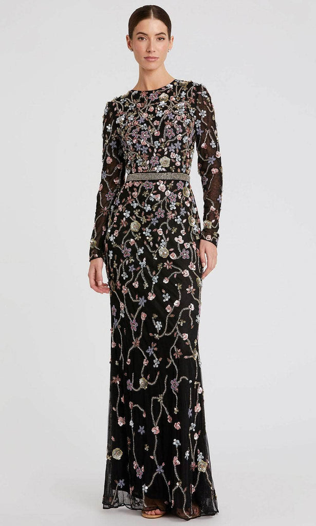 Command attention in the Mac Duggal 6135 dress, a stunning creation adorned with vibrant multi-colored sequins arranged in a captivating floral pattern. This fabulous dress features long sleeves and a full back, secured with a center zipper closure for a flawless fit. The floor-length skirt flows gracefully in a column silhouette, exuding elegance and sophistication. Perfect for formal events or special occasions, the Mac Duggal 6135 dress promises to captivate with its intricate detailing and timeless allure. Model is wearing Black Muti color.