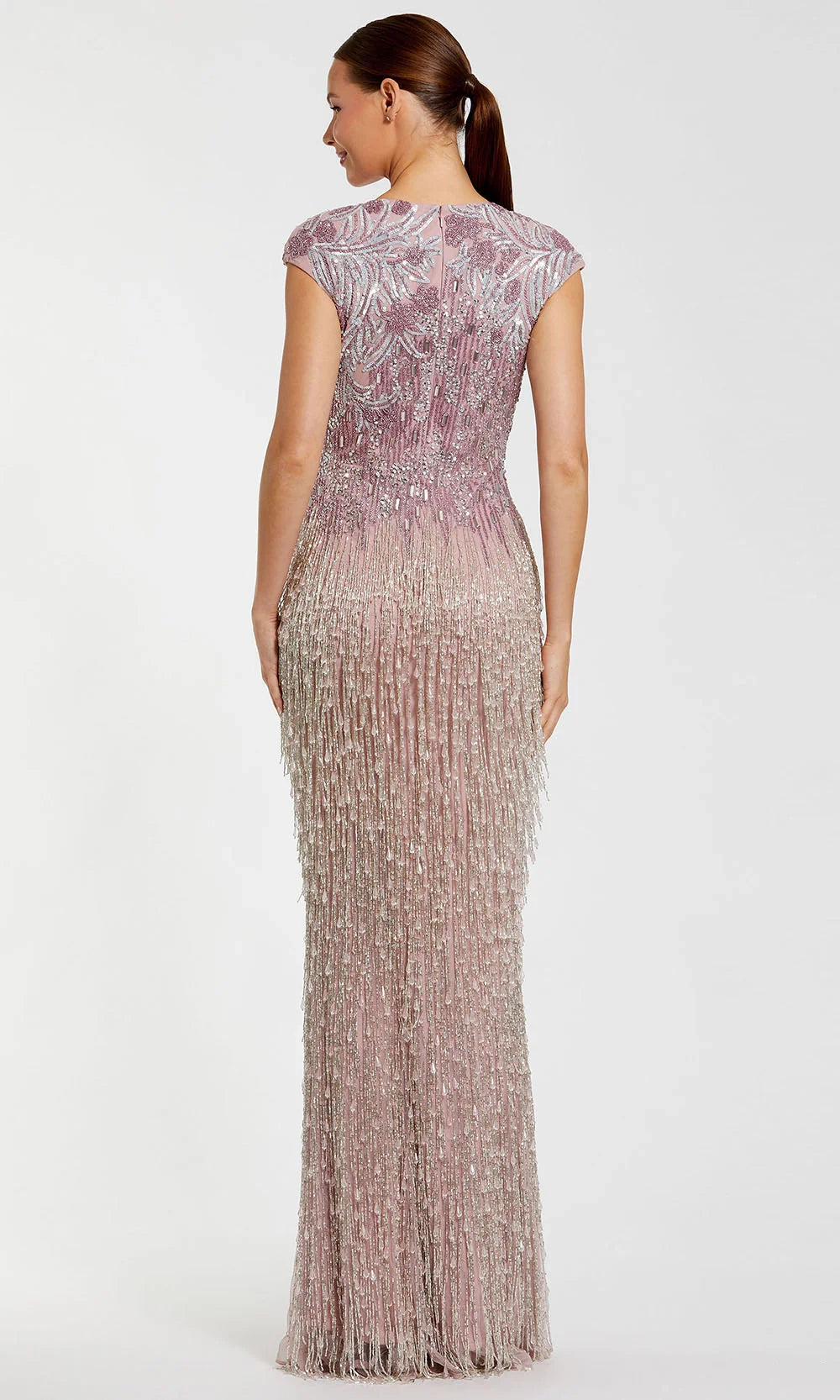 Command attention with every step in a Mac Duggal 6169 gown crafted for movement and radiant style. It captivates with its detailed beading across the bodice, transitioning into shimmering fringe that flows gracefully to the floor. Cap sleeves and a jewel neckline lend a sophisticated touch, while the fitted sheath silhouette enhances the natural form. Mac Duggal 6169 style is your ideal companion for formal evenings that require refined design, intricate detailing, and show-stopping beauty from every angle. Model is wearing Vintage Lilac color.