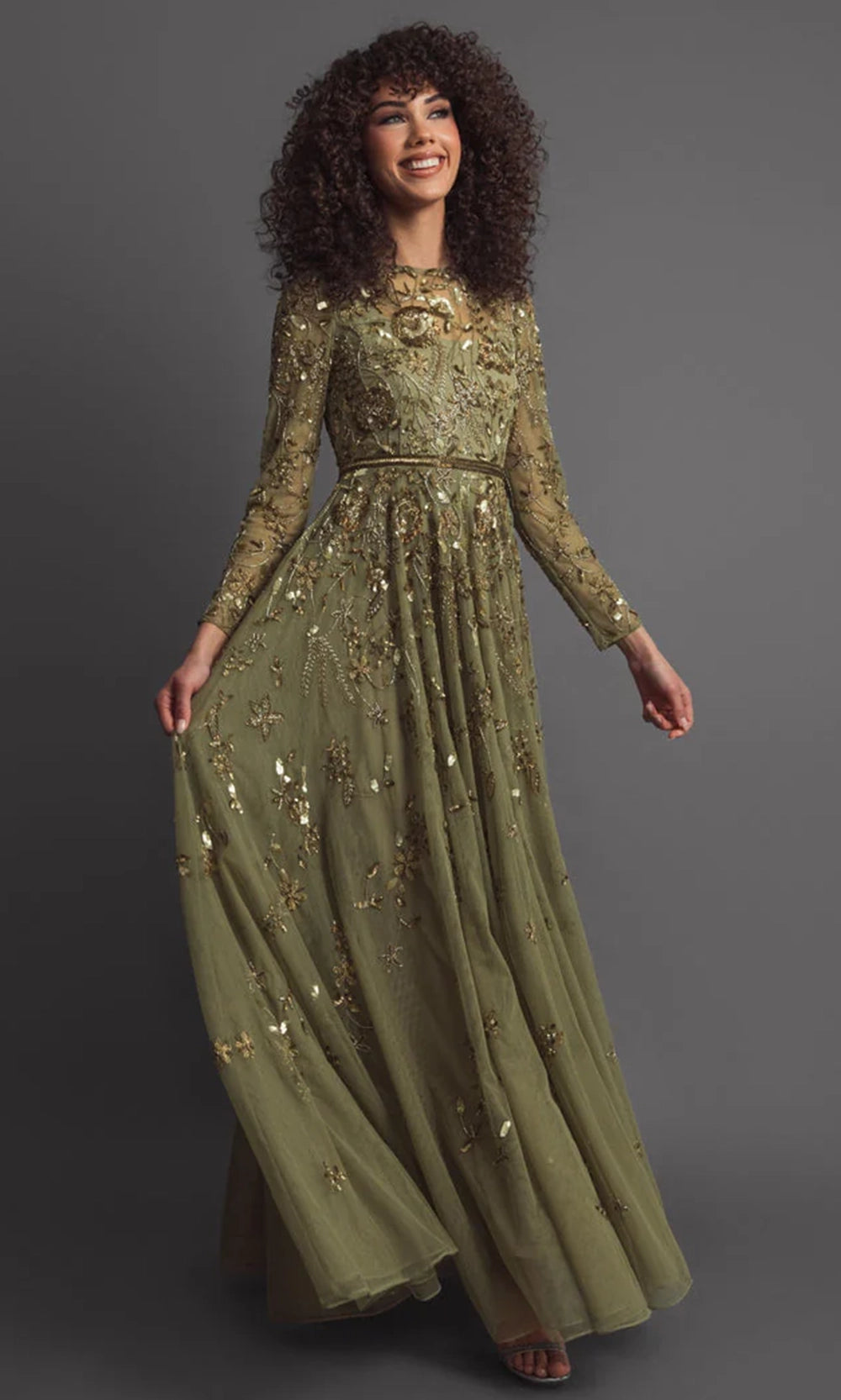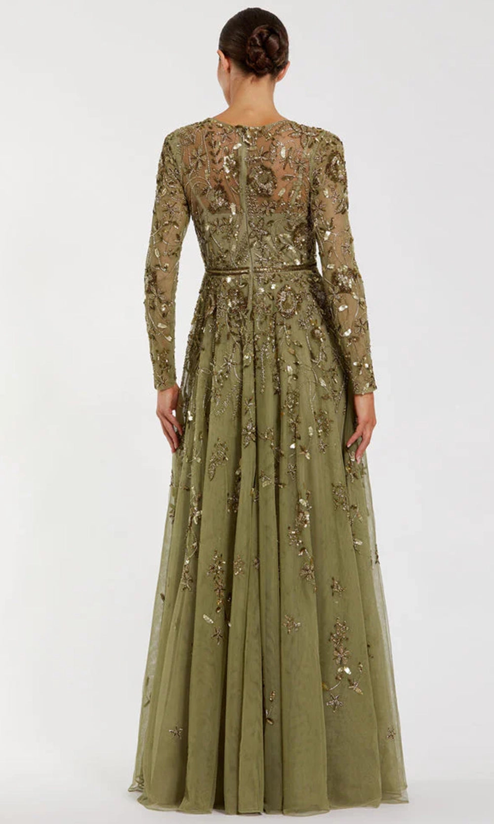 The dreamlike beauty of Mac Duggal 6182 shines through its mesh fabric, gently adorned with intricate floral beading. The illusion jewel neckline and sheer long sleeves create a graceful, seamless silhouette from shoulders to hem. Sequins and beadwork are embroidered across the bodice and skirt, glistening under the light to reveal subtle floral patterns. The natural waist cinches gently before cascading into a layered A-line skirt that brings graceful movement and airiness to the ensemble. Whether for a gala, evening wedding, or red carpet, Mac Duggal 6182 combines poetic detail and timeless elegance in one refined gown. Model is wearing Green color.