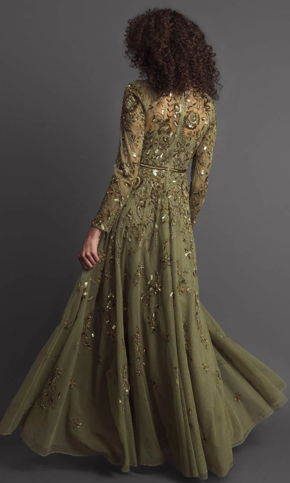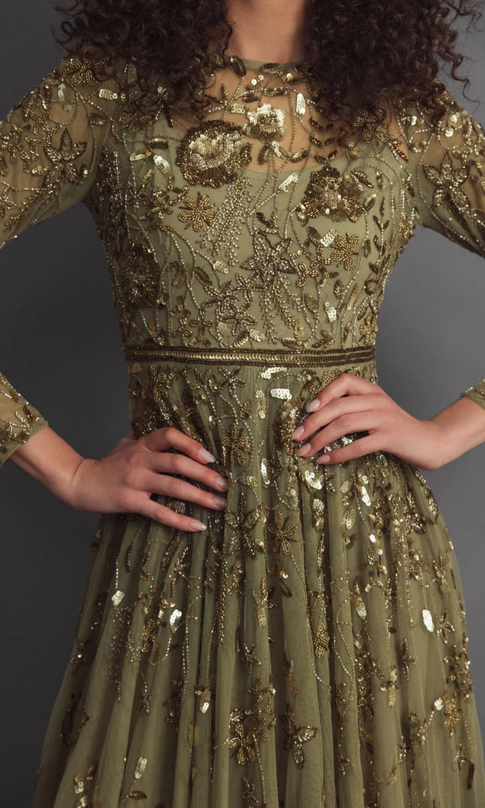 | Details: | Long Sleeves, Beaded, Sequin, Thin Waistband, Partial Illusion Back, Floor Length |