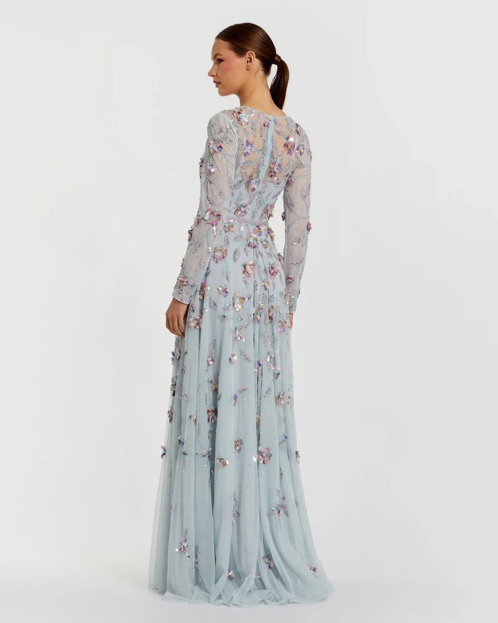 Intricate floral motifs bloom across this Mac Duggal 6183 breathtaking evening gown, where elegance and delicacy meet. This style features a sheer bodice with long sleeves and jewel neckline that offers both coverage and allure. The natural waist is accentuated by a thin belt, flowing into a softly layered A-line skirt that moves effortlessly. Shimmering floral details crafted from sequins and beads enhance the mesh layer, giving the gown texture and visual richness. Whether worn for a formal celebration or upscale gathering, Mac Duggal 6183 offers graceful presence and detailed sophistication. Models are wearing Midnight Multi and Seafoam Multi colors.