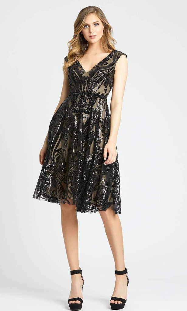Be a woman of style and beauty in this classy creation from Mac Duggal Cocktail 67514. The whole dress is designed in shimmering sequins as the bodice features a V neckline and cap sleeves. A beaded waistband circles around the midriff while the full back is secured with a center zipper closure. The skirt showcases an A-line silhouette which cascades to tea length hemline with sheer overlay. This Mac Duggal design is sure to be both comfy and fashionable.